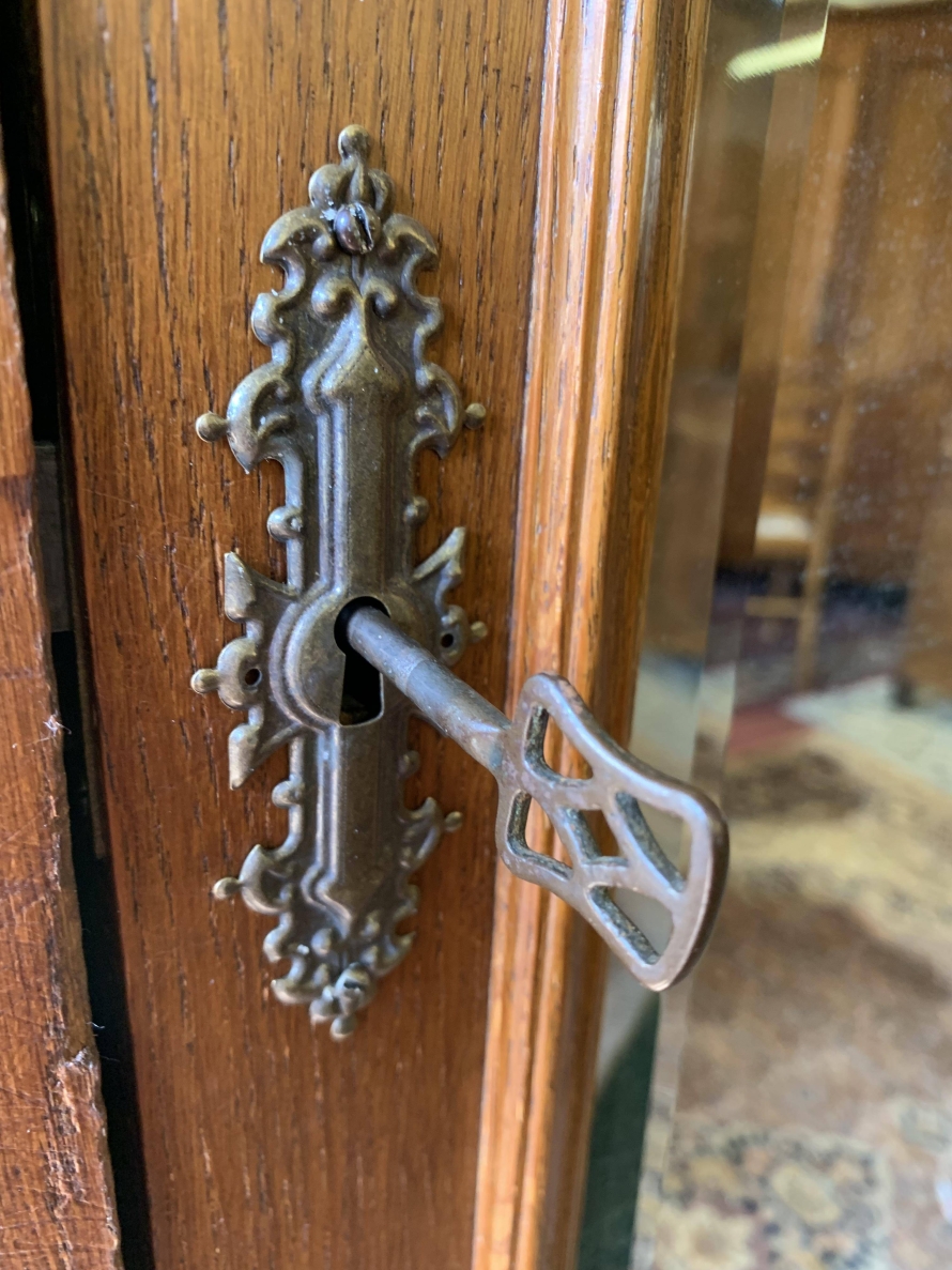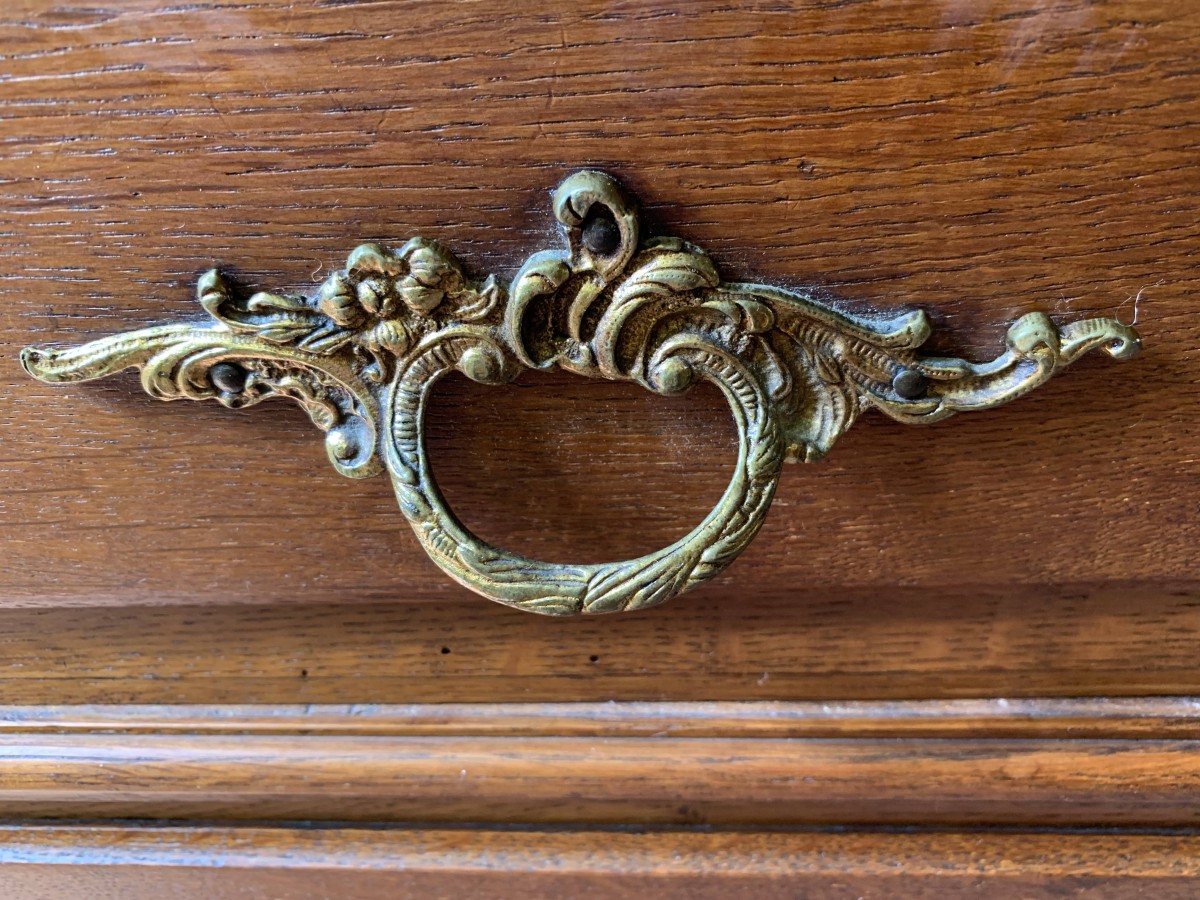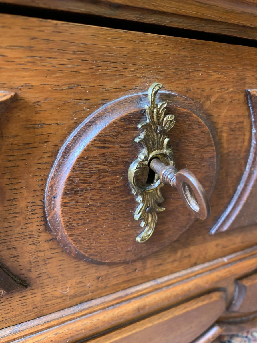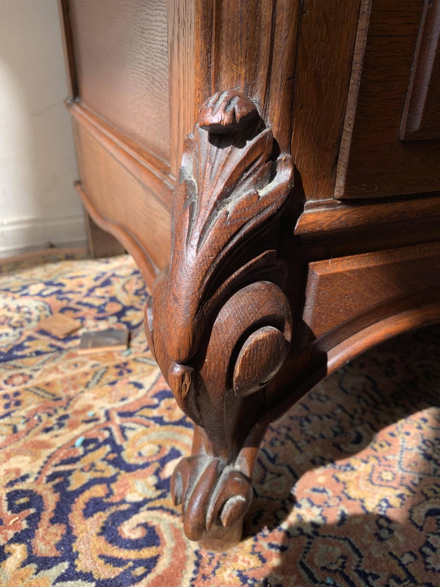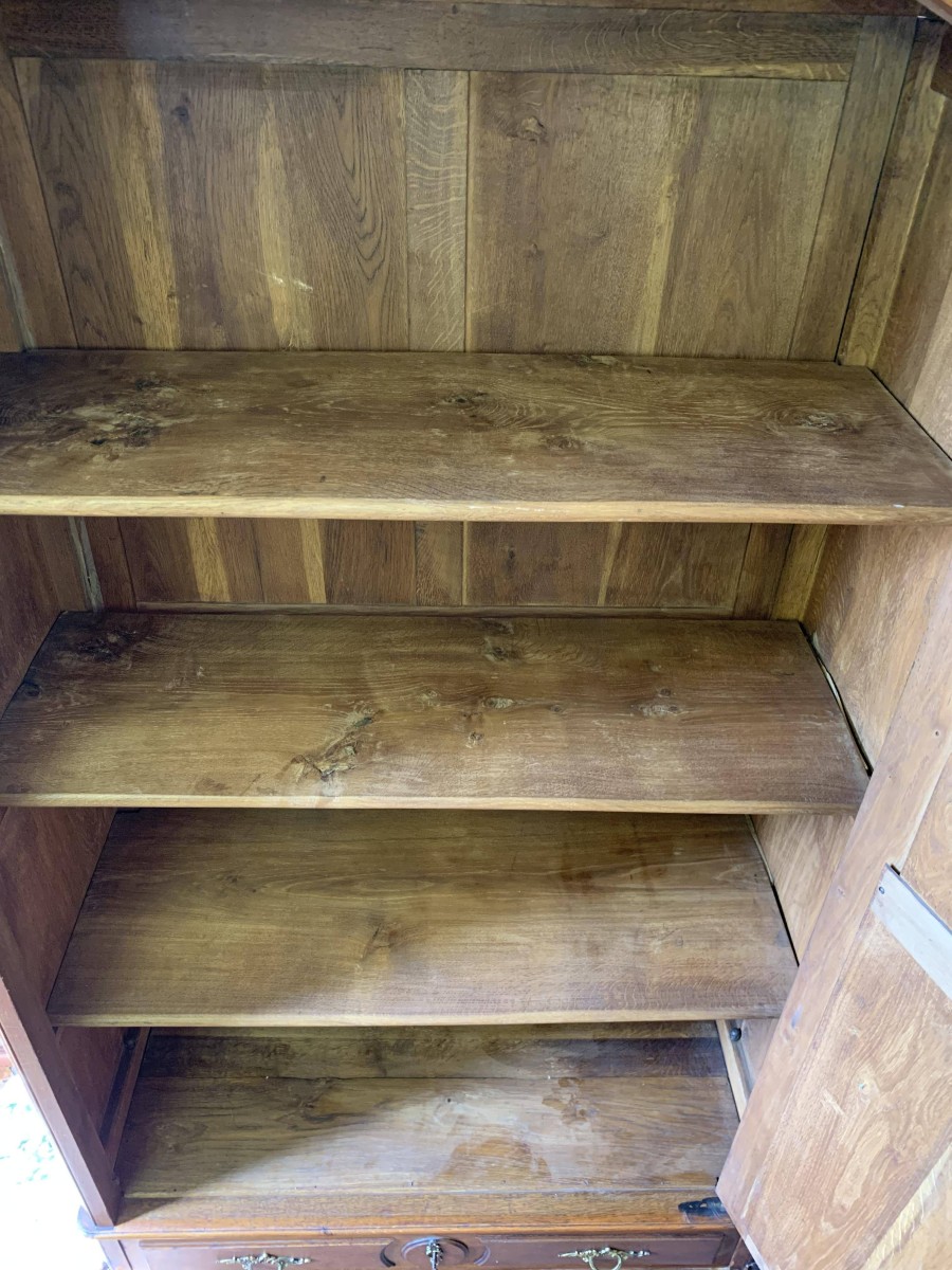 This fabulous armoire dates circa 1890. The shaped oversailing top rises to an impressive central carving. Below is a shaped full length bevel edged mirrored lockable door. The door opens to reveal three removable shelves. Below the door is a lockable drawer, the drawer having a pair of ornate brass handles. Recessed panelled sides, shaped skirt this fantastic French antique armoire stands on two carved cabriole legs to the front . Please note this item splits down for easy transportation and delivery into any home.