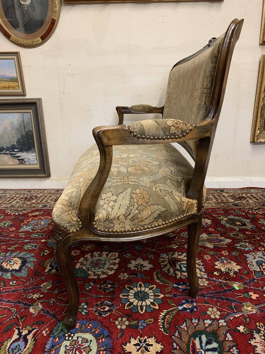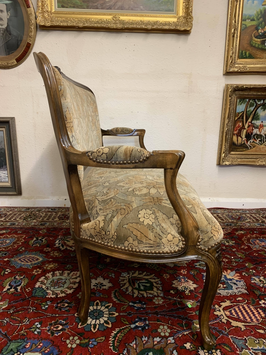 This fabulous antique French salon sofa has a shaped upholstered back, shaped carved arms with upholstered armrests, an upholstered cushioned seat and stands on four carved cabriole shaped legs.