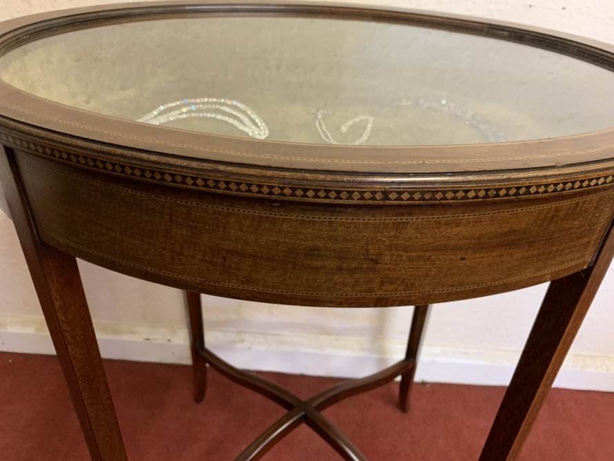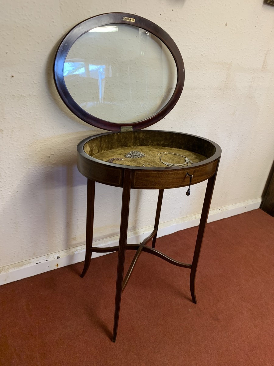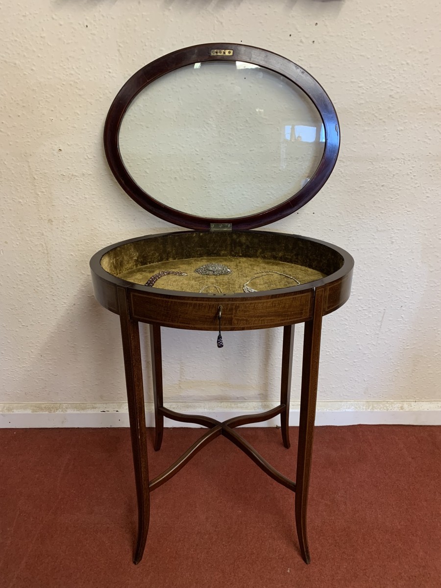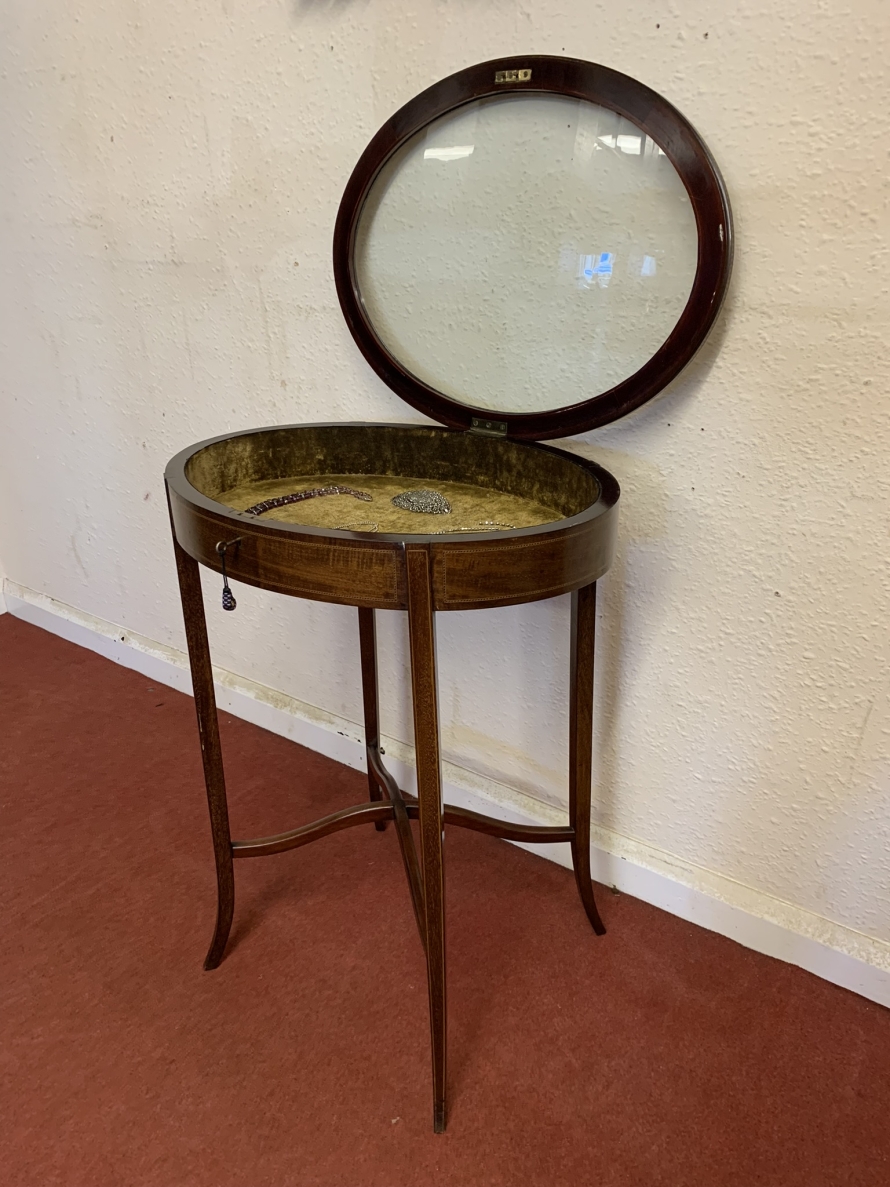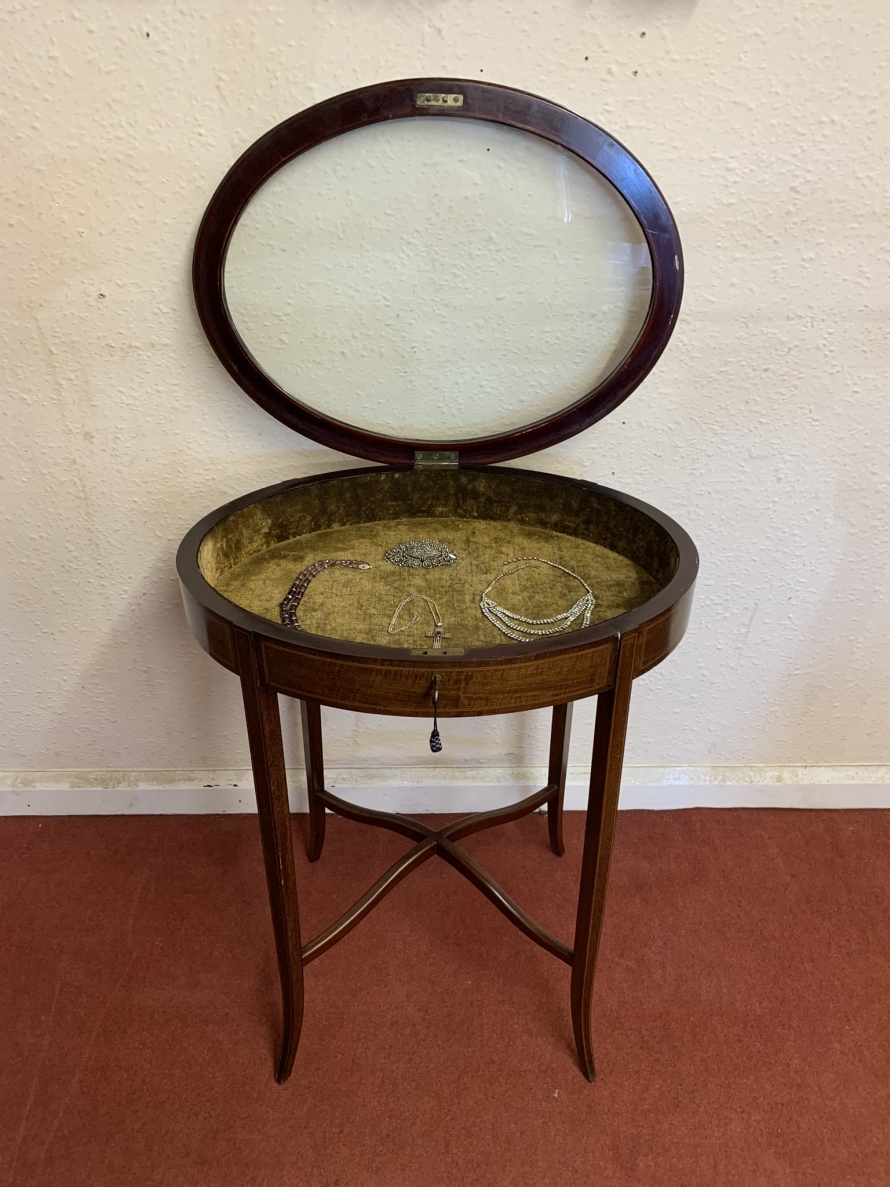 - Elegant Antique Oval Inlaid Mahogany Glass Topped Bijouterie Display Case – Now Sold