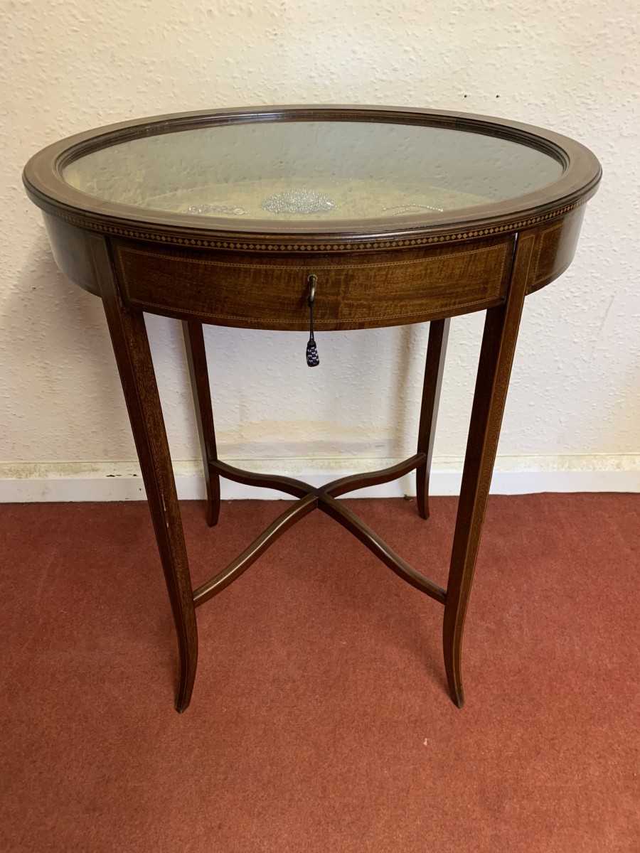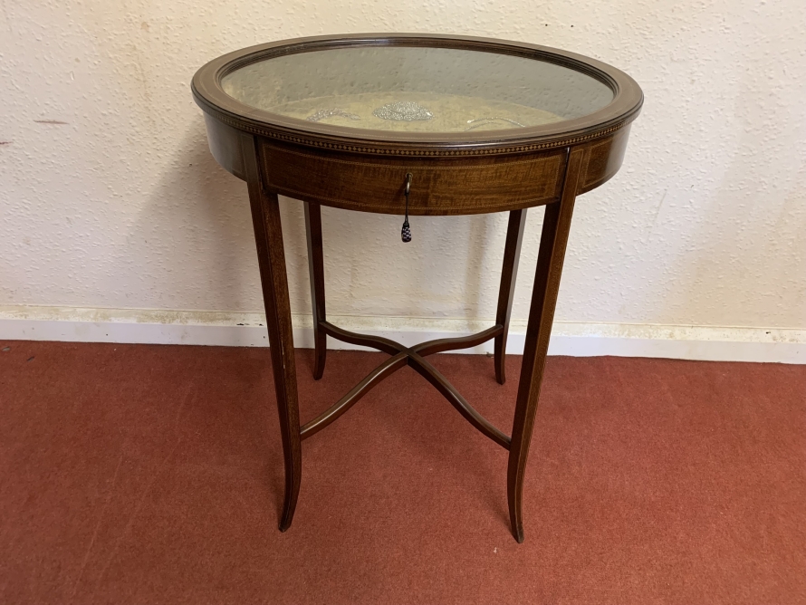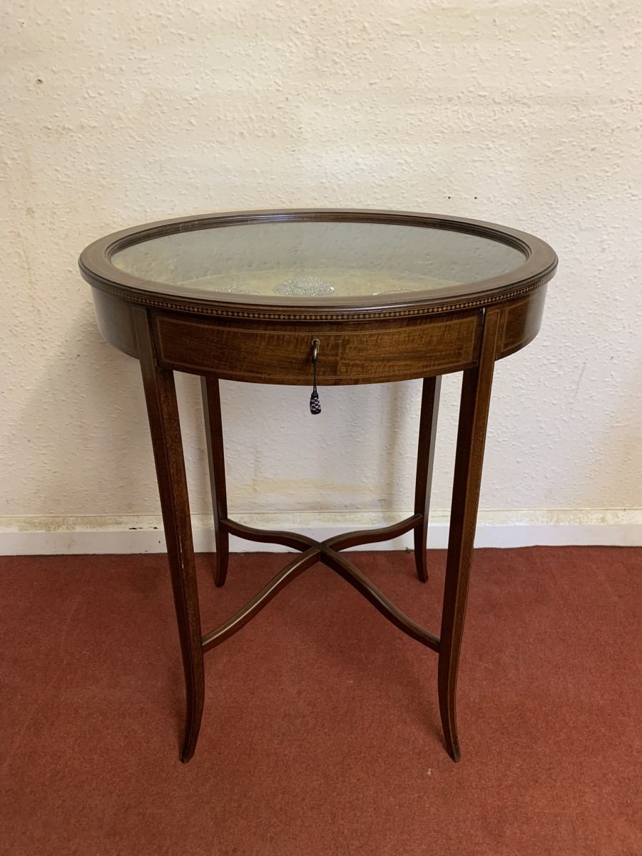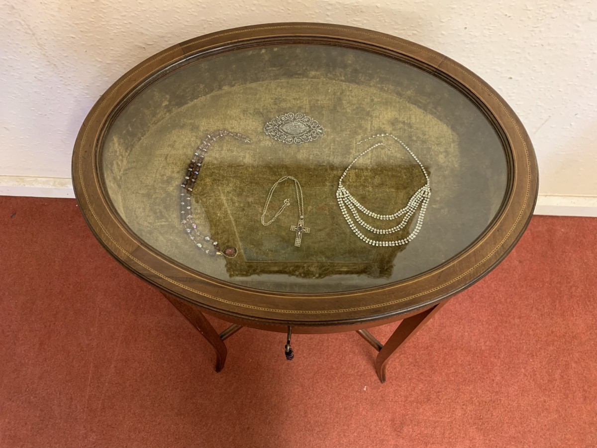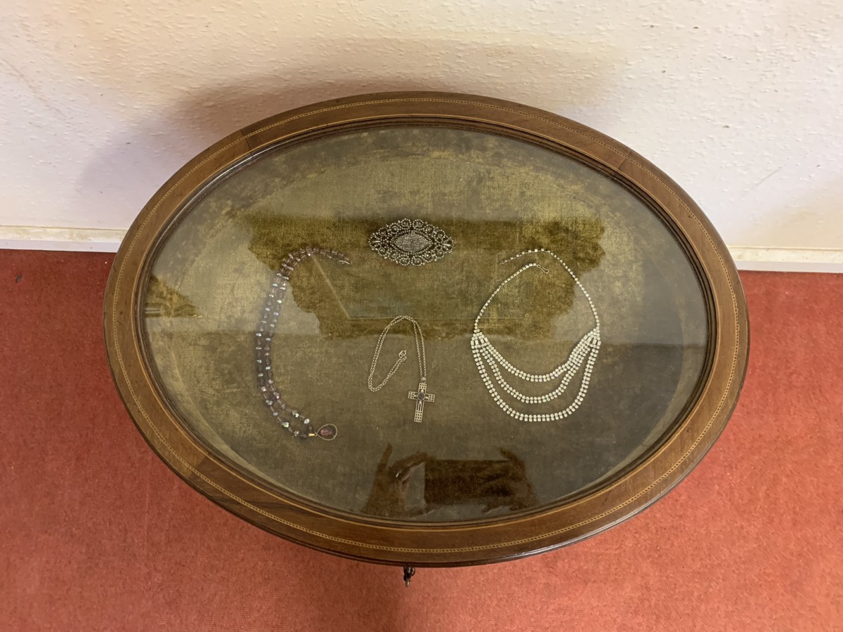 - Elegant Antique Oval Inlaid Mahogany Glass Topped Bijouterie Display Case – Now Sold