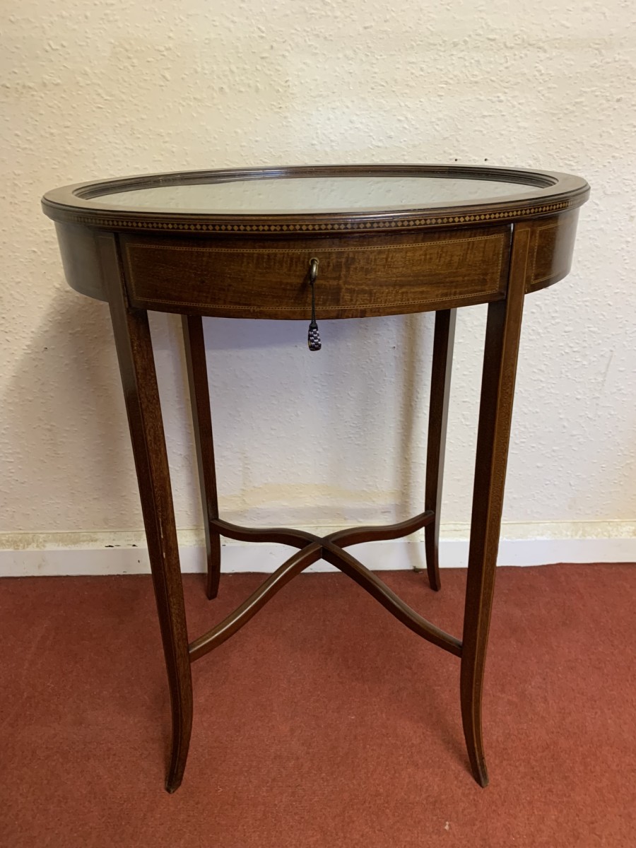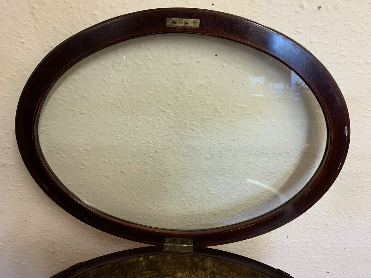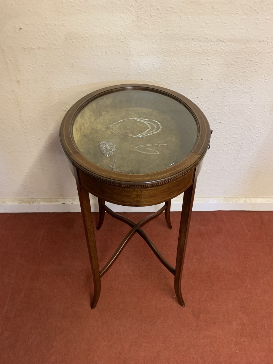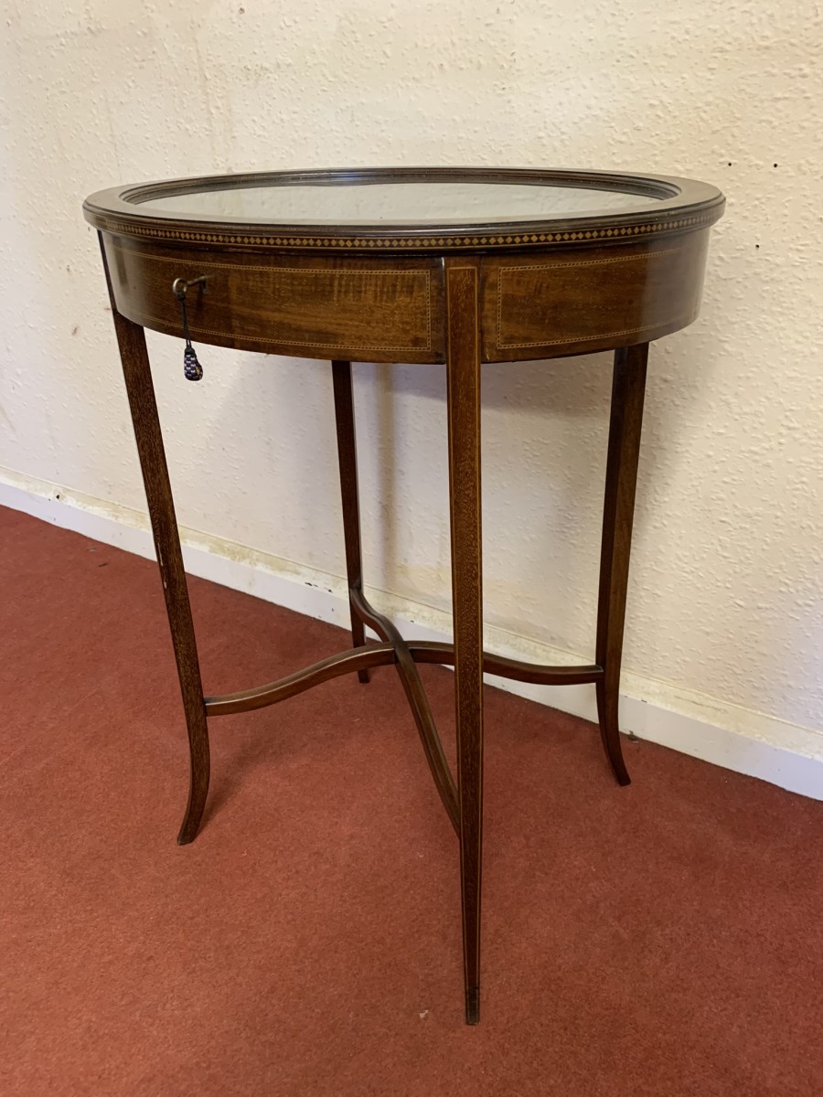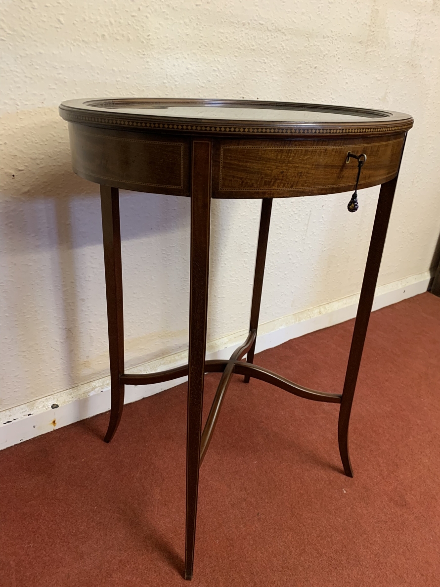 - Elegant Antique Oval Inlaid Mahogany Glass Topped Bijouterie Display Case – Now Sold