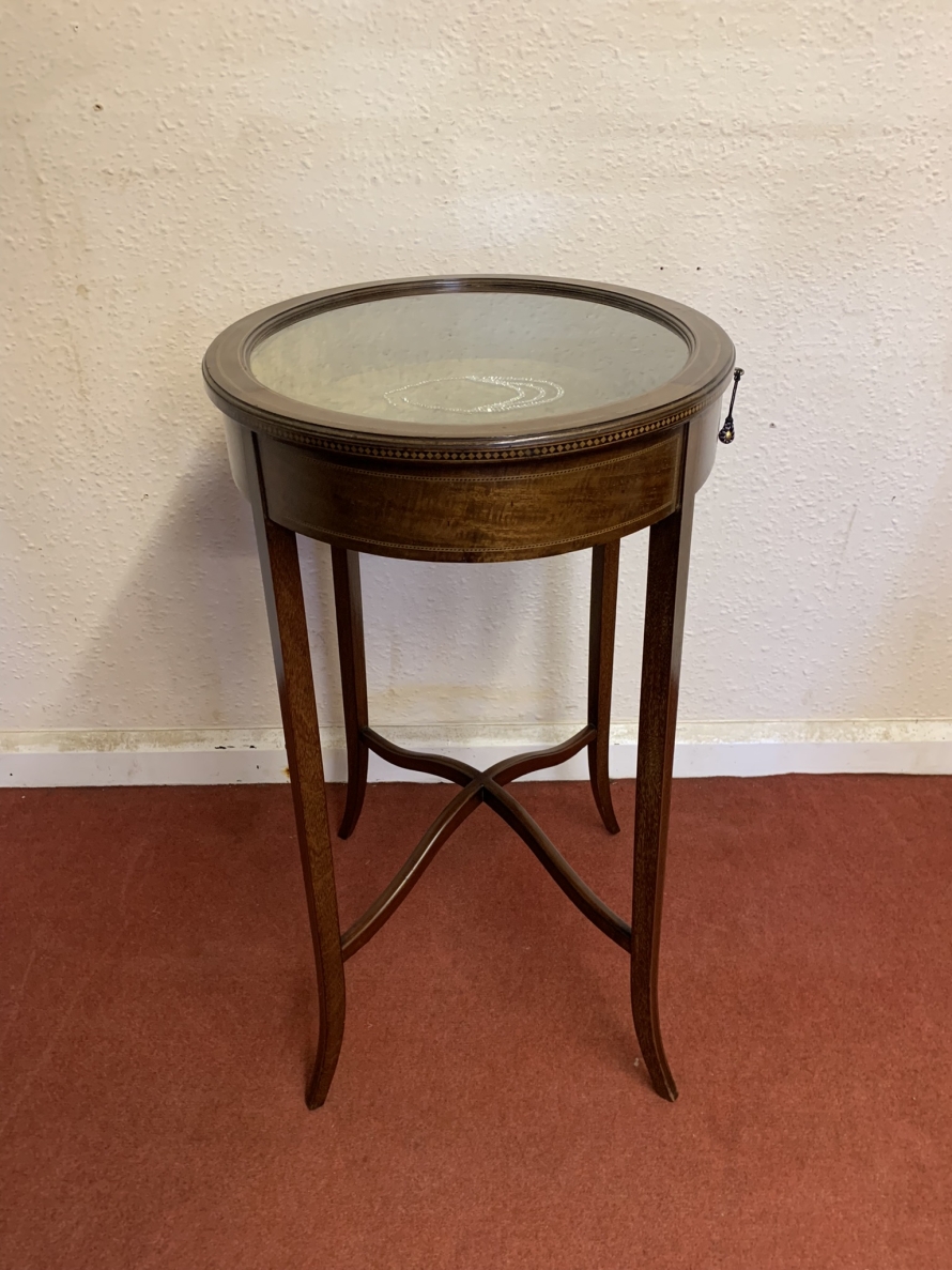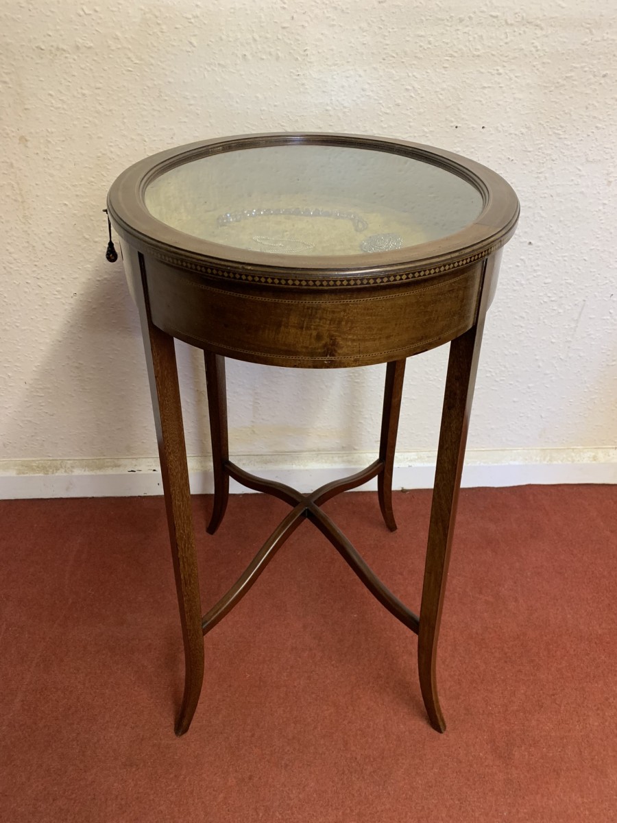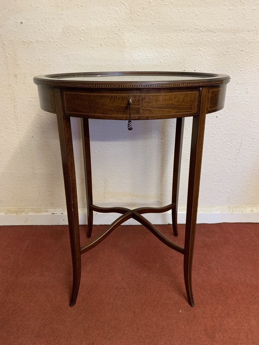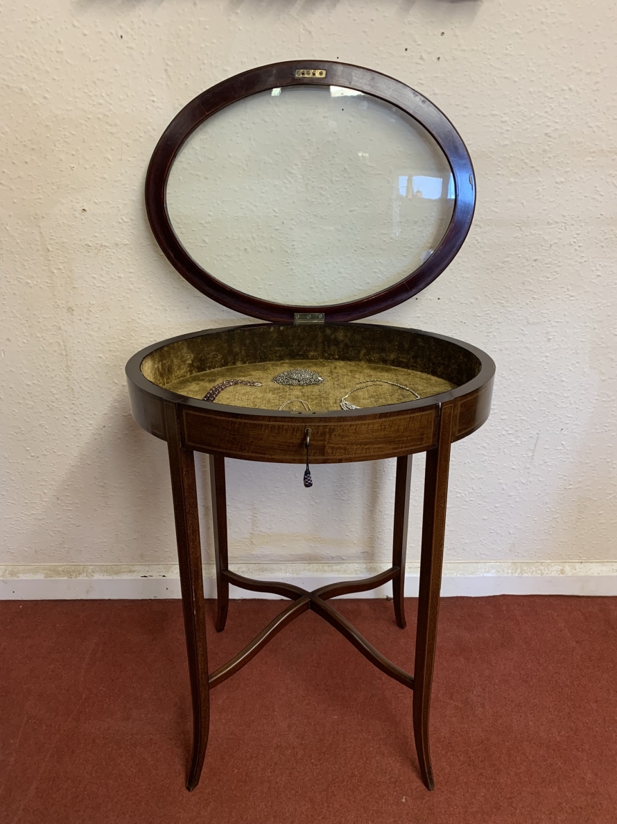 This fine bijouterie is from the Edwardian period and dates circa 1910. Made in fabulous mahogany and having inlaid decoration throughout. Oval glazed display top with original lock and key. Standing on four out swept legs with shaped stretcher supports. This fabulous bijouterie is in excellent condition.