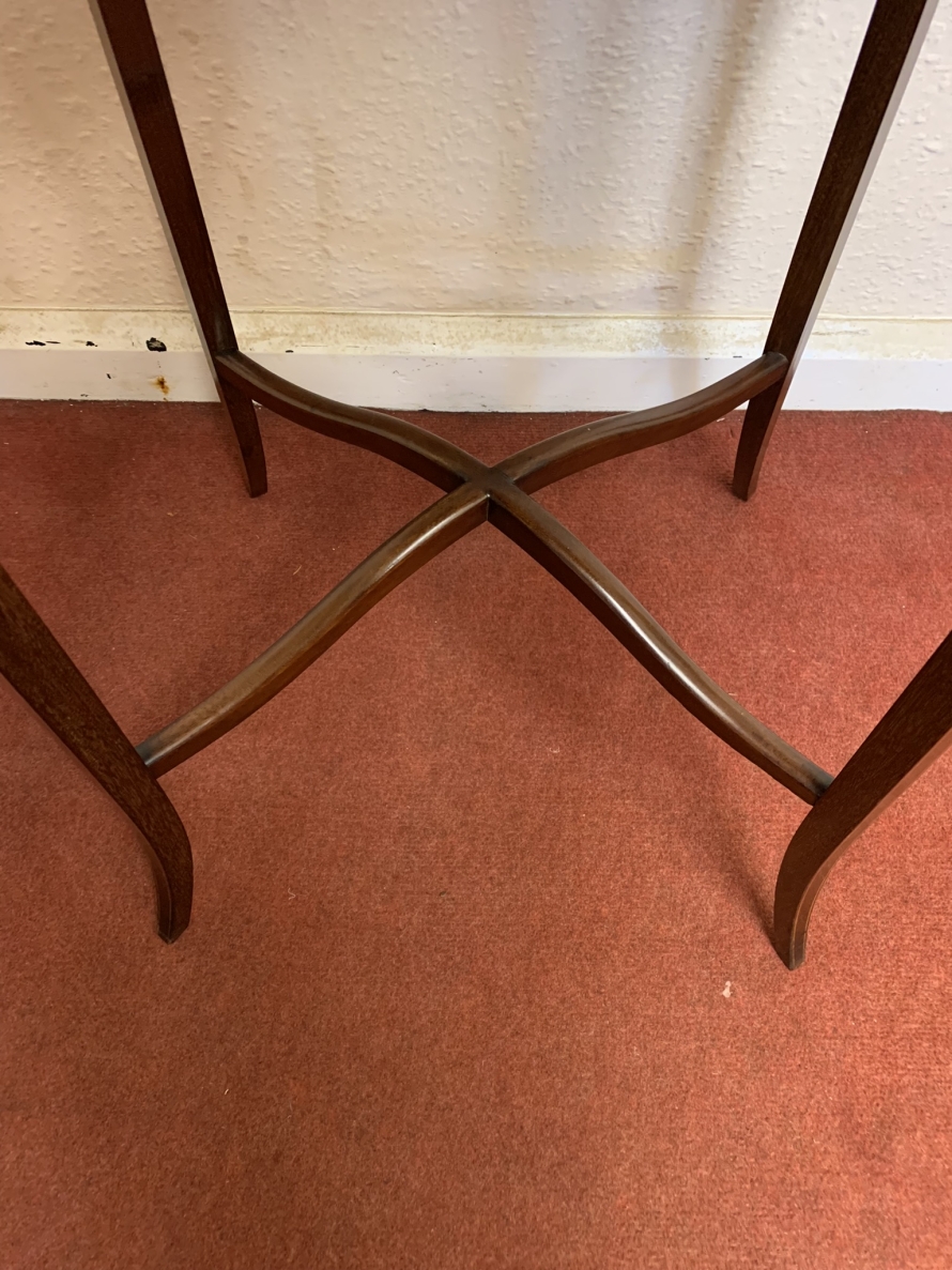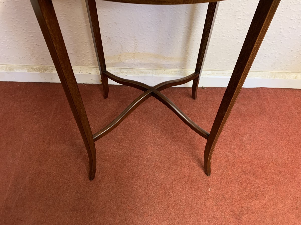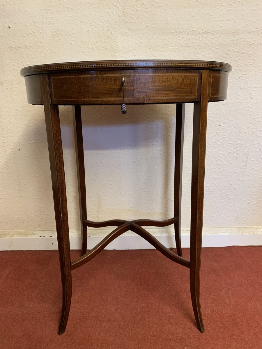 This fine bijouterie is from the Edwardian period and dates circa 1910. Made in fabulous mahogany and having inlaid decoration throughout. Oval glazed display top with original lock and key. Standing on four out swept legs with shaped stretcher supports. This fabulous bijouterie is in excellent condition.
