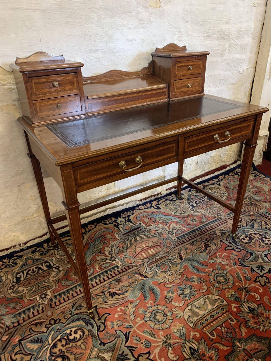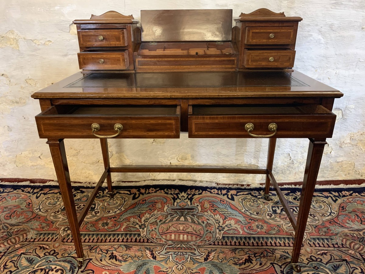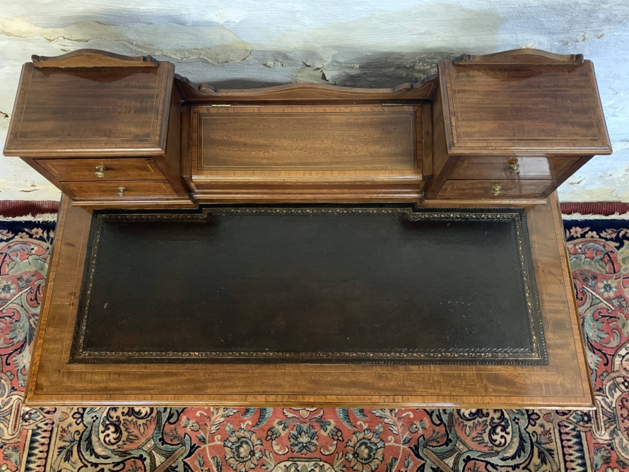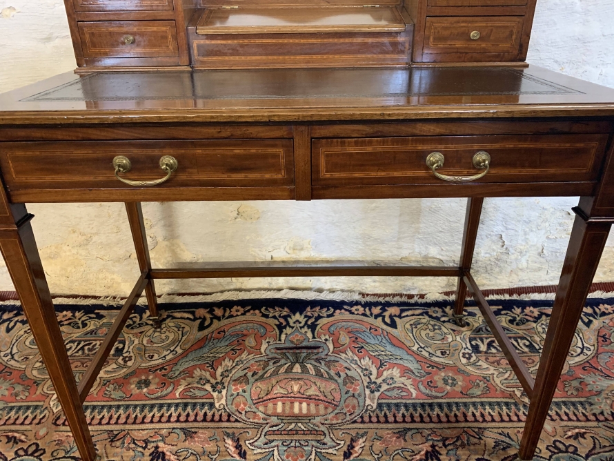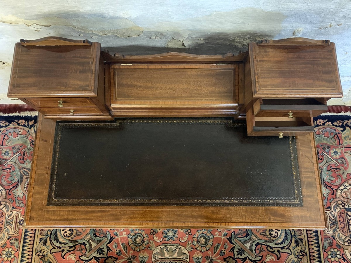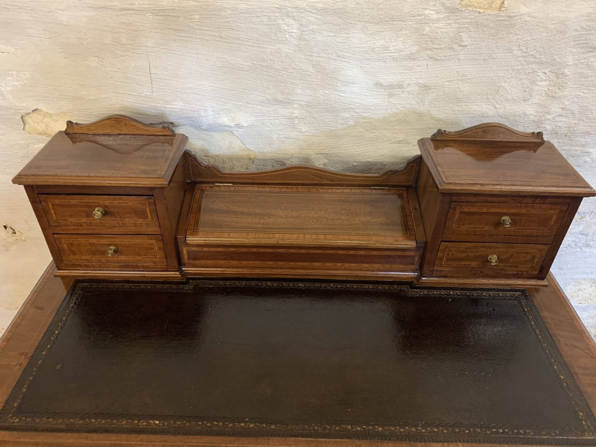 The back has a central slope which opens to reveal an inkwell, pen holders and letter racks. This is flanked by a pair of two banks of drawers, each drawer having decorative brass button handle. The black leather writing surface has gilt tooling. To the front are a pair of drawers each drawer having decorative brass handle. Four tapered legs stand on original casters with stretcher supports. Please note this desk is beautifully inlaid throughout, the legs are all string inlaid a mark of quality craftsmanship.