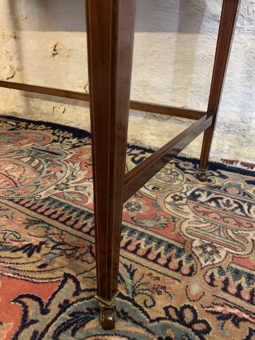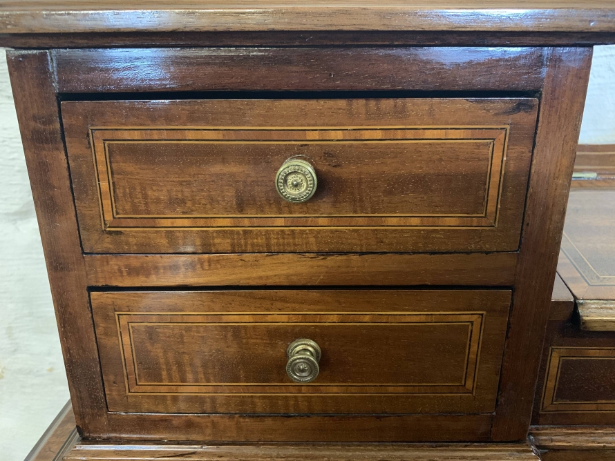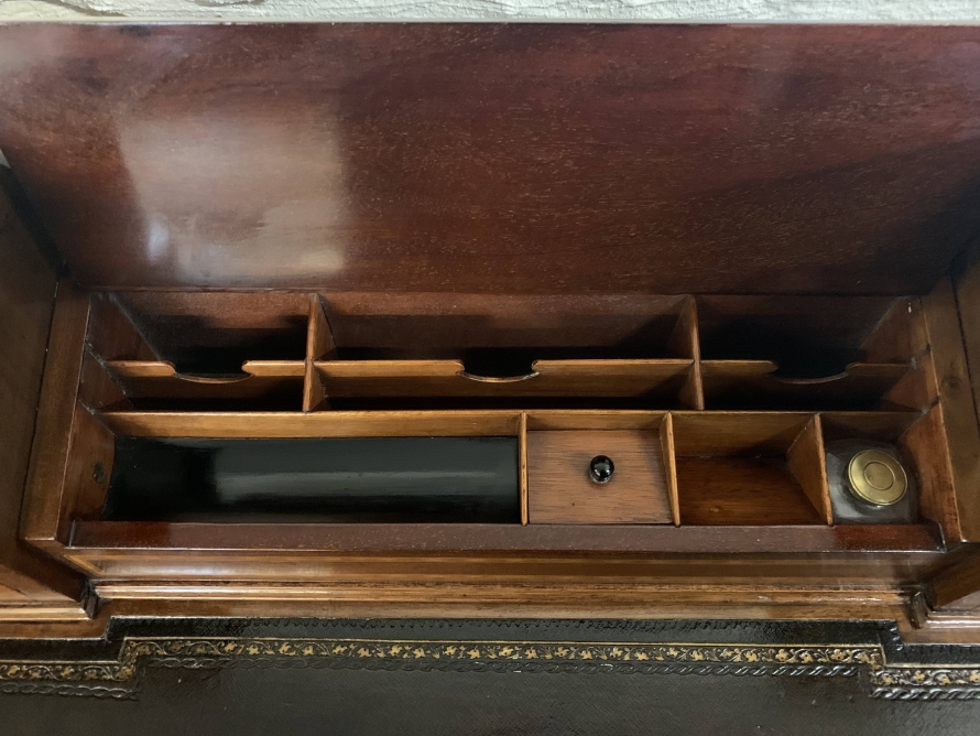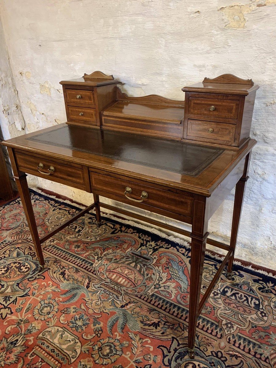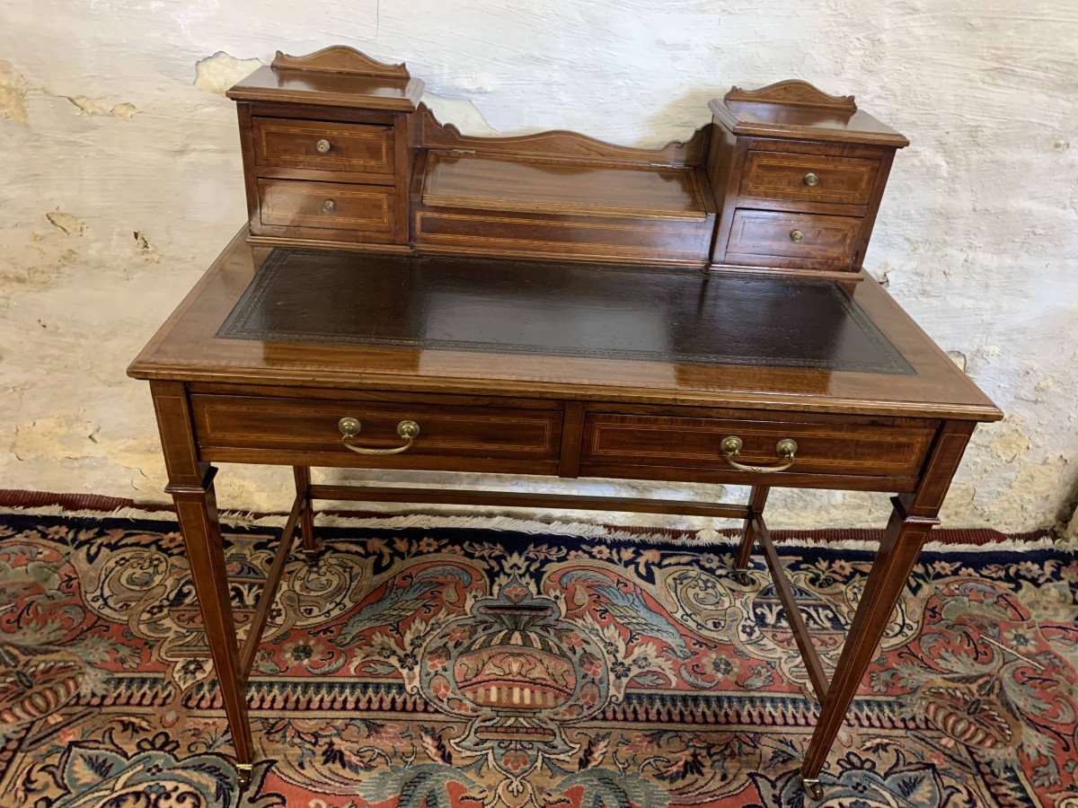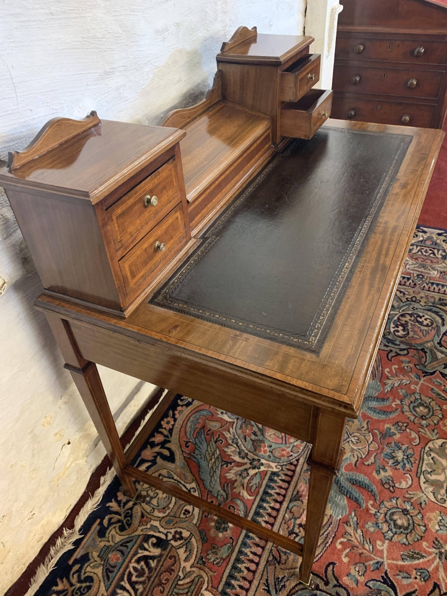 The back has a central slope which opens to reveal an inkwell, pen holders and letter racks. This is flanked by a pair of two banks of drawers, each drawer having decorative brass button handle. The black leather writing surface has gilt tooling. To the front are a pair of drawers each drawer having decorative brass handle. Four tapered legs stand on original casters with stretcher supports. Please note this desk is beautifully inlaid throughout, the legs are all string inlaid a mark of quality craftsmanship.