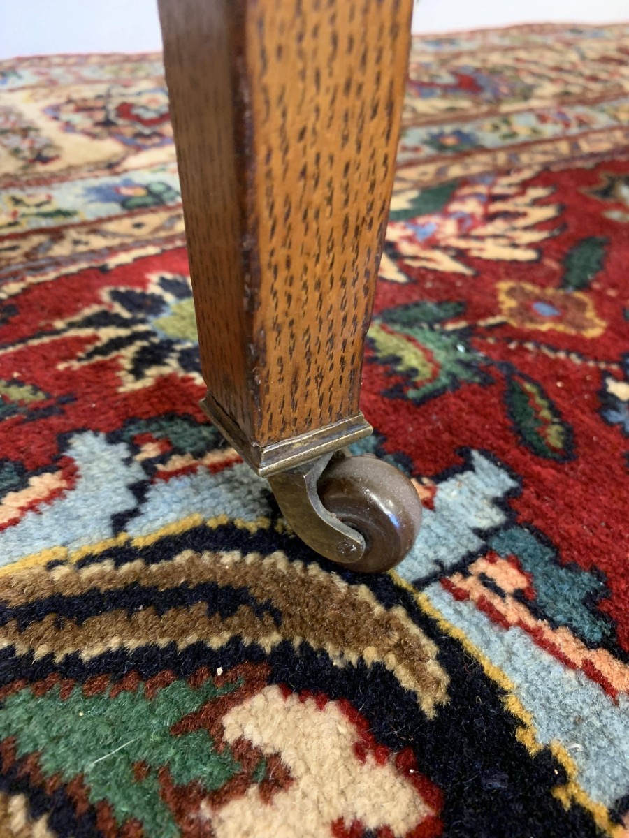 The top has a antique green leather insert with gilt decoration. To the front are a pair of drawers, each drawer having a brass drop handle. This lovely desk which dates circa 1915 stands on four tapered legs on original brass casters.