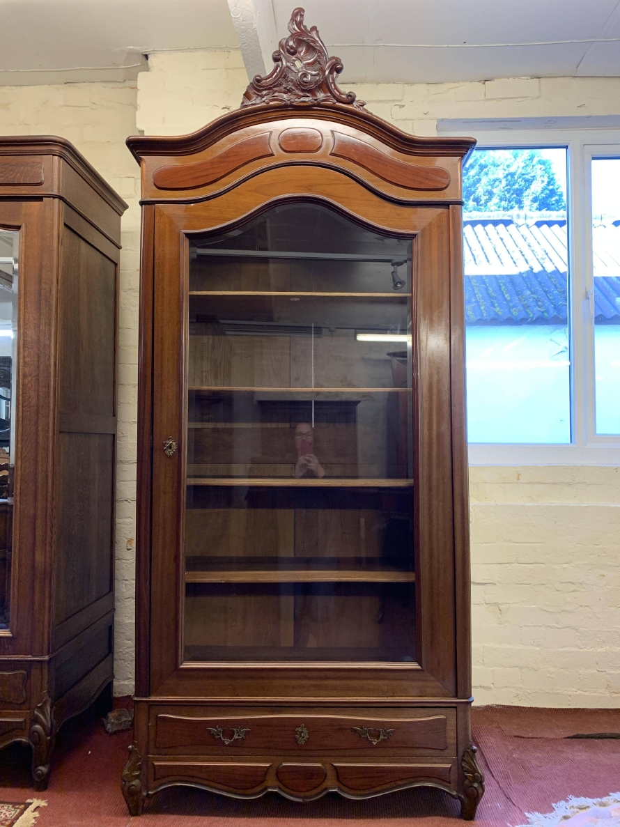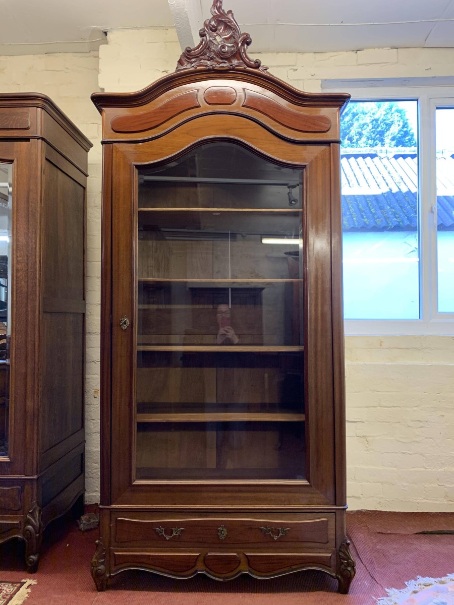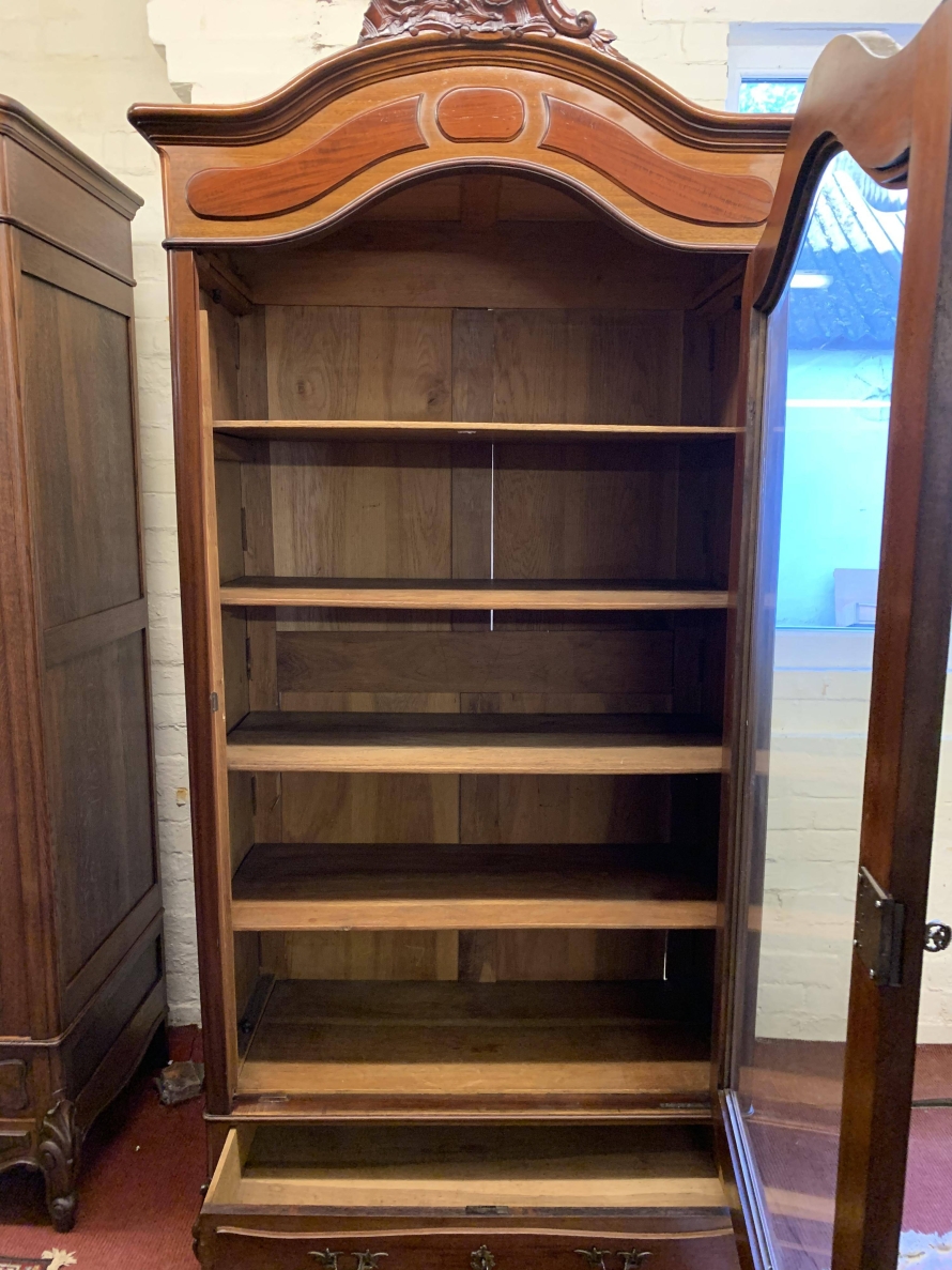 The shaped over sailing top rises to a stunning central carved decoration, below is a full length glazed lockable door, the glass has bevel edging, a mark of quality. The door opens to reveal four removable shelves. Below the door is a lockable drawer, the drawer having a pair of ornate brass handles. This fantastic armoire/linen cabinet stands on carved shaped cabriole legs to the front.