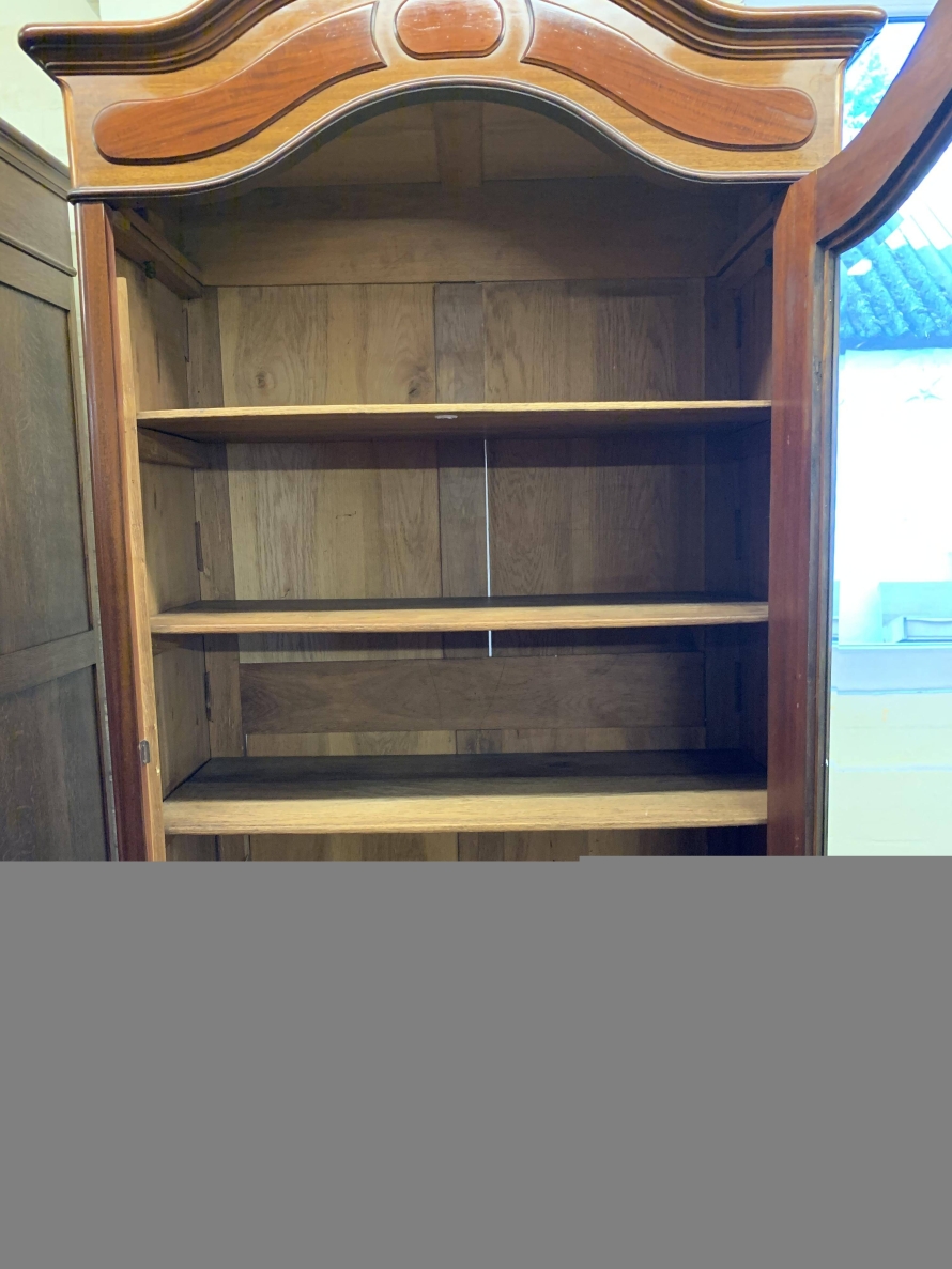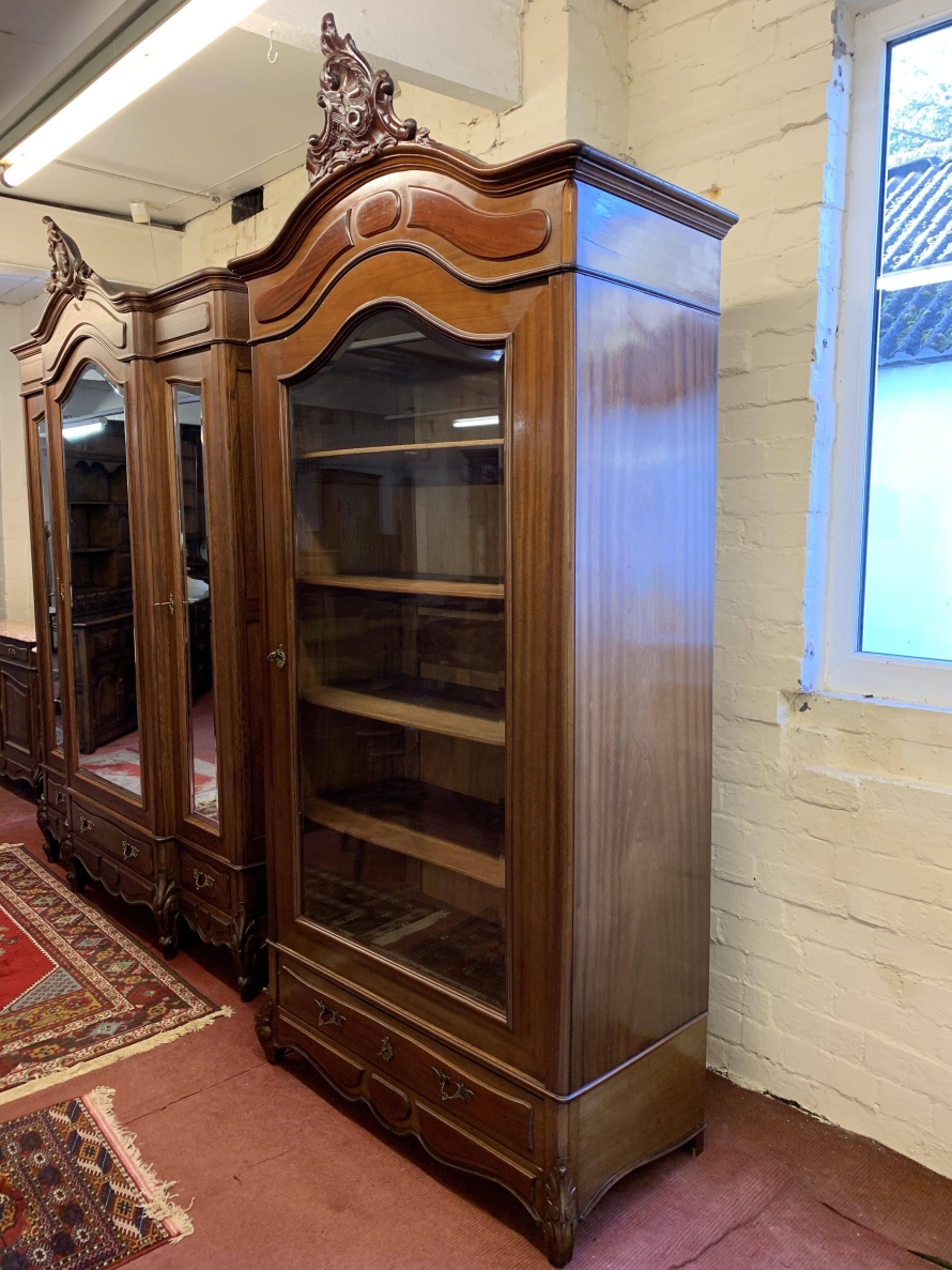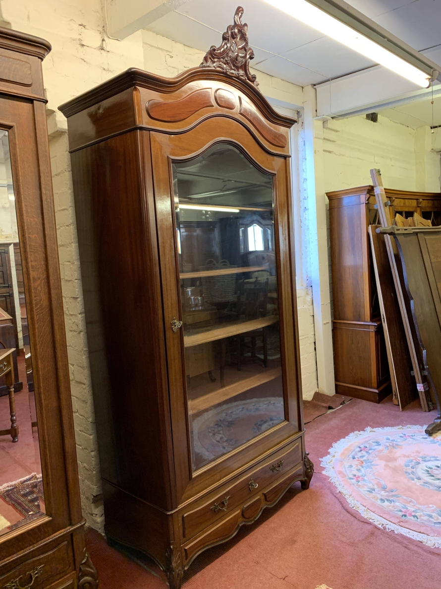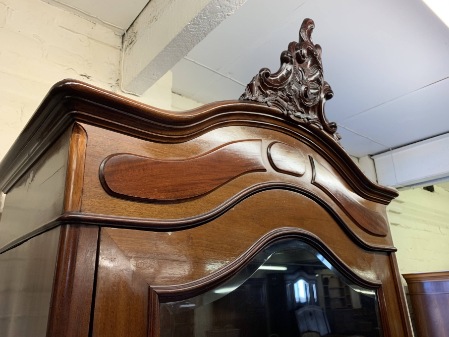 The shaped over sailing top rises to a stunning central carved decoration, below is a full length glazed lockable door, the glass has bevel edging, a mark of quality. The door opens to reveal four removable shelves. Below the door is a lockable drawer, the drawer having a pair of ornate brass handles. This fantastic armoire/linen cabinet stands on carved shaped cabriole legs to the front.