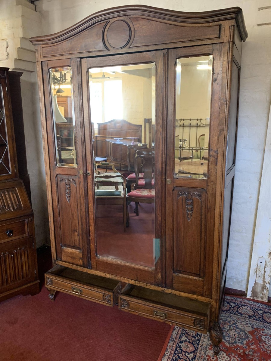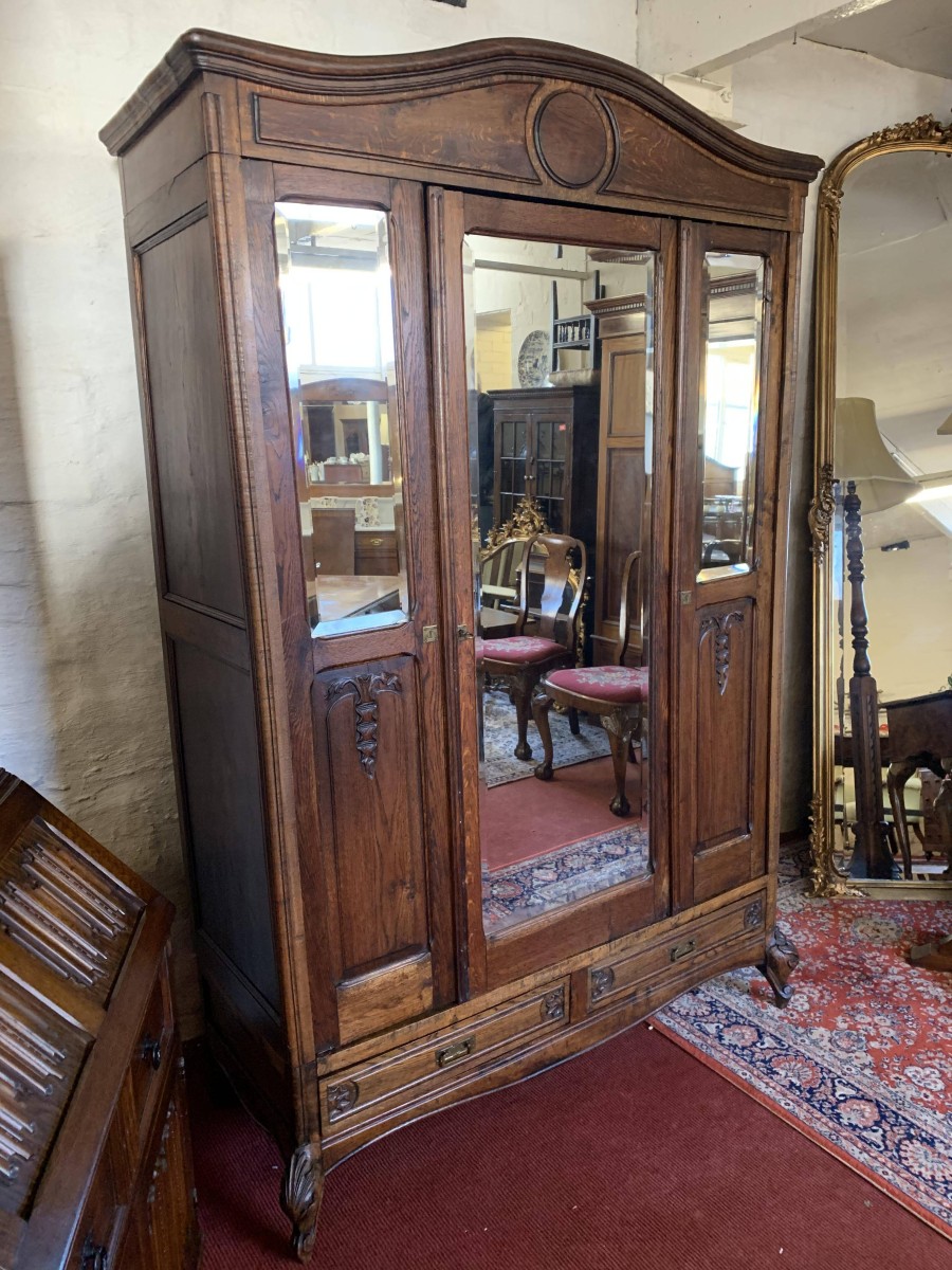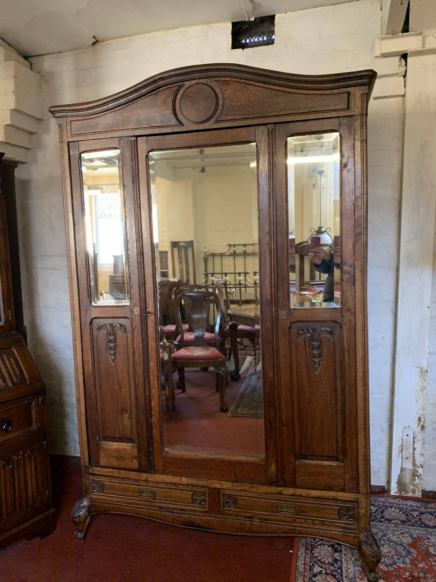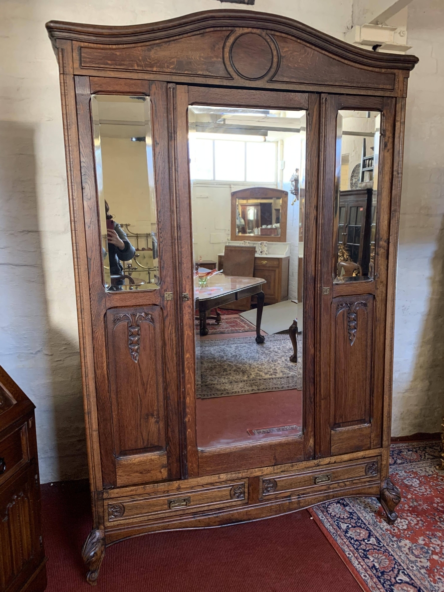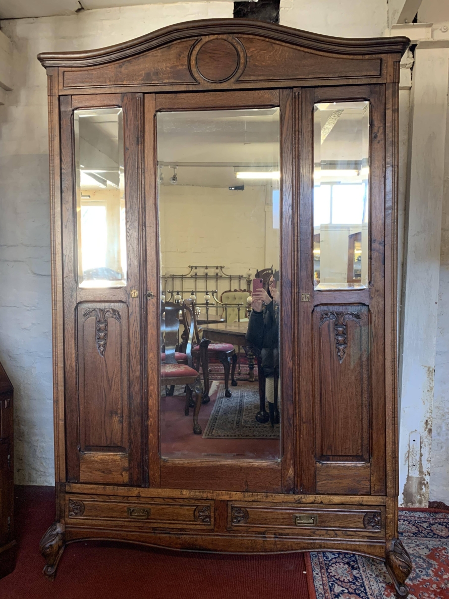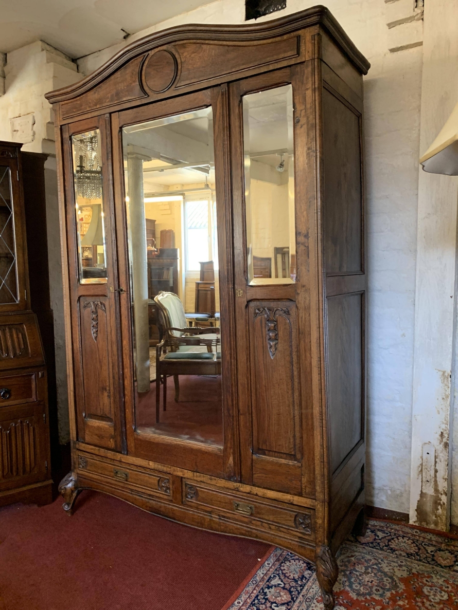 The shaped over sailing top has shaped carved panels to the front. Below is a central lockable full length dressing mirrored door, the mirror having a deep bevel. The central mirror door is flanked by a pair of doors, each door having a bevel edged mirror which sits above a carved recessed panel. The doors open to reveal a hanging rail with ample storage. Below are two carved recessed panelled drawers, each drawer having decorative brass handle. Recessed panelled sides and shaped skirt this stylish Antique French armoire stands on two carved cabriole shaped legs to the front. Please note this armoire splits down for easy transportation and delivery into any home.