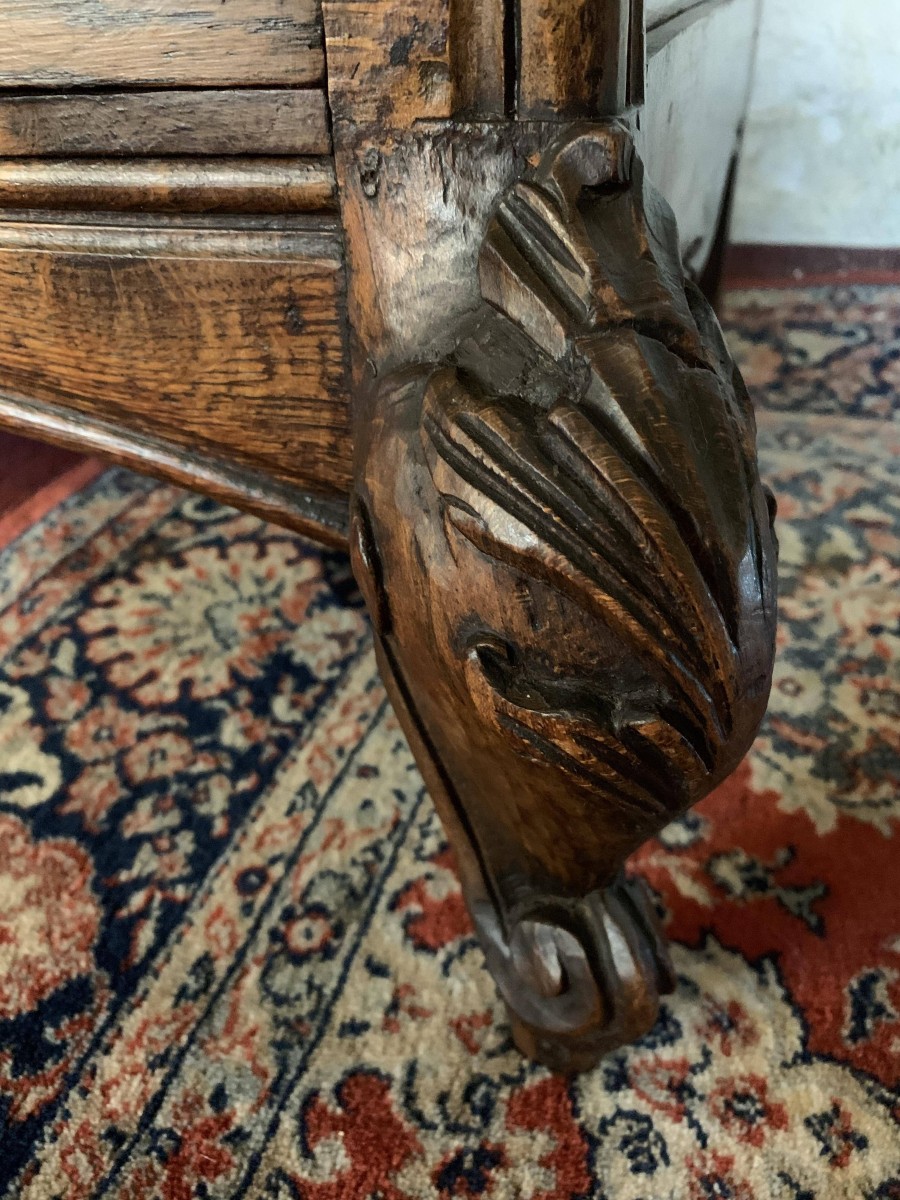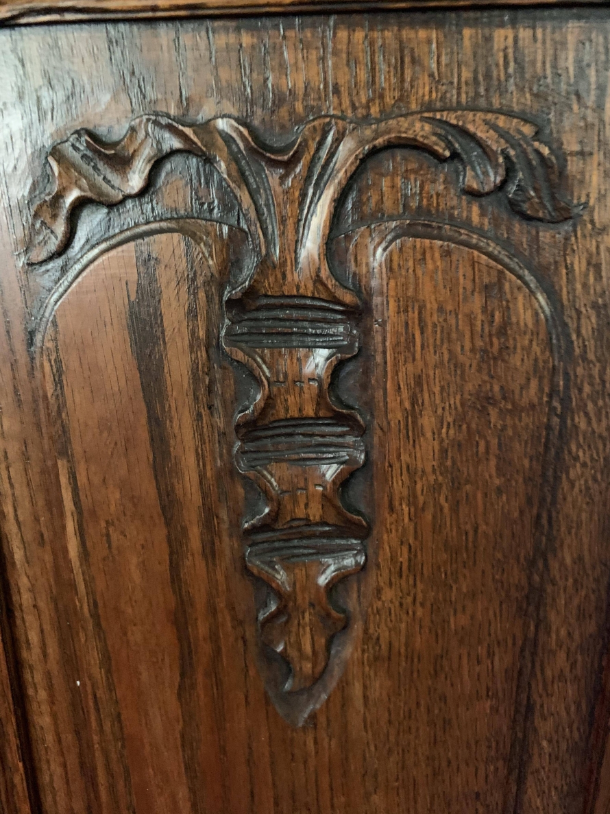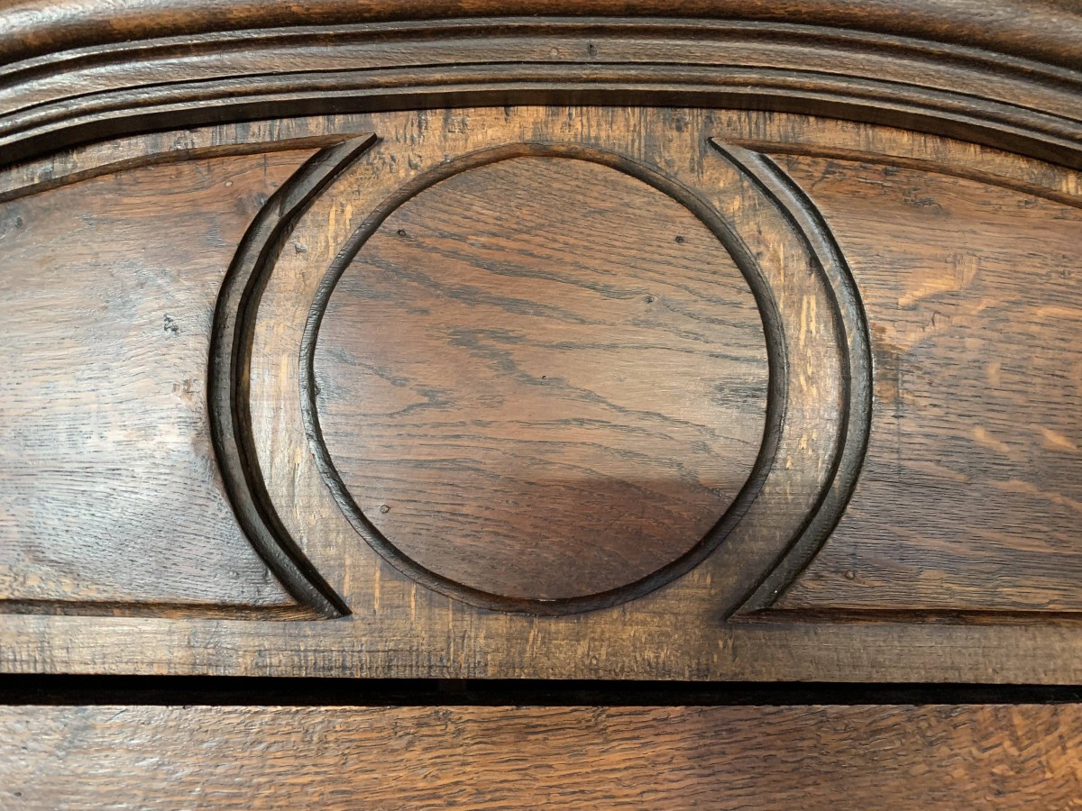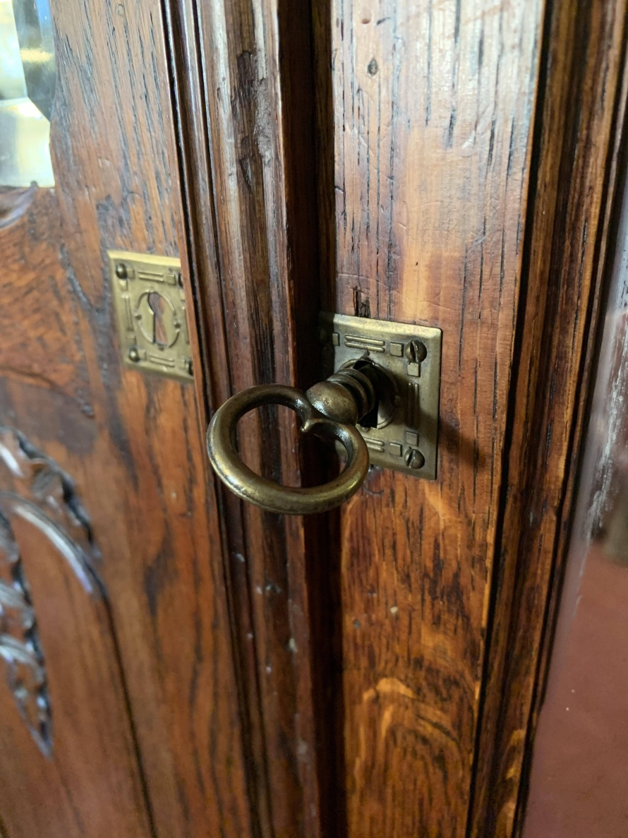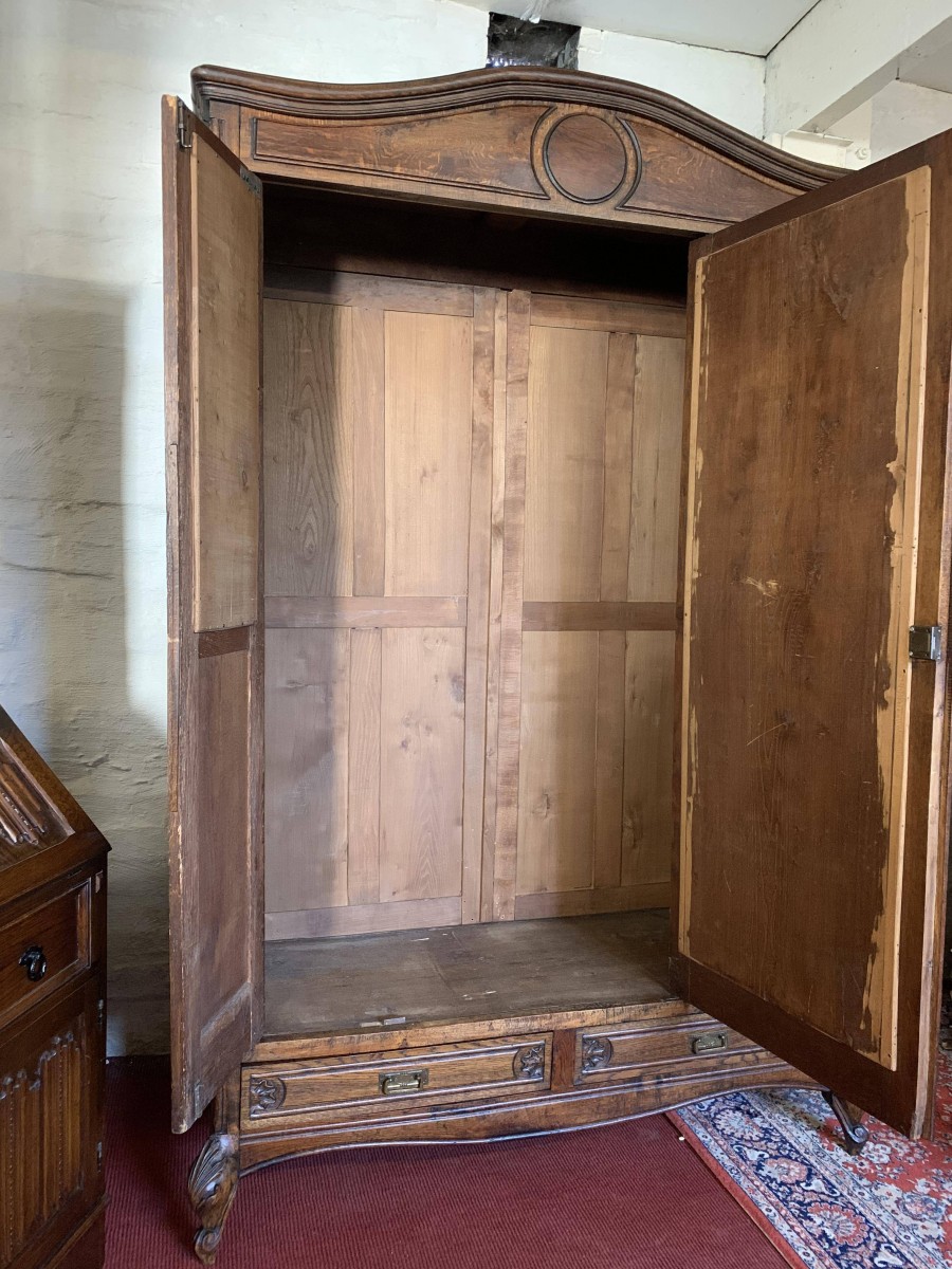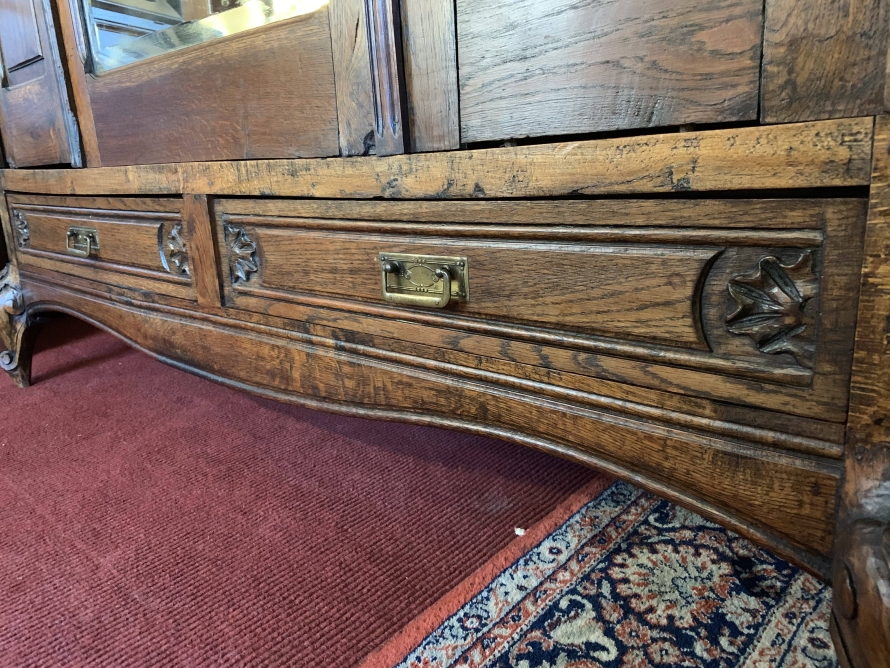 The shaped over sailing top has shaped carved panels to the front. Below is a central lockable full length dressing mirrored door, the mirror having a deep bevel. The central mirror door is flanked by a pair of doors, each door having a bevel edged mirror which sits above a carved recessed panel. The doors open to reveal a hanging rail with ample storage. Below are two carved recessed panelled drawers, each drawer having decorative brass handle. Recessed panelled sides and shaped skirt this stylish Antique French armoire stands on two carved cabriole shaped legs to the front. Please note this armoire splits down for easy transportation and delivery into any home.