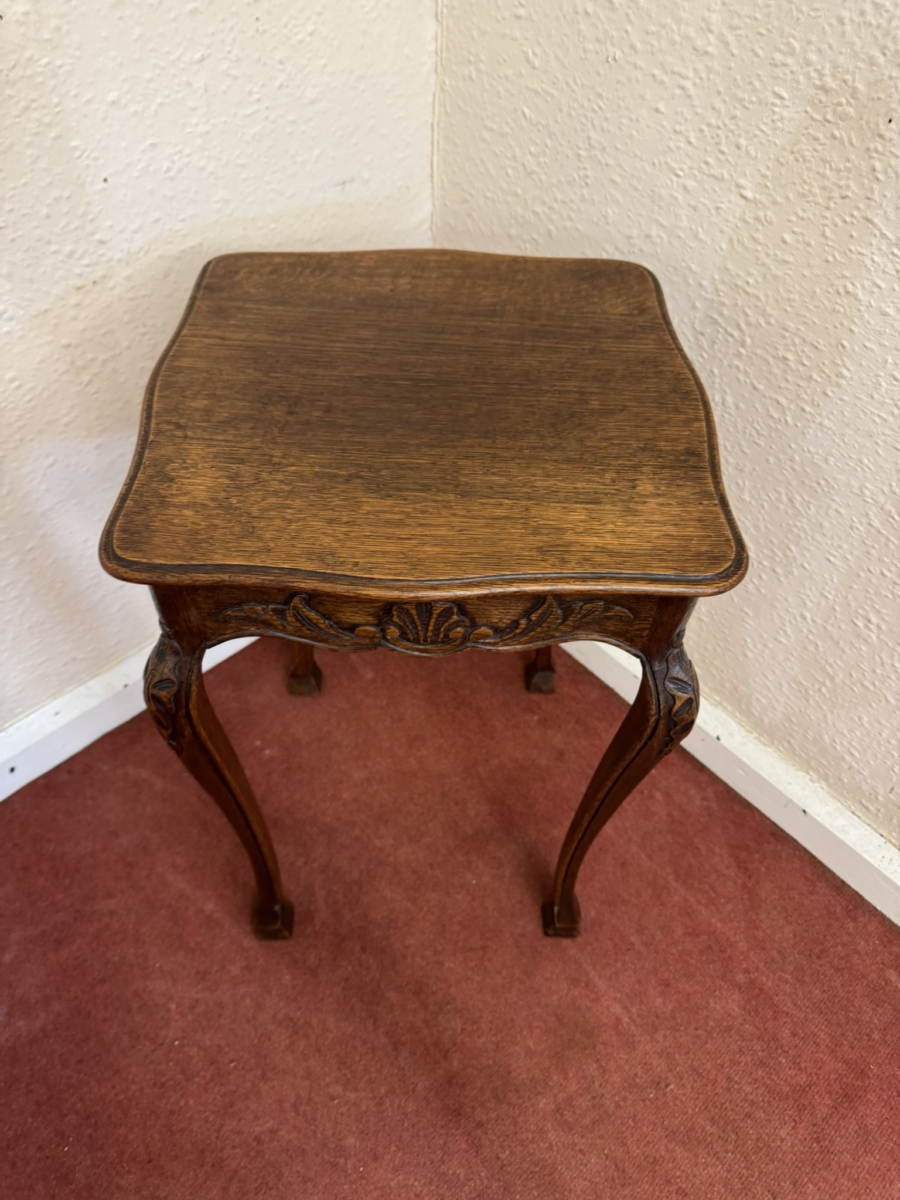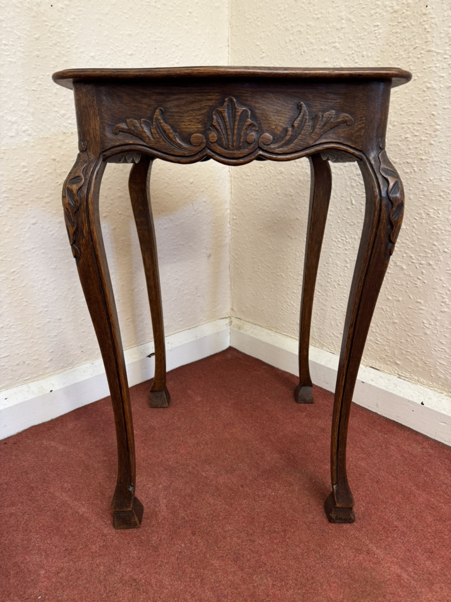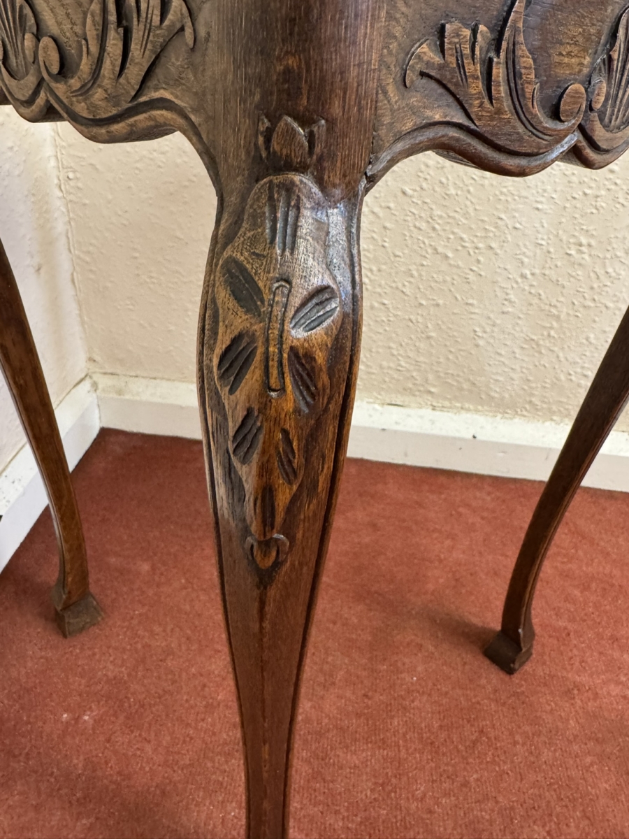 This elegant table dates circa 1930. Shaped top, ornate carved skirt and standing on four elegant carved cabriole shaped legs.