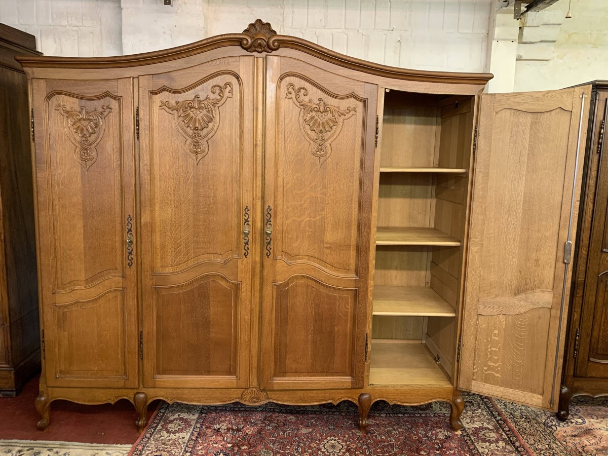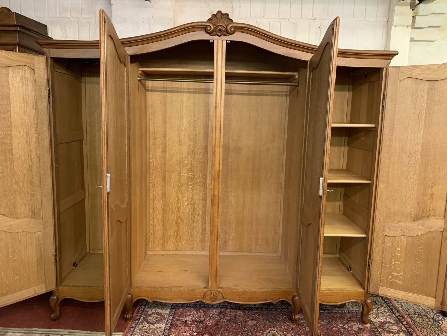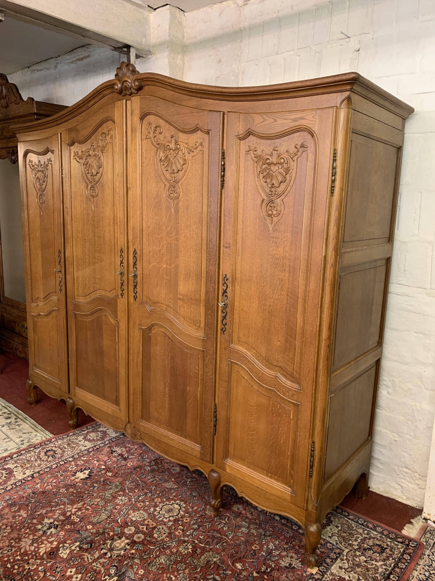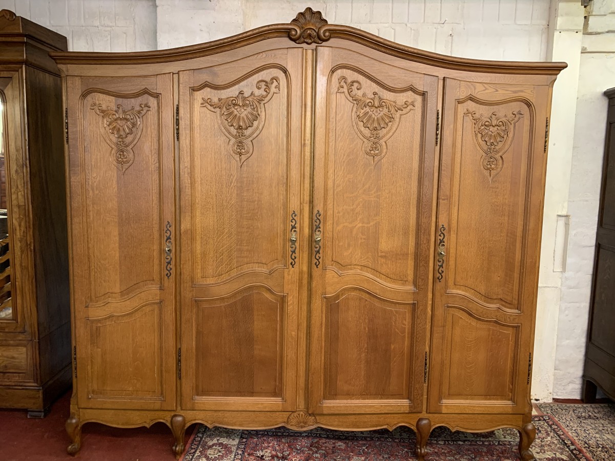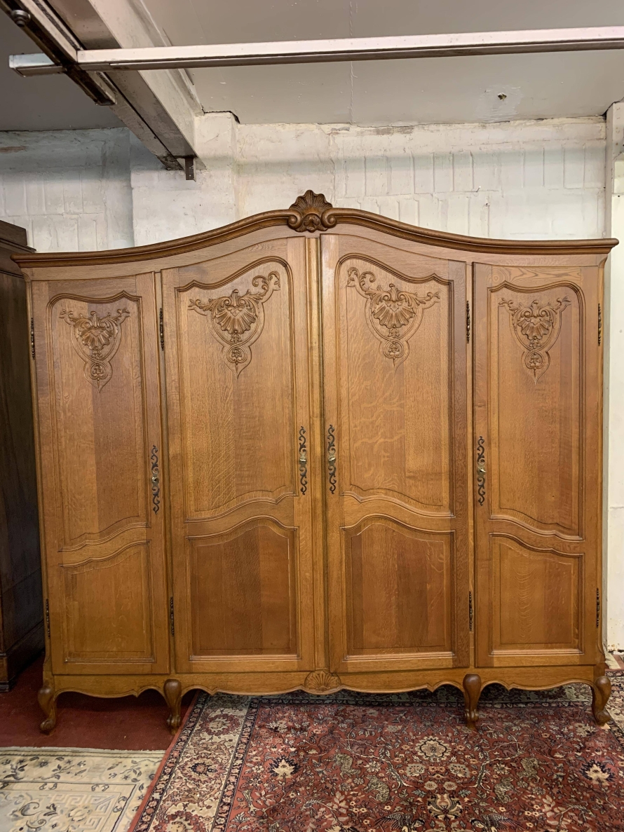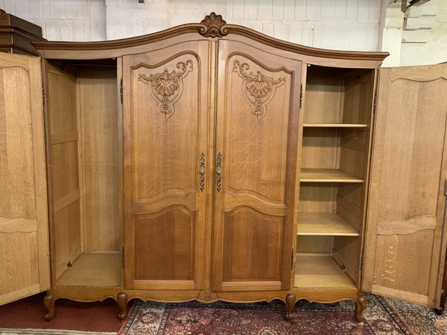 The shaped oversailing top rises to a decorative central carving, below are four lockable carved recessed panelled doors, each door having brass hinges, decorative brass escutcheon and key. The left-hand door opens to reveal a brass hanging rail, the central pair of doors open to reveal a wooden shelf which sits above a brass hanging rail. The right-hand door opens to reveal three removable wooden shelves. Recessed panelled sides, shaped skirt with ornate central carving this fabulous French armoire stands on four carved cabriole shaped legs to the front. Please note this armoire splits down for easy transportation and delivery into any home.