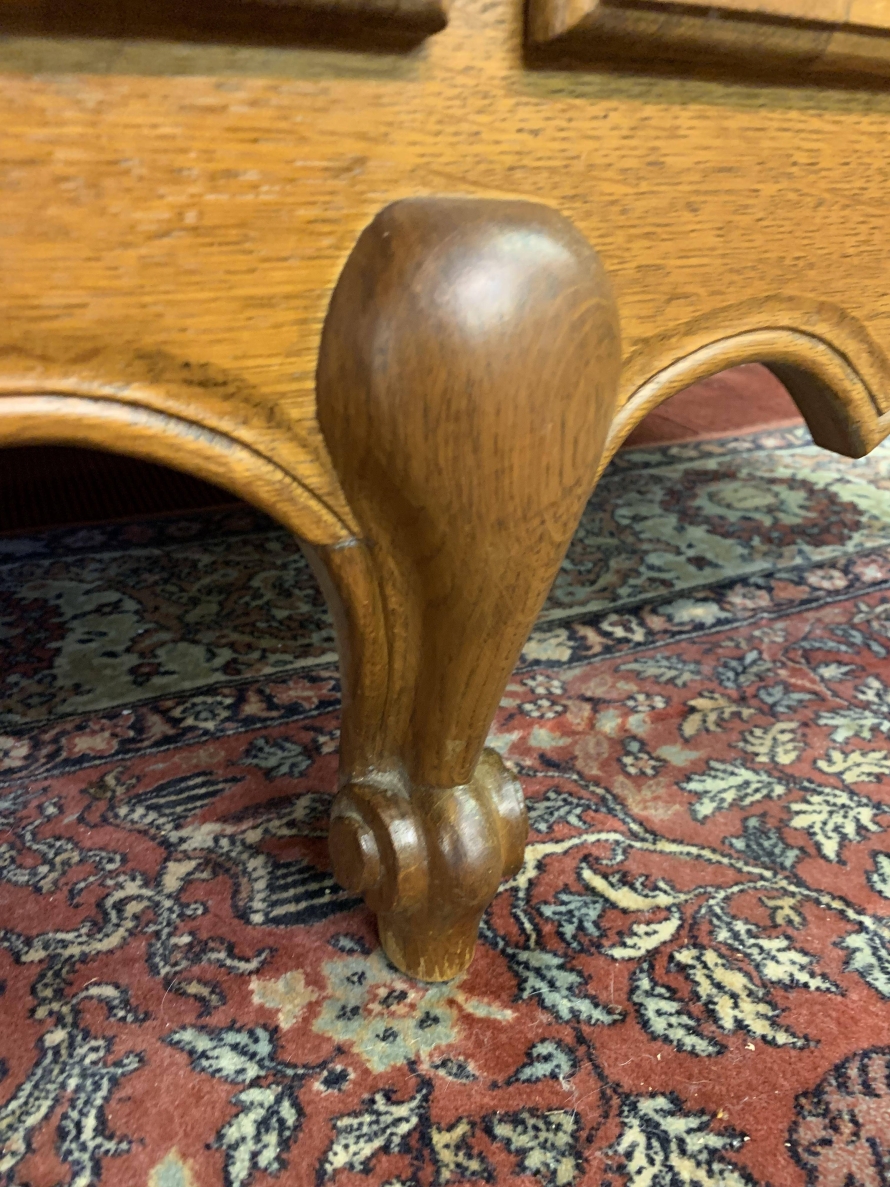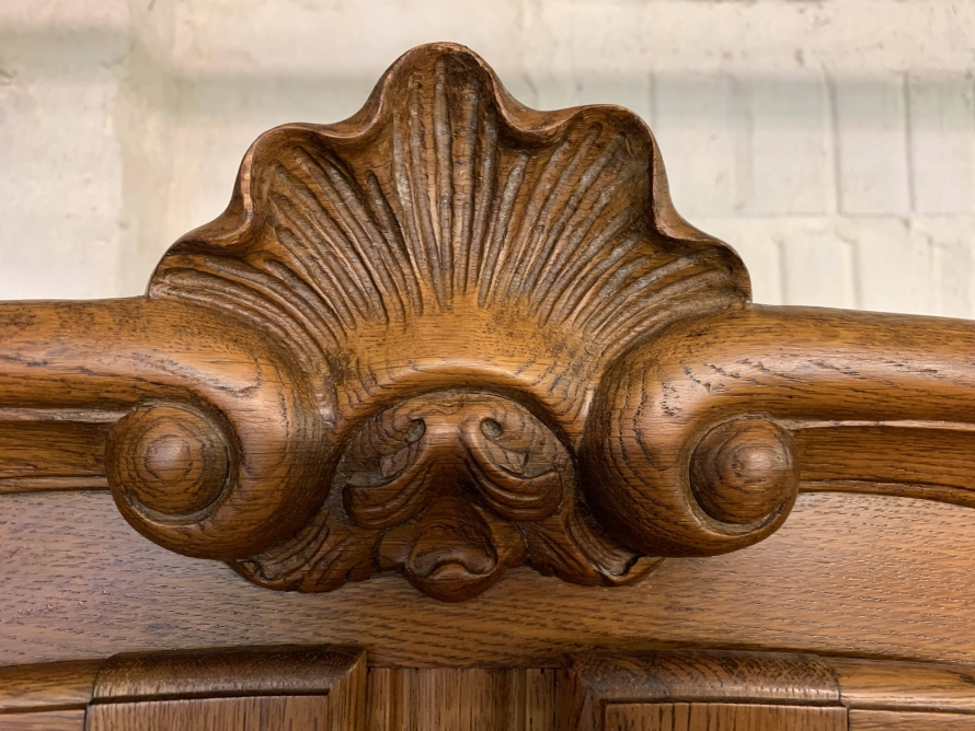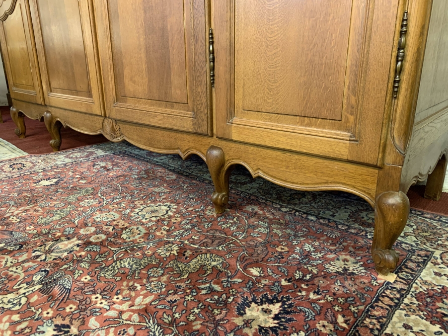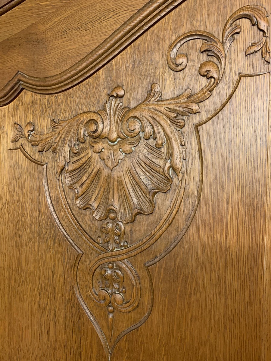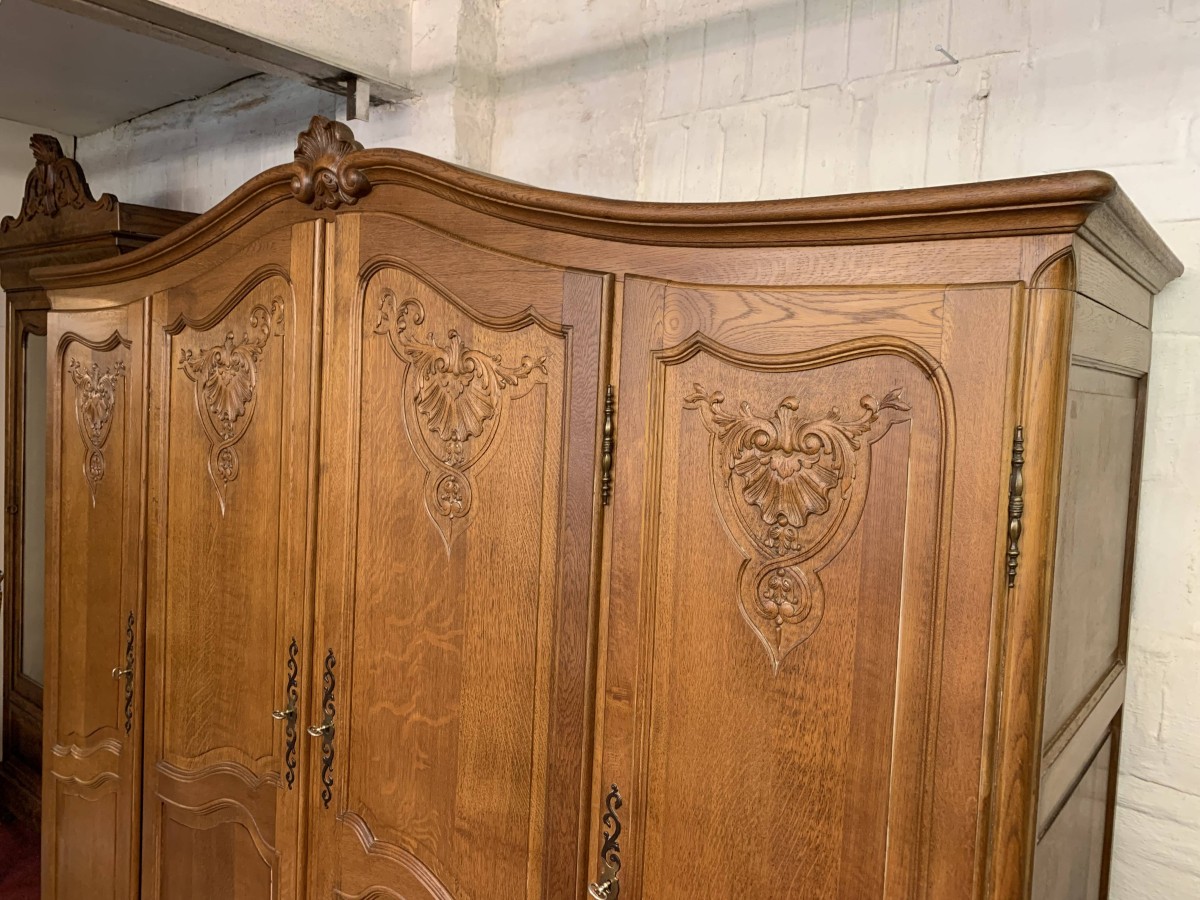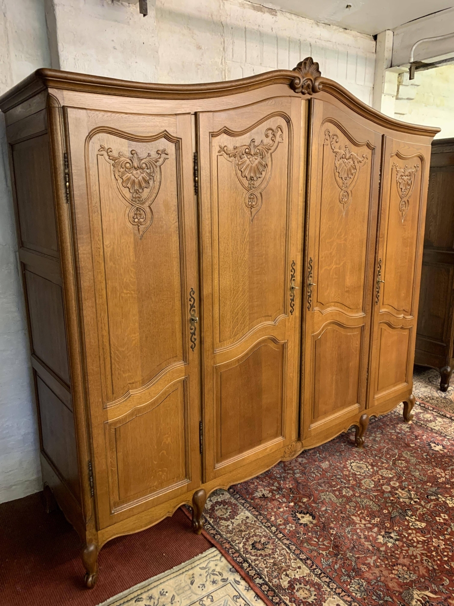 The shaped oversailing top rises to a decorative central carving, below are four lockable carved recessed panelled doors, each door having brass hinges, decorative brass escutcheon and key. The left-hand door opens to reveal a brass hanging rail, the central pair of doors open to reveal a wooden shelf which sits above a brass hanging rail. The right-hand door opens to reveal three removable wooden shelves. Recessed panelled sides, shaped skirt with ornate central carving this fabulous French armoire stands on four carved cabriole shaped legs to the front. Please note this armoire splits down for easy transportation and delivery into any home.