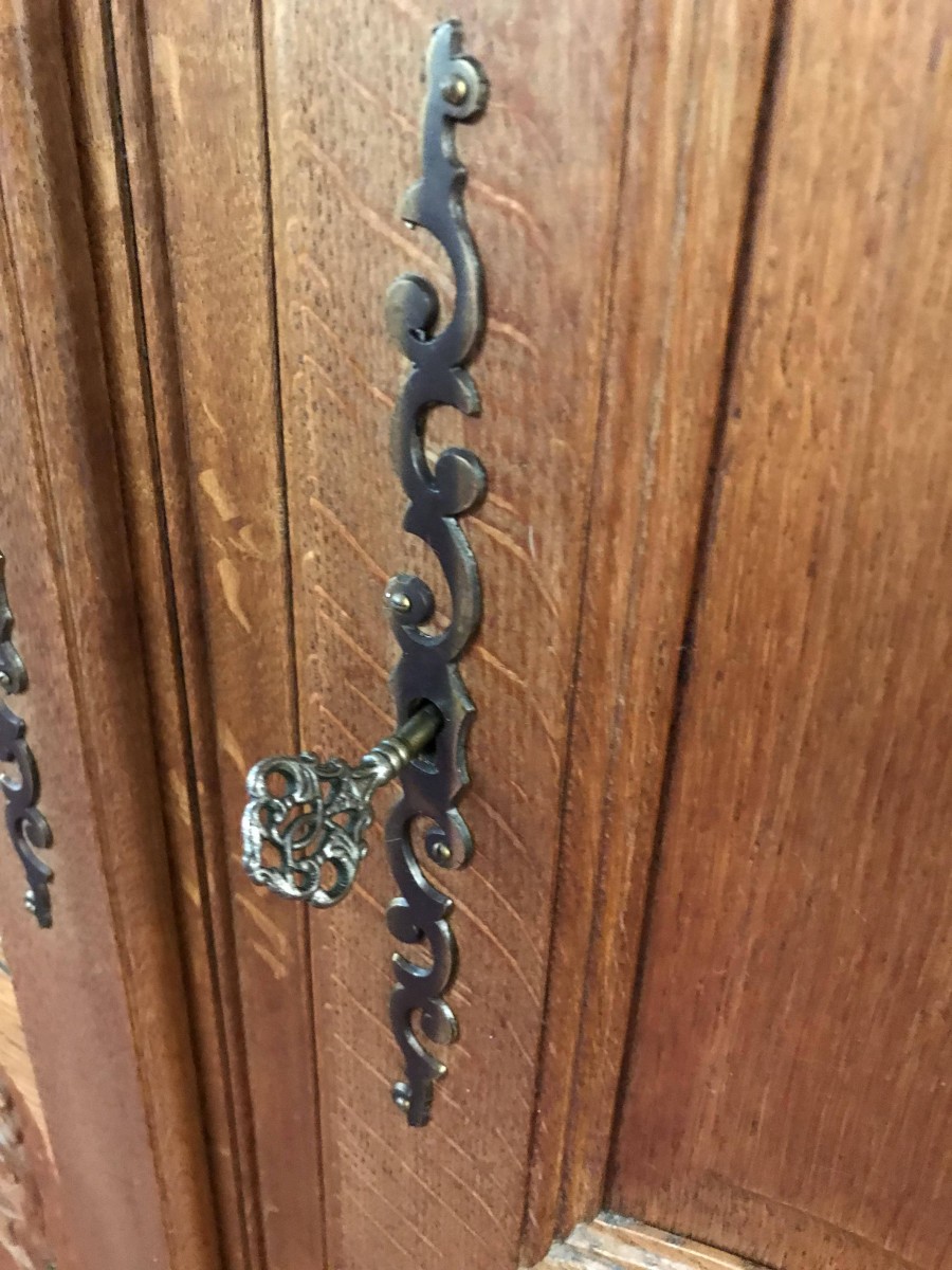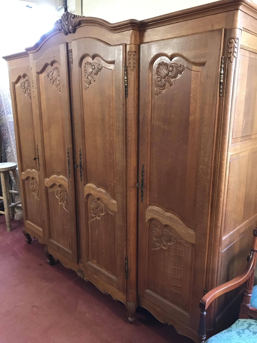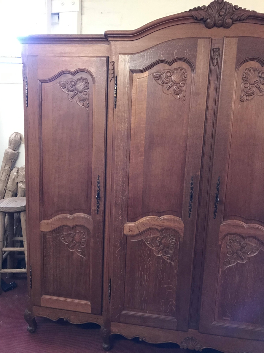 The shaped skirt has beautiful scroll carving and a central fan carving. The armoire has panelled sides and sits elegantly on four carved cabriole legs to the front. FRENCH ELEGANCE