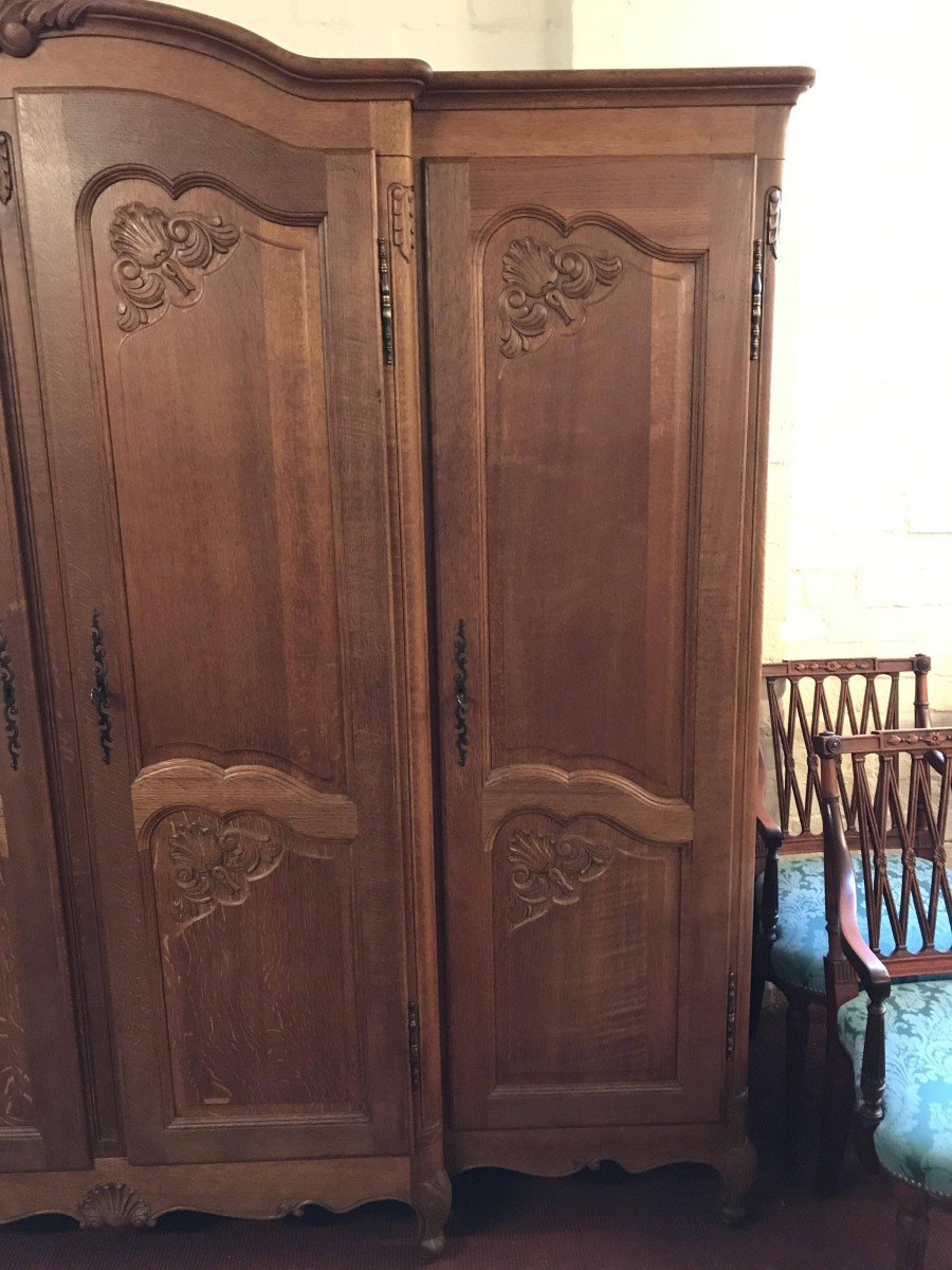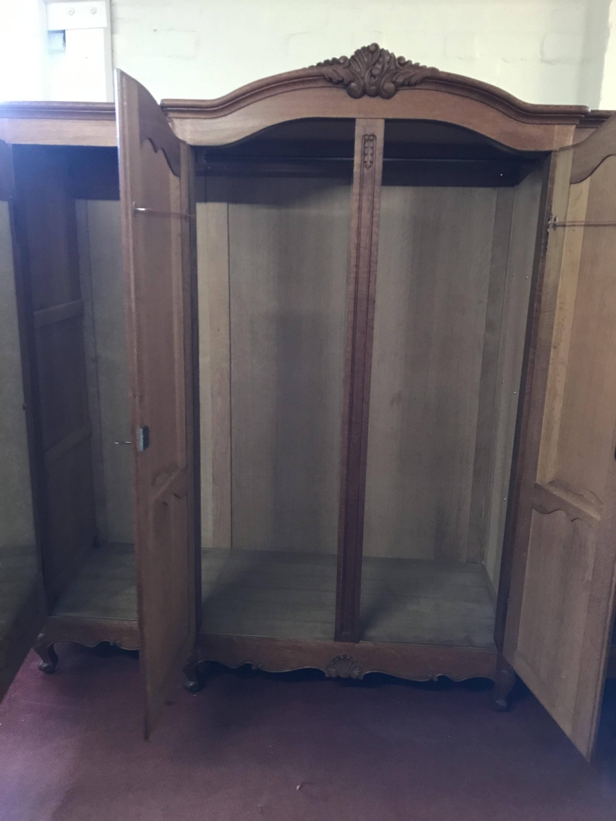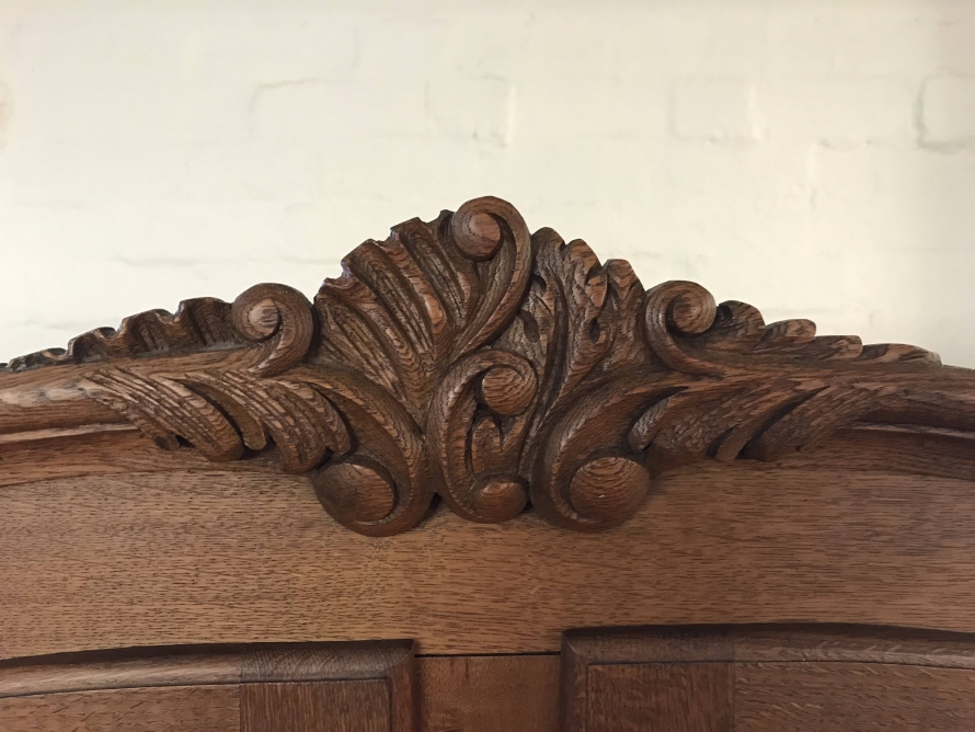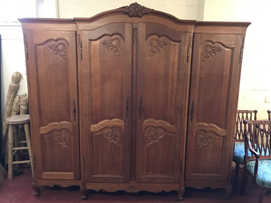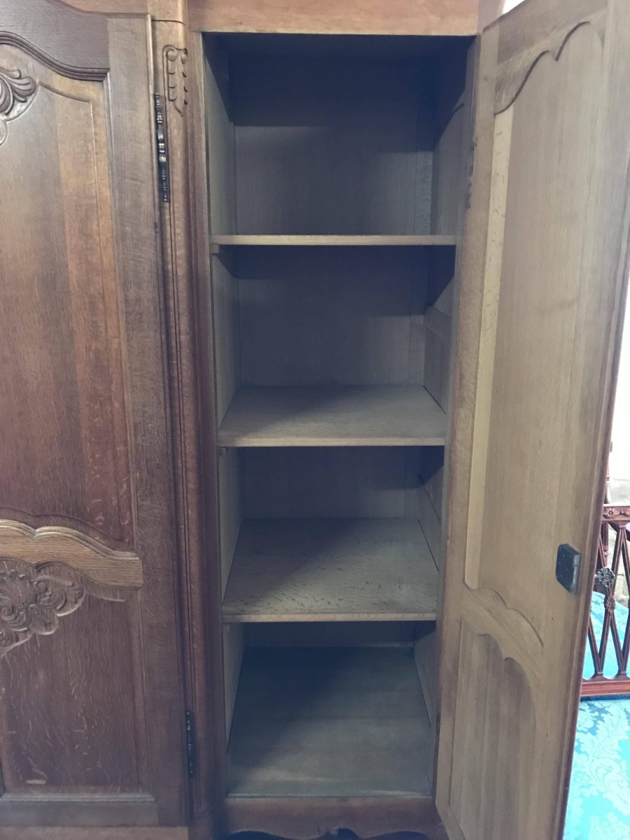 The beautifully shaped top rises to a central carving. The breakfront armoire has four carved oak panelled doors with ornate brass escutcheon, hinges and key. The left hand and two central breakfront doors open to reveal a full length hanging rail and a full length dressing mirror on the inside of the left hand door. The right hand door opens to reveal three removable/adjustable shelves.