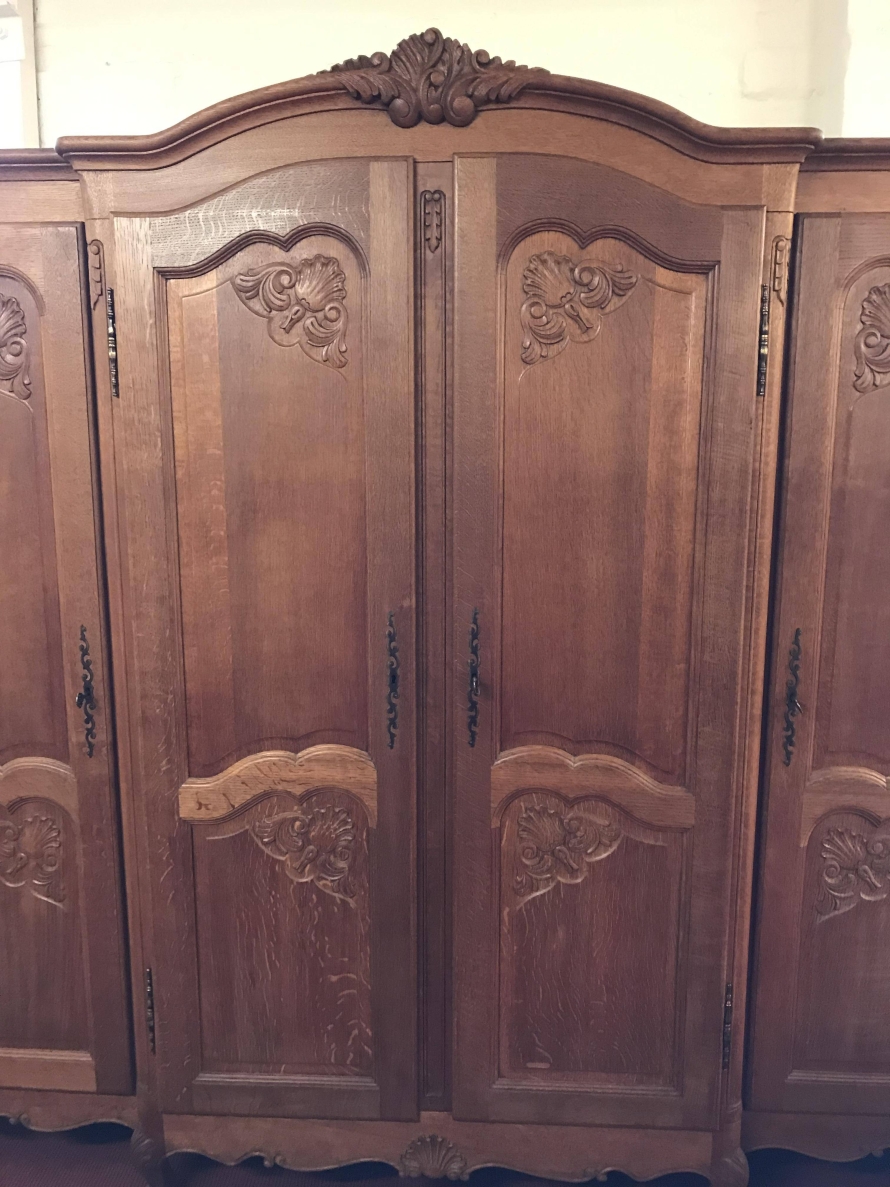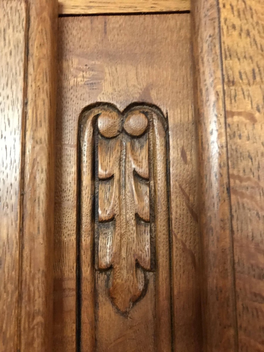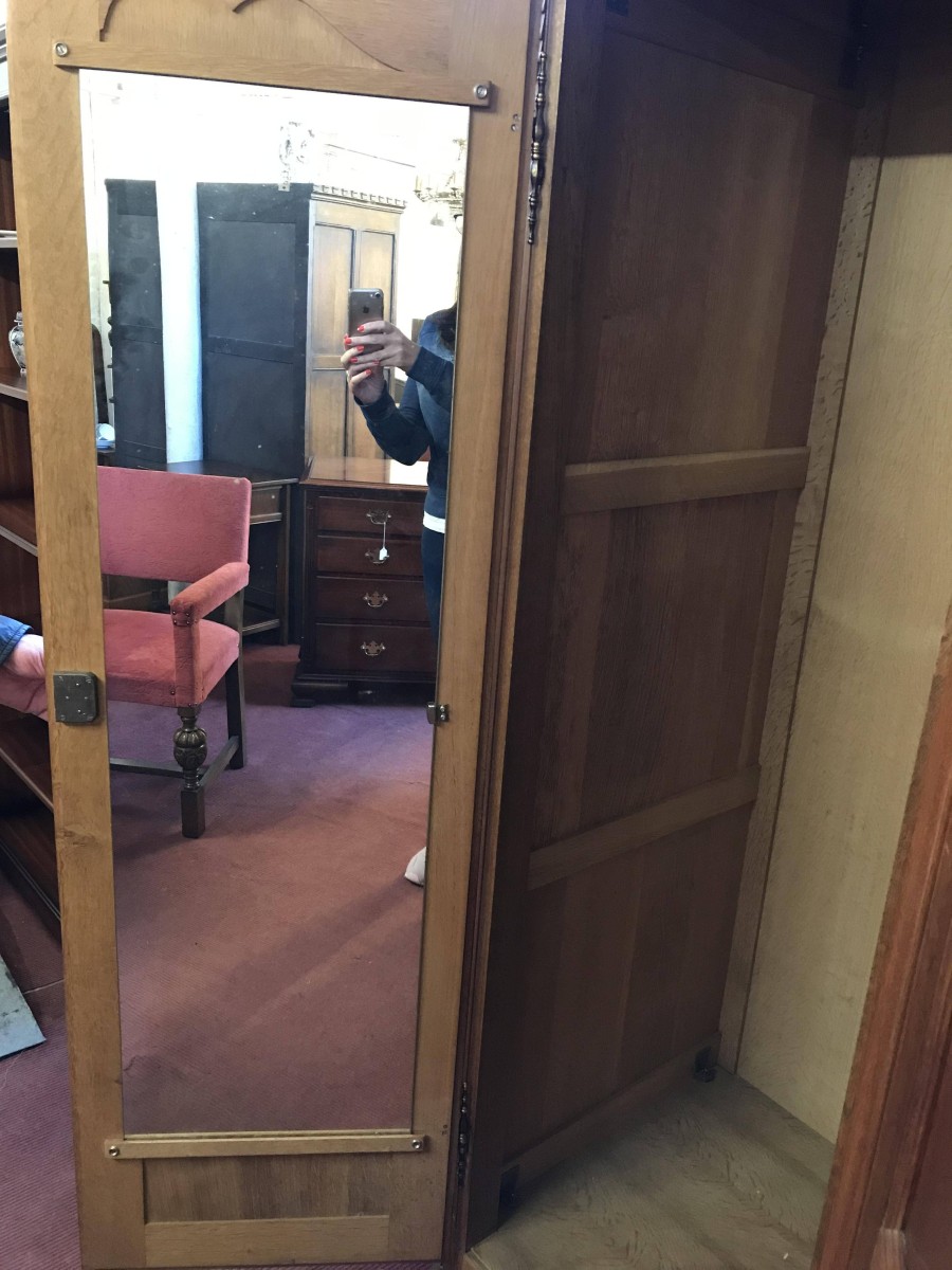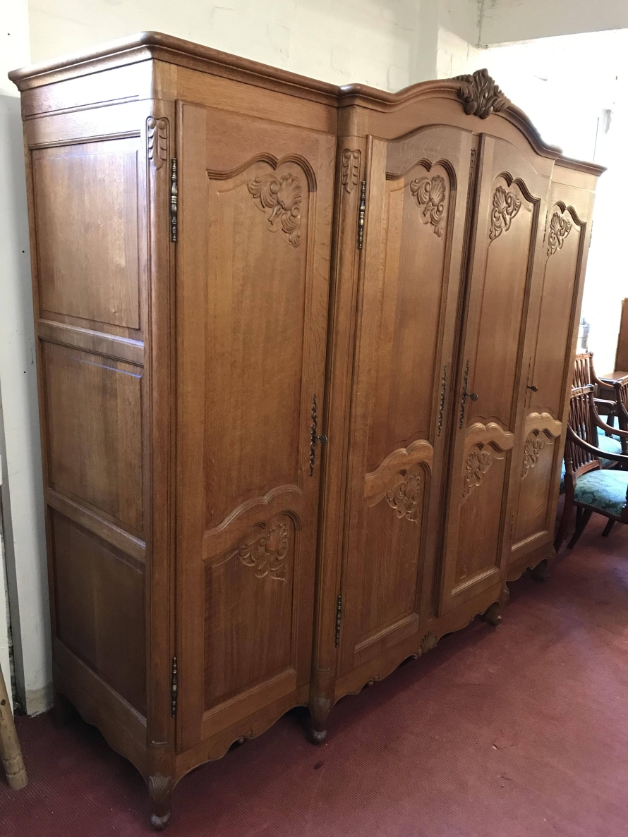 The beautifully shaped top rises to a central carving. The breakfront armoire has four carved oak panelled doors with ornate brass escutcheon, hinges and key. The left hand and two central breakfront doors open to reveal a full length hanging rail and a full length dressing mirror on the inside of the left hand door. The right hand door opens to reveal three removable/adjustable shelves.