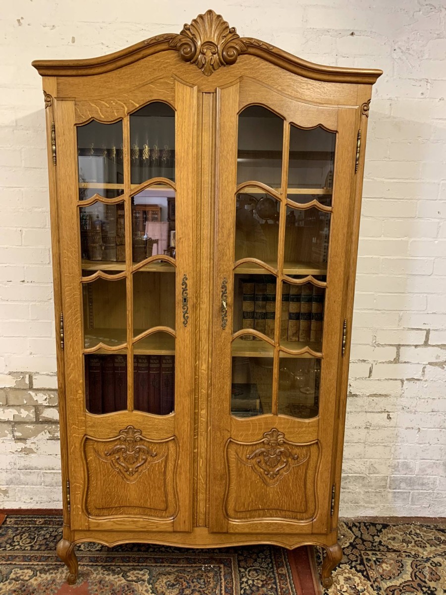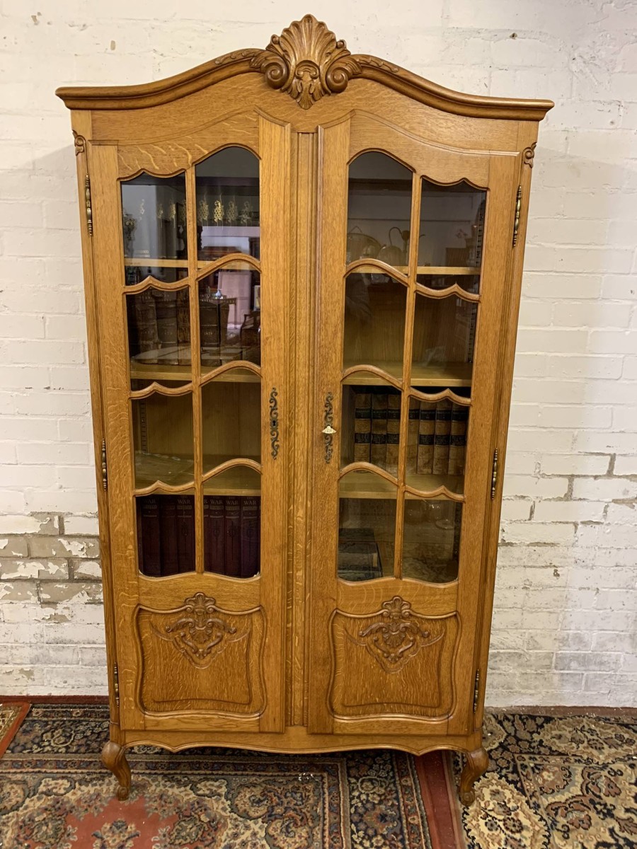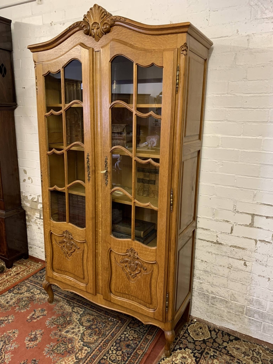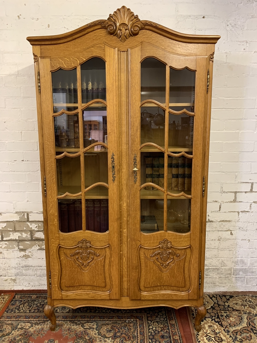 The bookcase made in striking oak and is in excellent condition. The shaped oversailing top rises to a decorative central carving. Below are a pair of lockable doors each door having brass hinges, and brass escutcheons. The doors have a carved recess panel to the base and glazing with decorative ward barring. The doors open to reveal four adjustable / removable shelves. Recessed panelled sides shaped skirt this fantastic French bookcase stands on two carved cabriole shaped legs to the front.