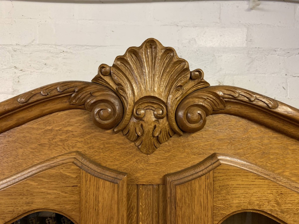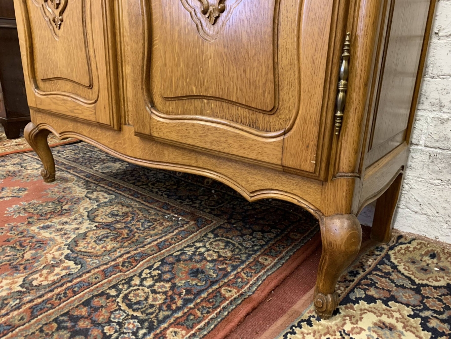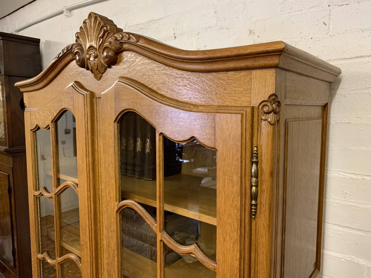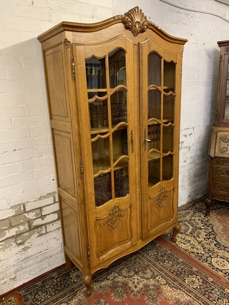 The bookcase made in striking oak and is in excellent condition. The shaped oversailing top rises to a decorative central carving. Below are a pair of lockable doors each door having brass hinges, and brass escutcheons. The doors have a carved recess panel to the base and glazing with decorative ward barring. The doors open to reveal four adjustable / removable shelves. Recessed panelled sides shaped skirt this fantastic French bookcase stands on two carved cabriole shaped legs to the front.
