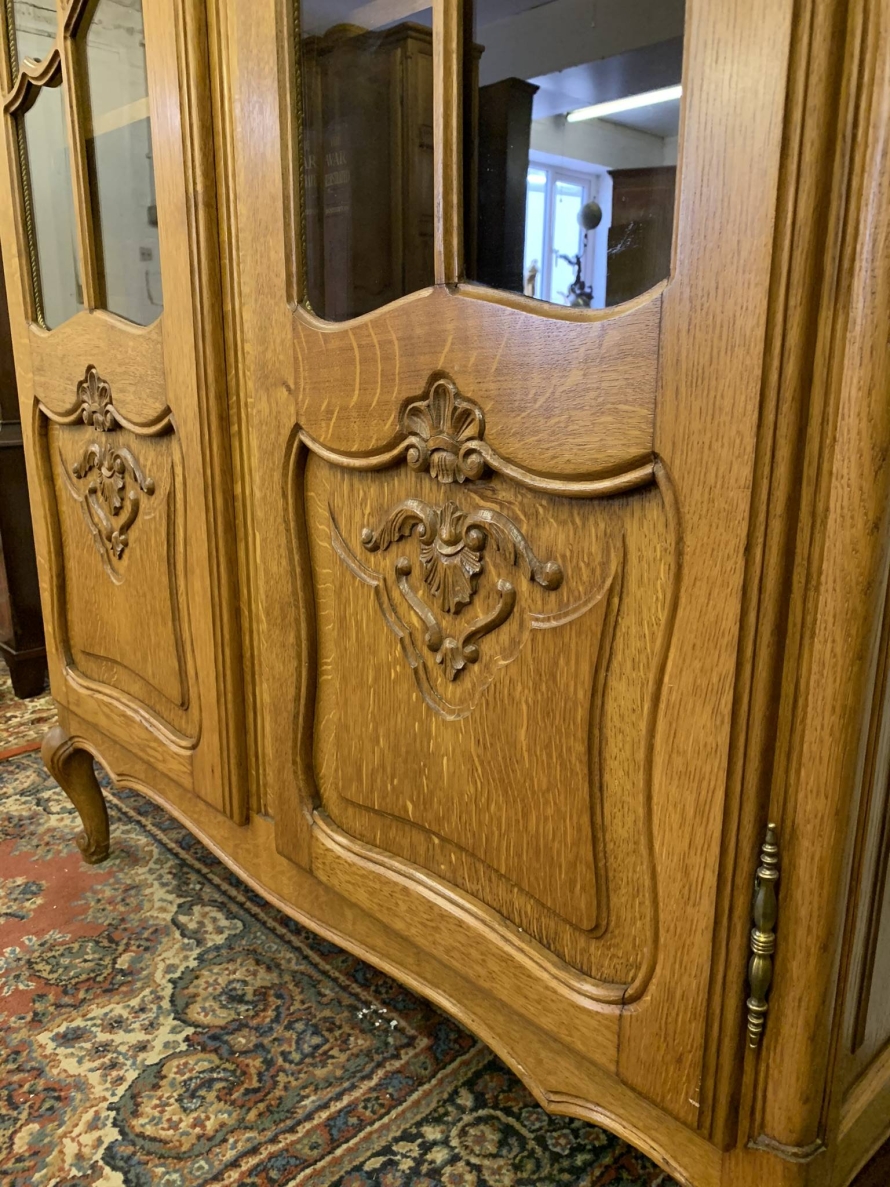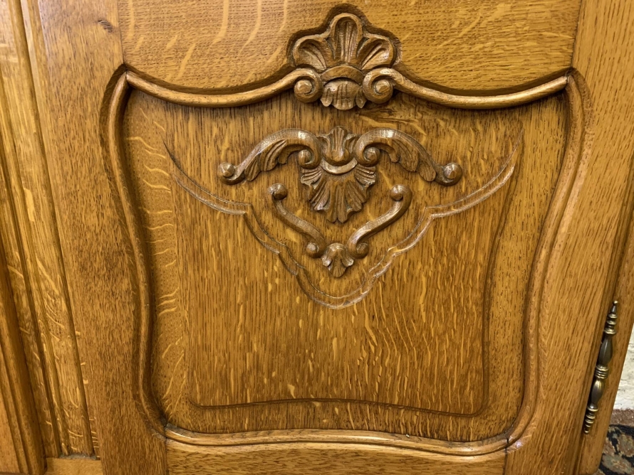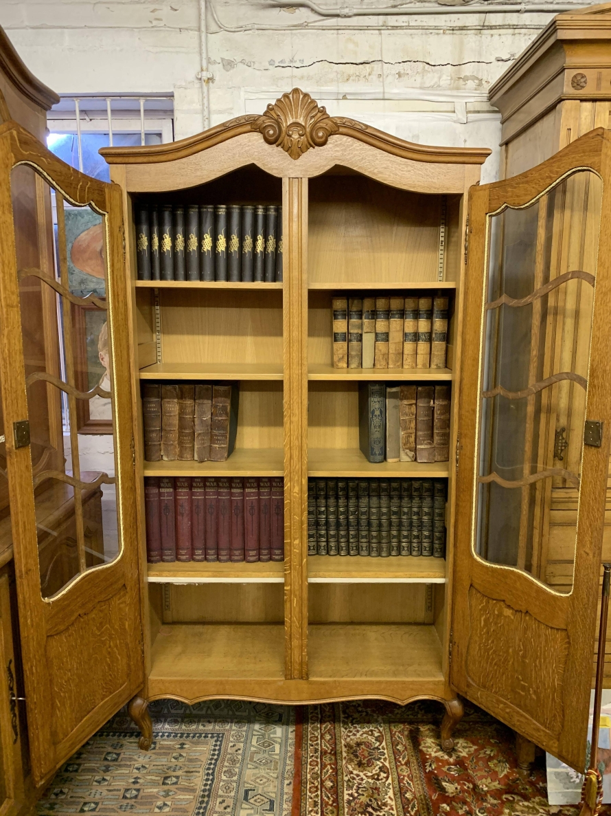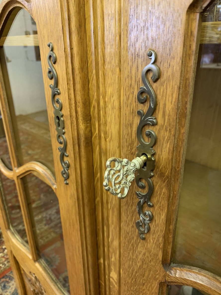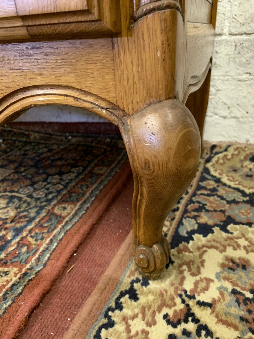 The bookcase made in striking oak and is in excellent condition. The shaped oversailing top rises to a decorative central carving. Below are a pair of lockable doors each door having brass hinges, and brass escutcheons. The doors have a carved recess panel to the base and glazing with decorative ward barring. The doors open to reveal four adjustable / removable shelves. Recessed panelled sides shaped skirt this fantastic French bookcase stands on two carved cabriole shaped legs to the front.