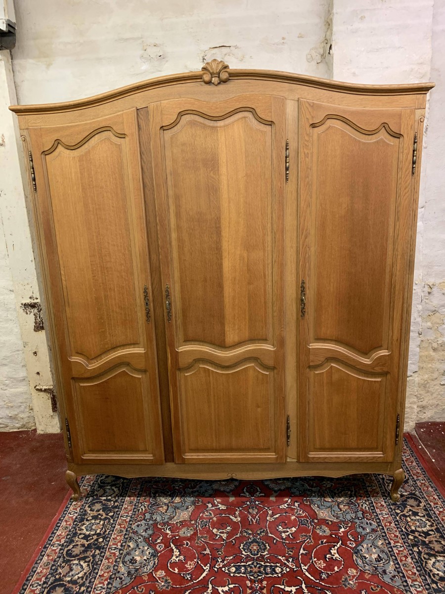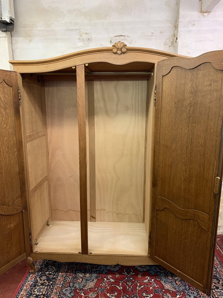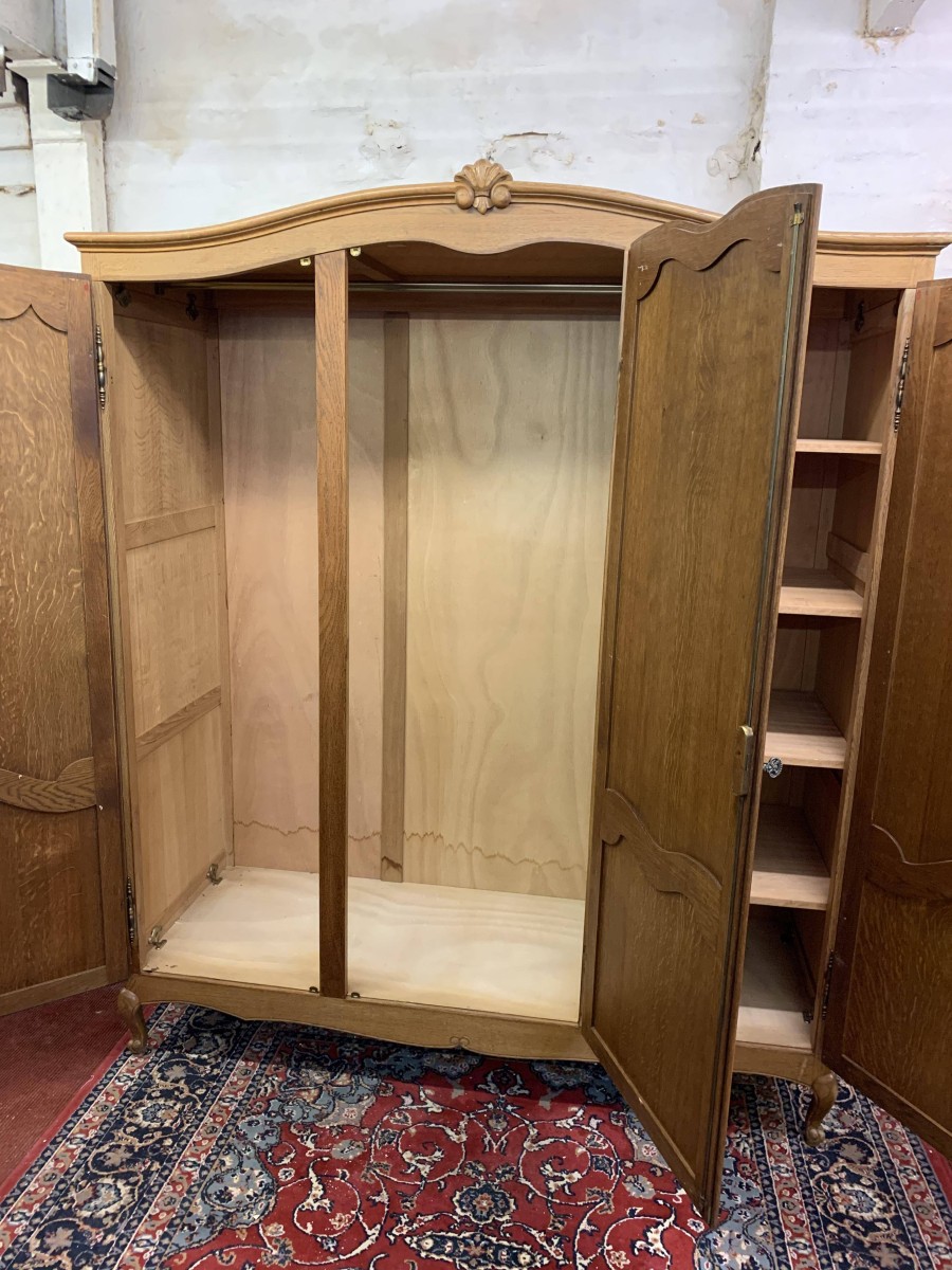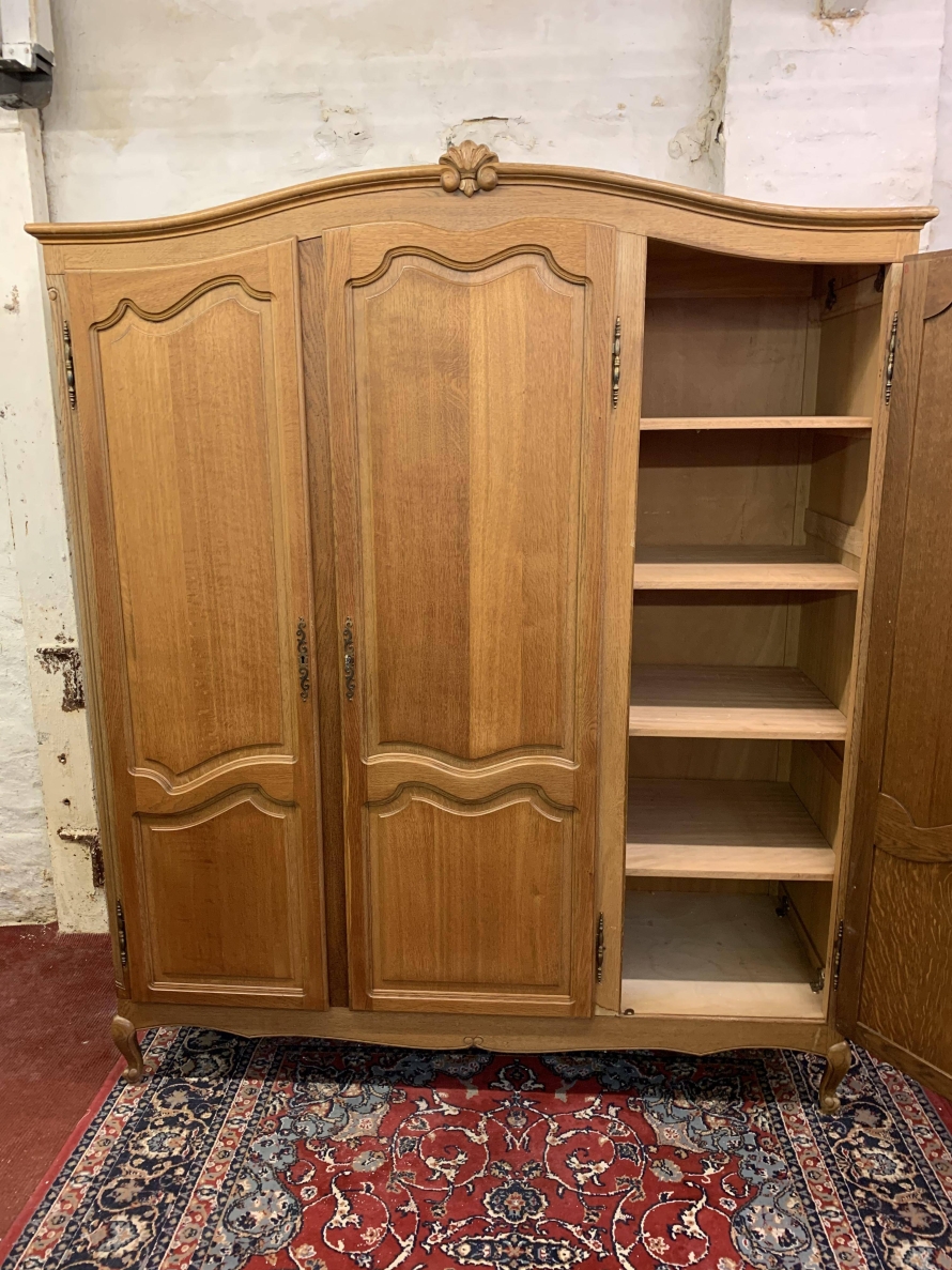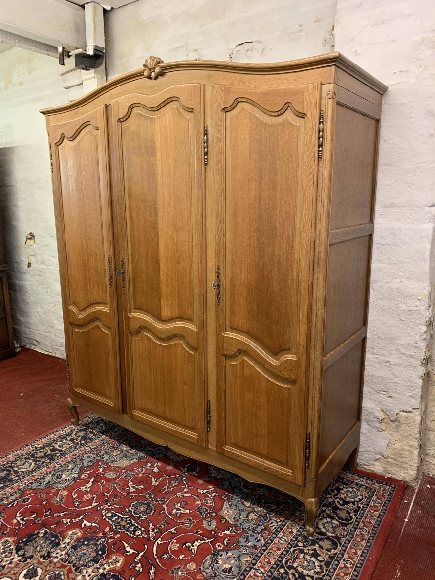 The shaped oversailing top rises to a central ornate carving. Below are three shaped recessed panelled lockable doors, each door having brass hinges and decorative brass escutcheon. The left-hand door and central door open to reveal a brass hanging rail. The right-hand door opens to reveal four removable shelves. Recessed panelled sides shaped skirt, this fantastic French armoire stands on two carved shaped cabriole legs to the front.
