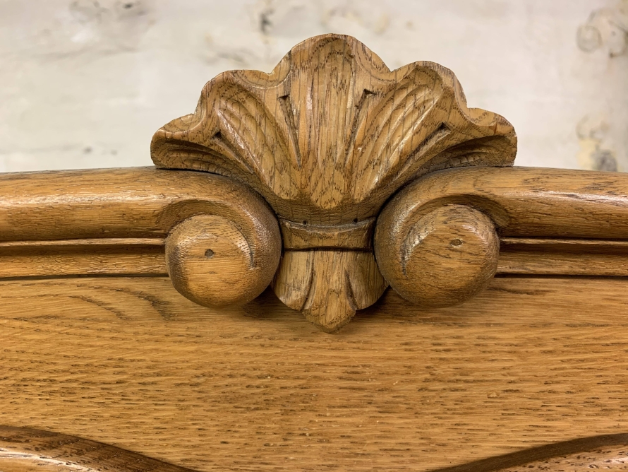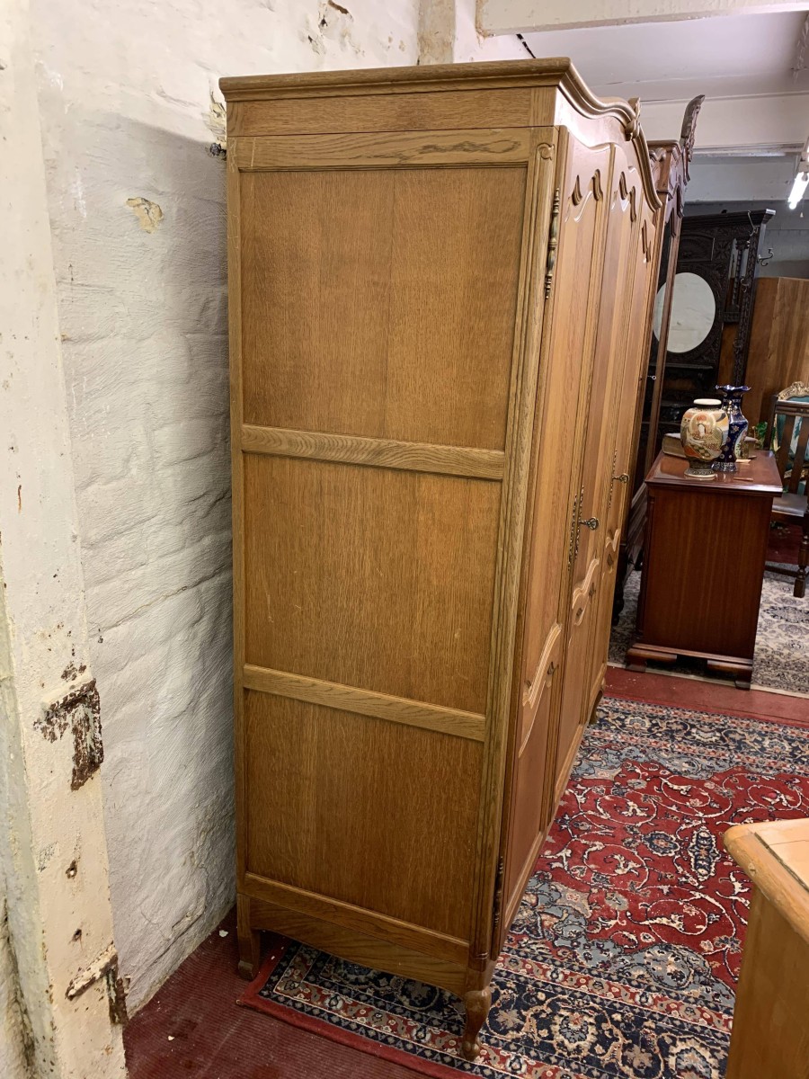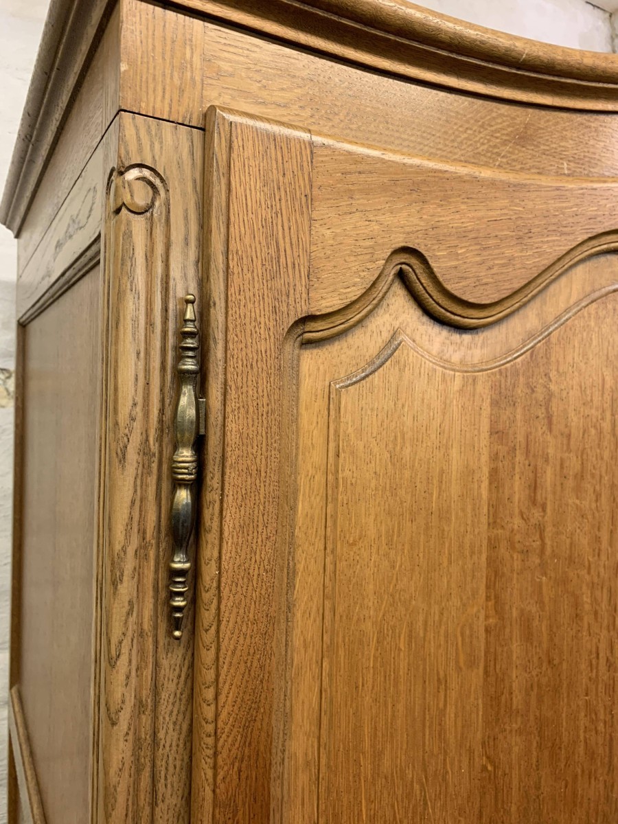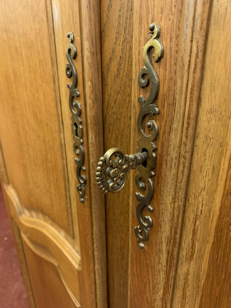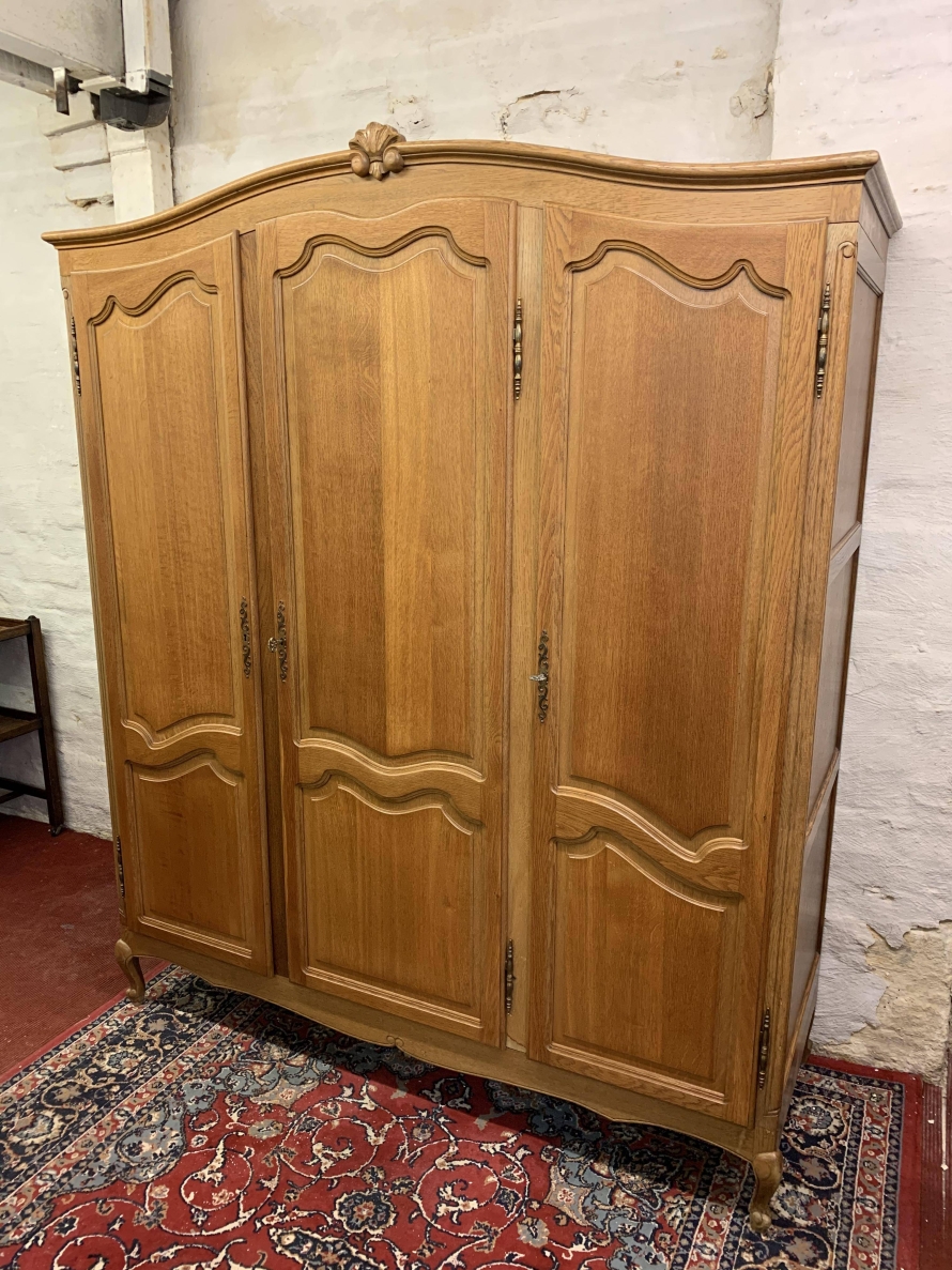 The shaped oversailing top rises to a central ornate carving. Below are three shaped recessed panelled lockable doors, each door having brass hinges and decorative brass escutcheon. The left-hand door and central door open to reveal a brass hanging rail. The right-hand door opens to reveal four removable shelves. Recessed panelled sides shaped skirt, this fantastic French armoire stands on two carved shaped cabriole legs to the front.