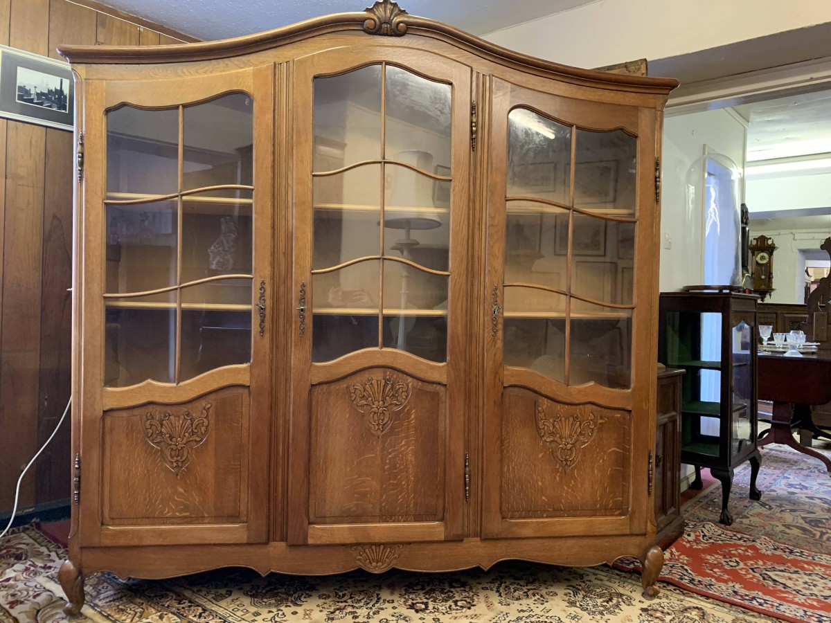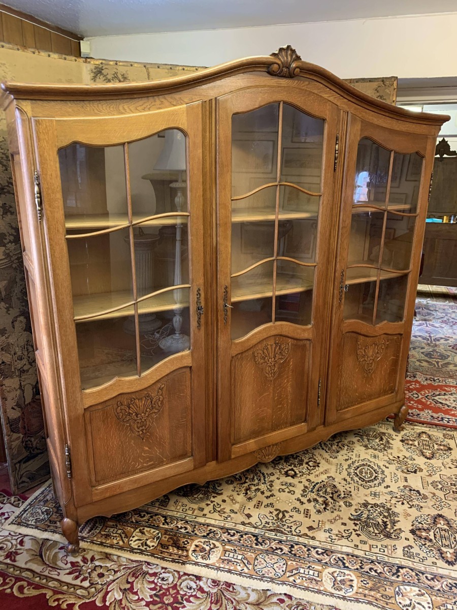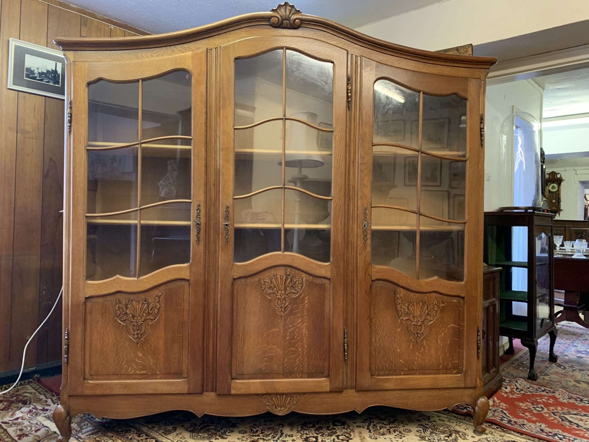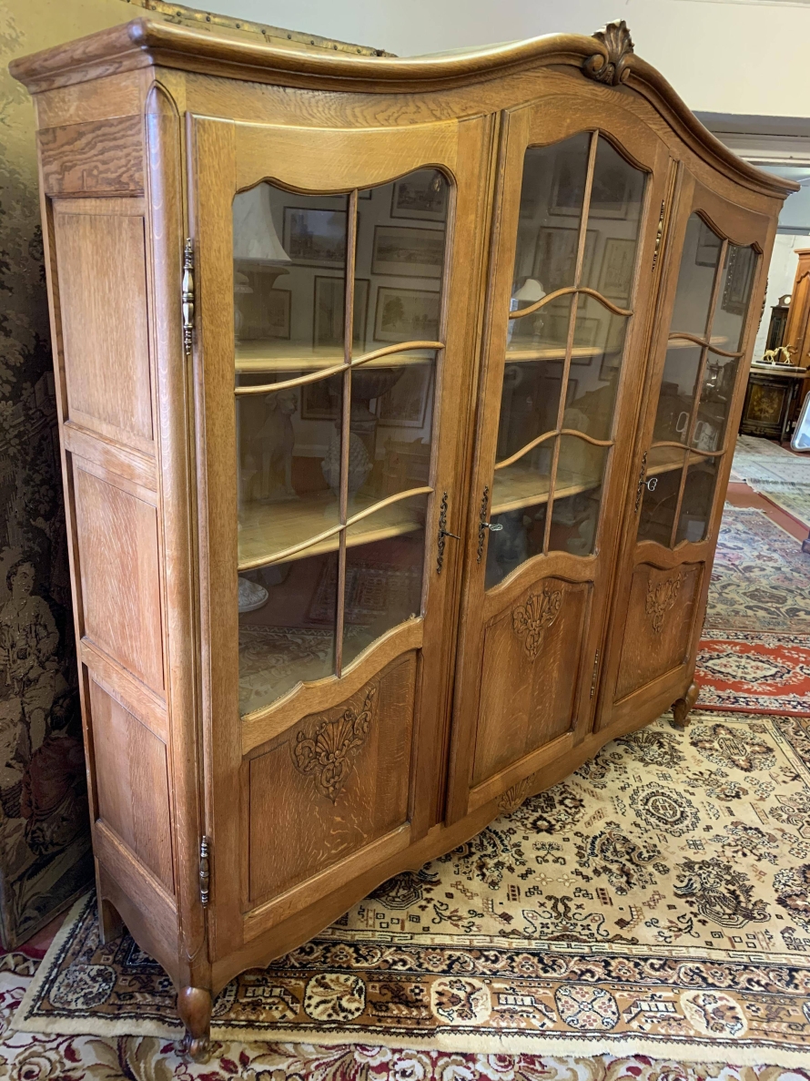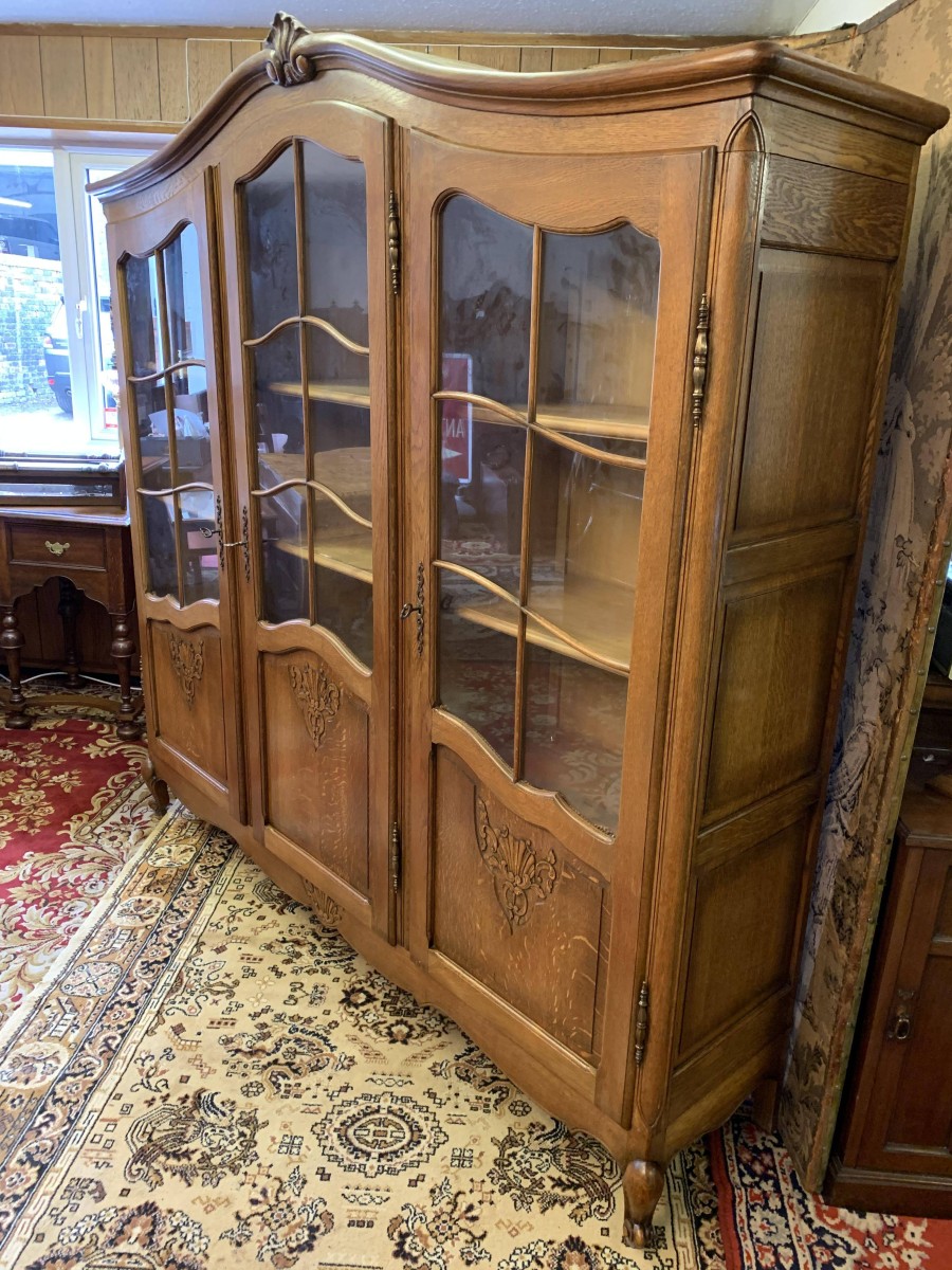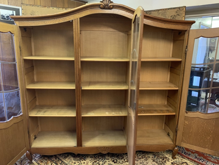 The shaped over sailing top rises to a decorative ornate carving. Below are three lockable glazed and panelled doors, each door having brass hinges,key and decorative escutcheon. The doors are glazed to the top with wood barring, to the bottom are carved recess panels. Each door opens to reveal three removable shelves. Recessed panelled sides, shaped skirt with central carved decoration, this elegant bookcase stands proud on two carved cabriole legs to the front.