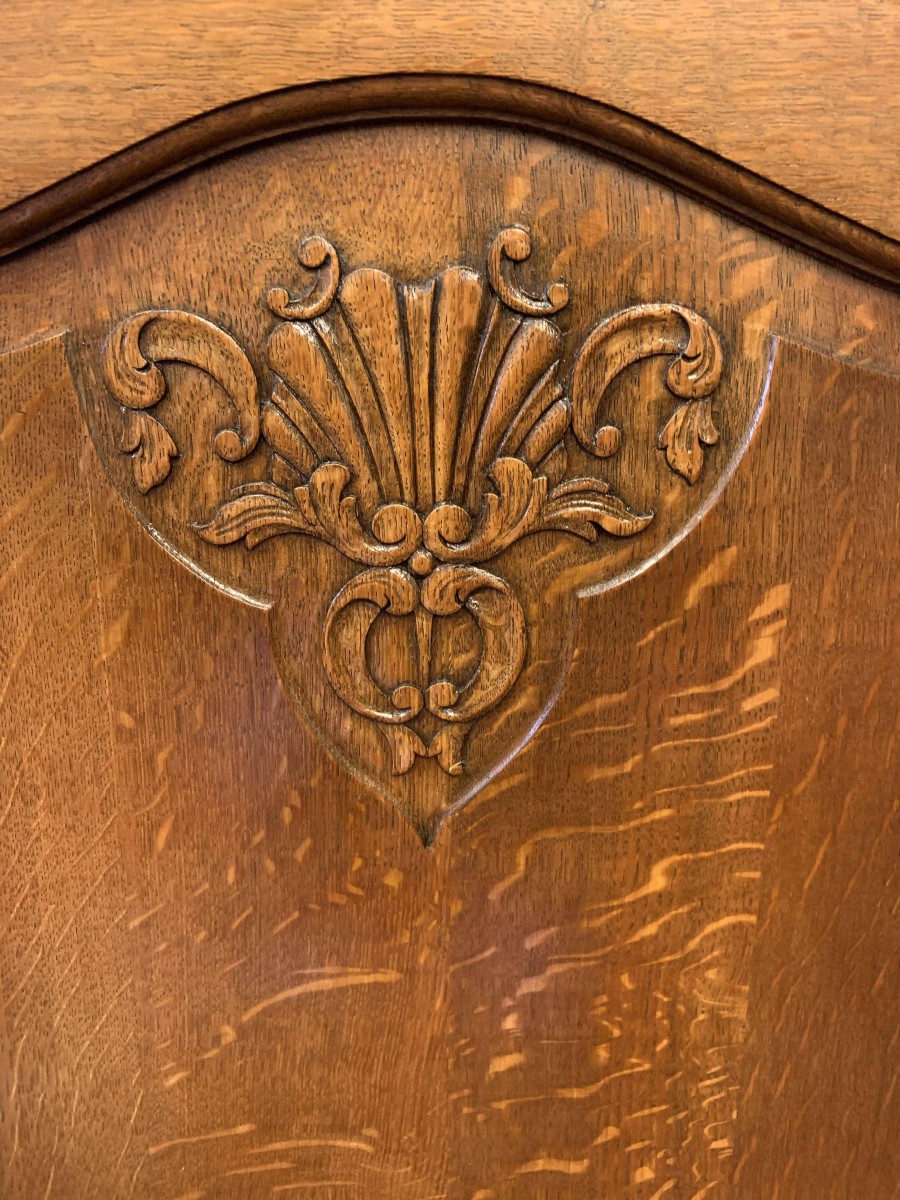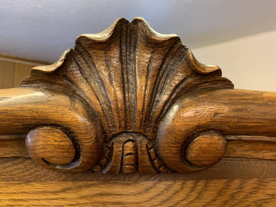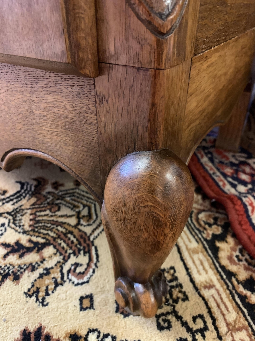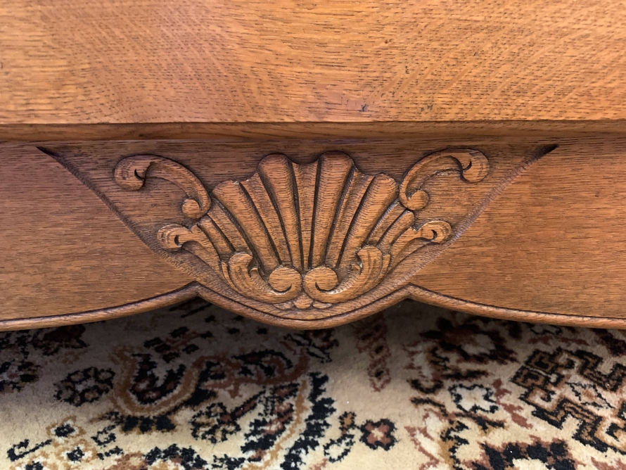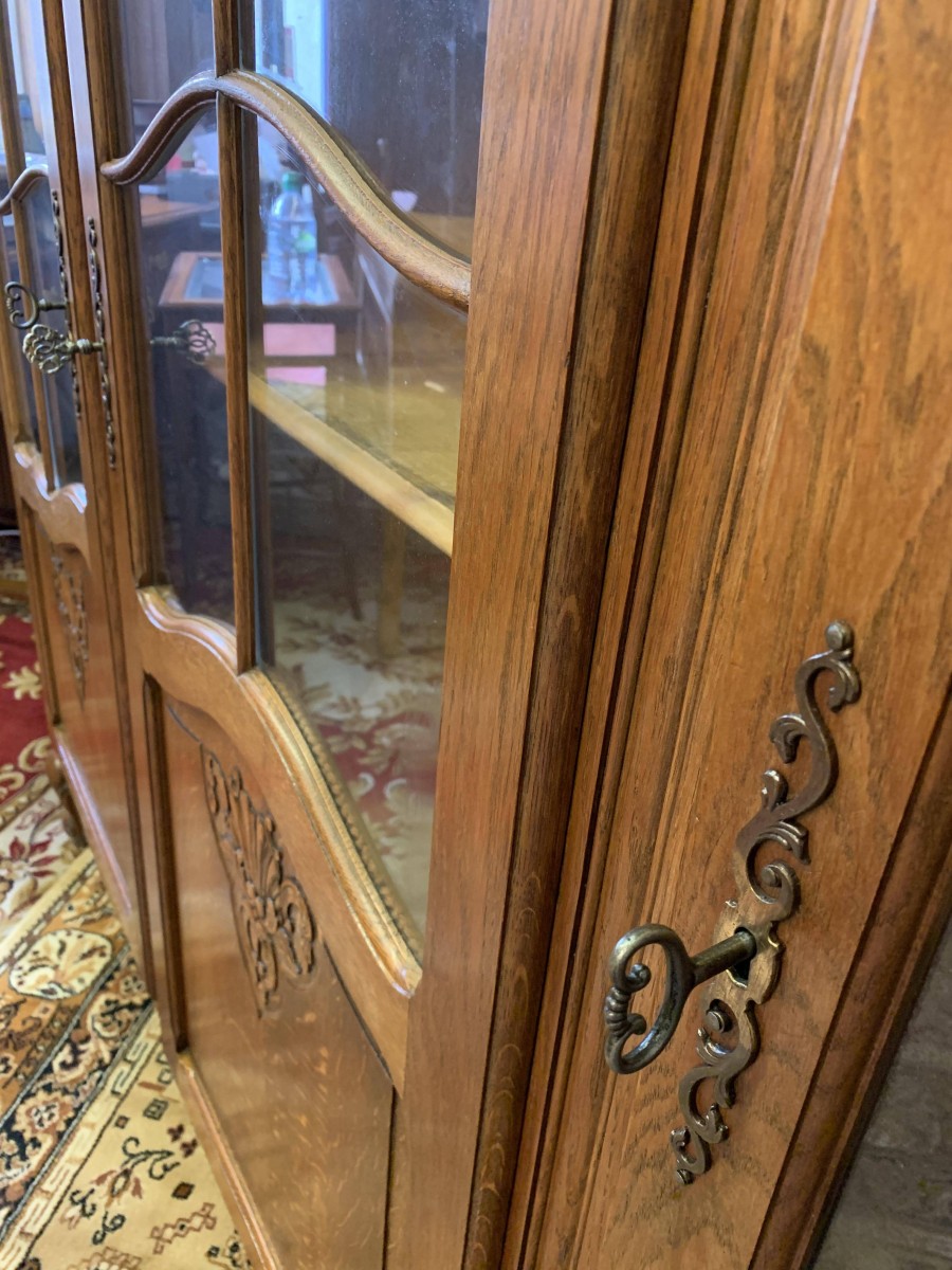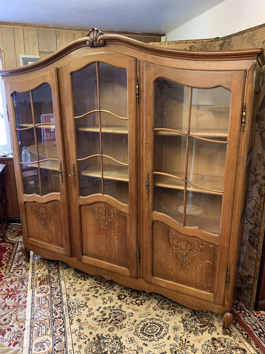 The shaped over sailing top rises to a decorative ornate carving. Below are three lockable glazed and panelled doors, each door having brass hinges,key and decorative escutcheon. The doors are glazed to the top with wood barring, to the bottom are carved recess panels. Each door opens to reveal three removable shelves. Recessed panelled sides, shaped skirt with central carved decoration, this elegant bookcase stands proud on two carved cabriole legs to the front.