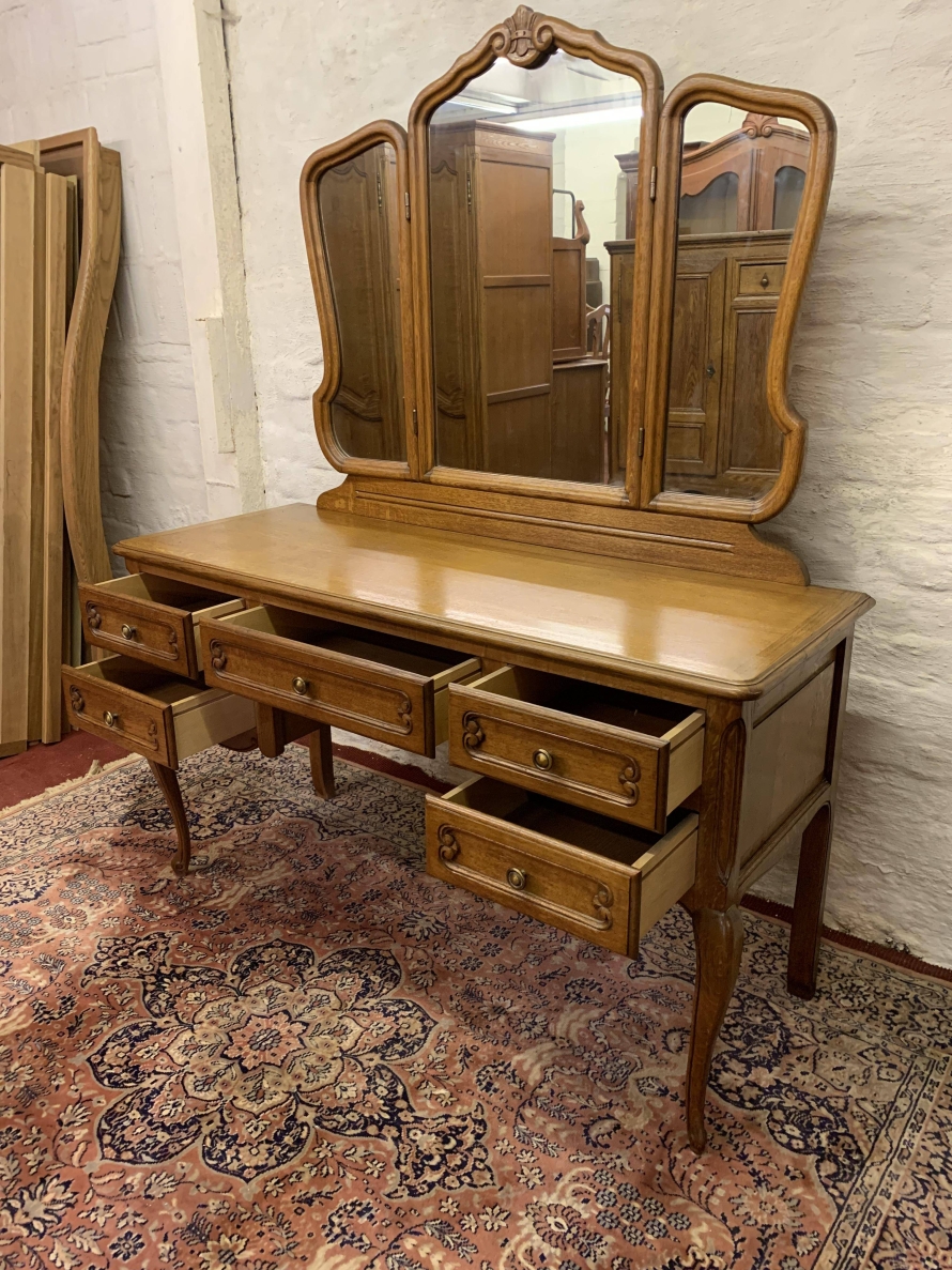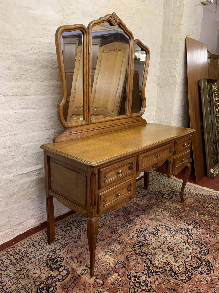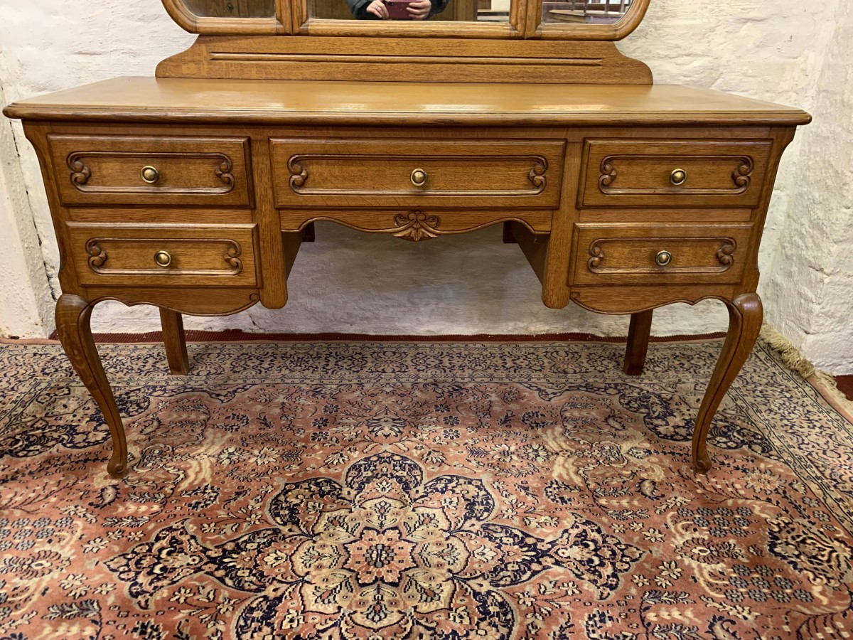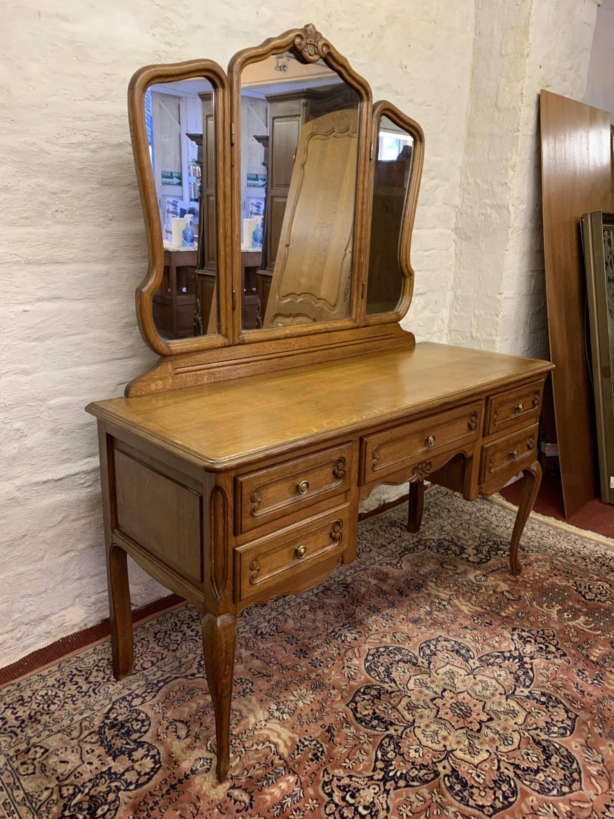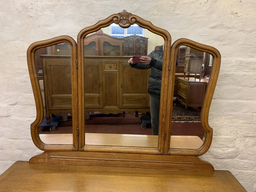 The fixed central mirror rises to a decorative central carving. This mirror is flanked by a pair of shaped adjustable side mirrors. The dressing table has a oversailing top which sits above a central carved recessed panelled central drawer with decorative carving below. The central drawer is flanked by a pair of carved recessed panelled drawers, each drawer having a brass pull handle. Recessed panelled sides, shaped skirt this fabulous dressing table which is in excellent condition stands on two carved cabriole shaped legs to the front.