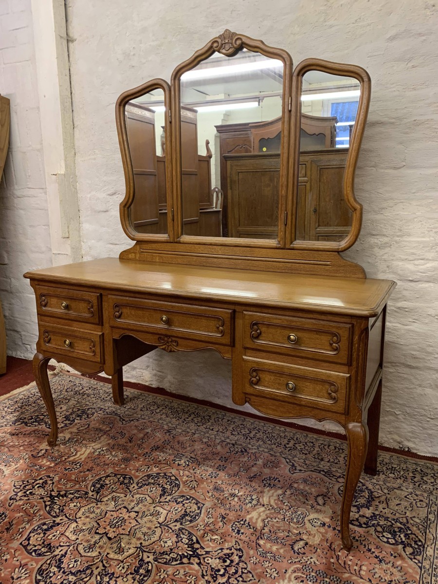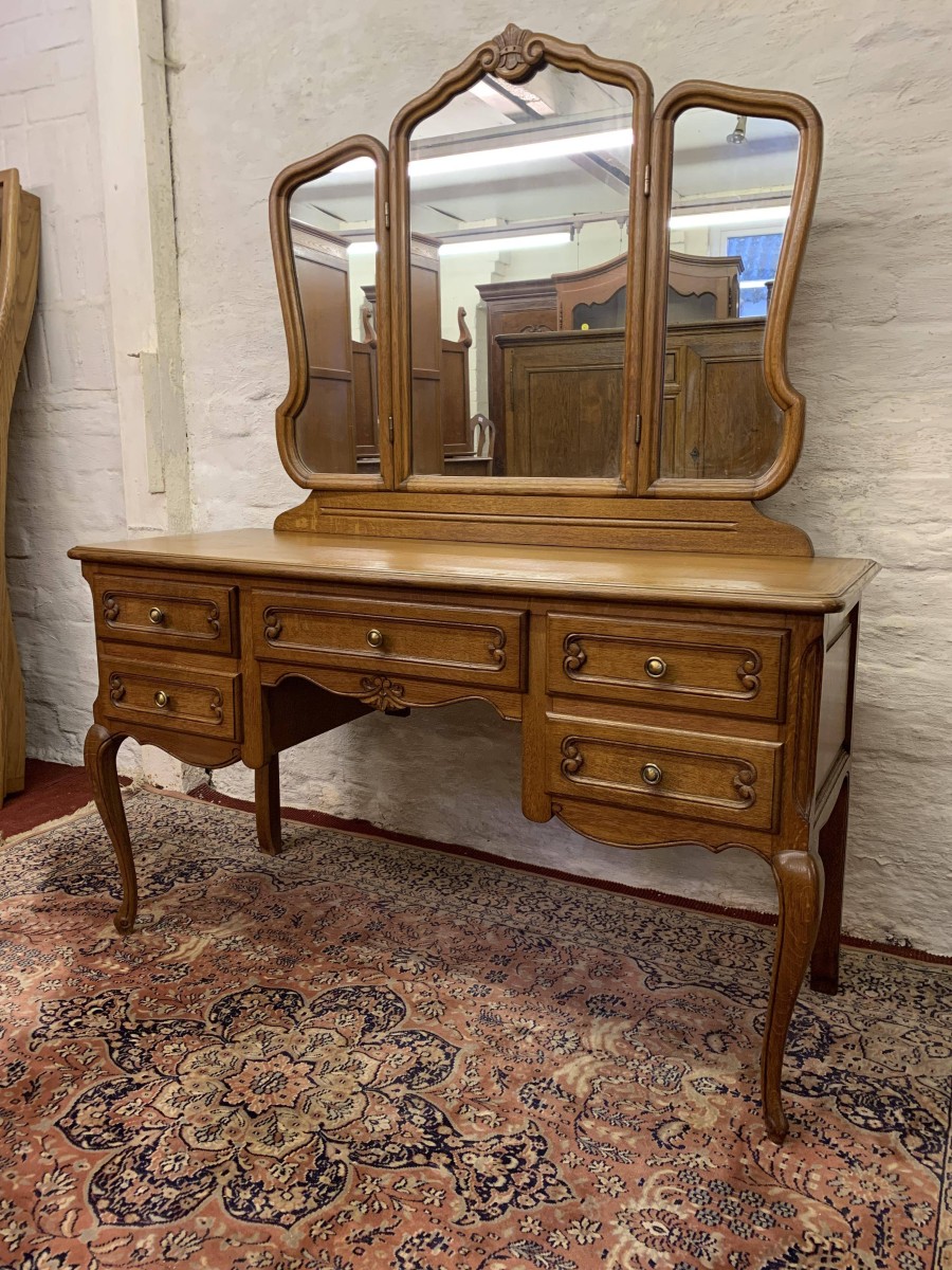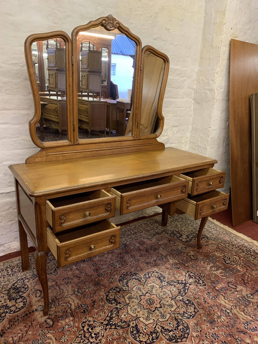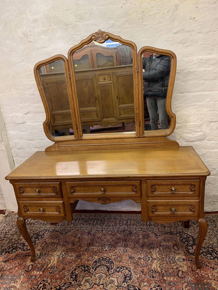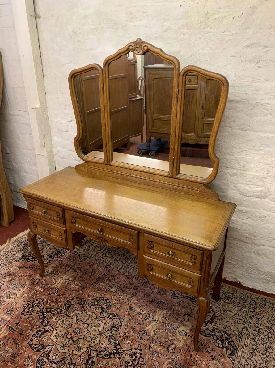 The fixed central mirror rises to a decorative central carving. This mirror is flanked by a pair of shaped adjustable side mirrors. The dressing table has a oversailing top which sits above a central carved recessed panelled central drawer with decorative carving below. The central drawer is flanked by a pair of carved recessed panelled drawers, each drawer having a brass pull handle. Recessed panelled sides, shaped skirt this fabulous dressing table which is in excellent condition stands on two carved cabriole shaped legs to the front.