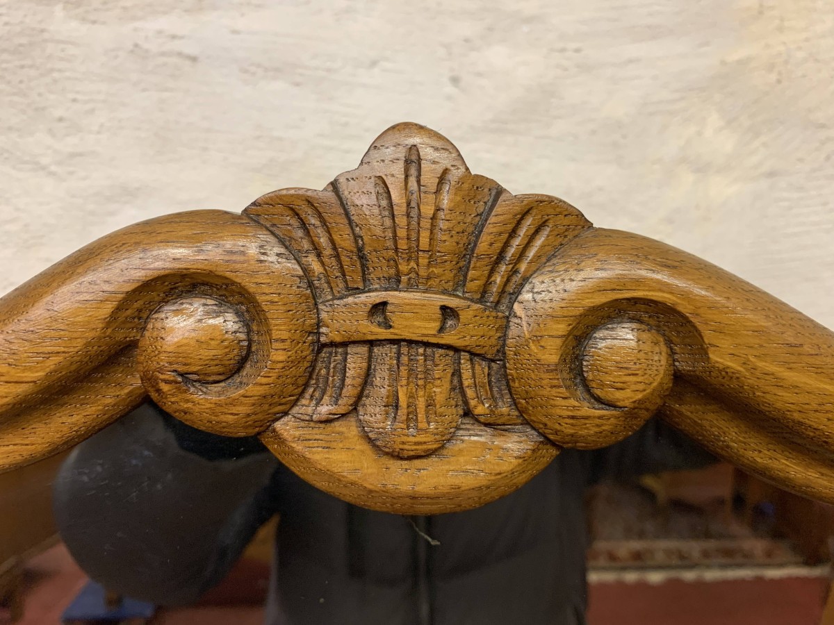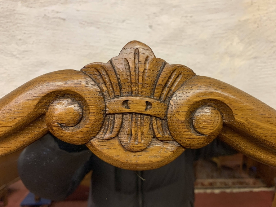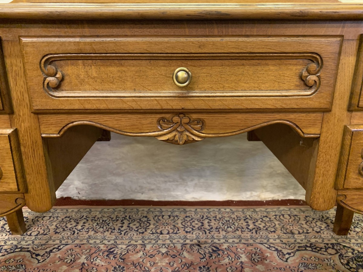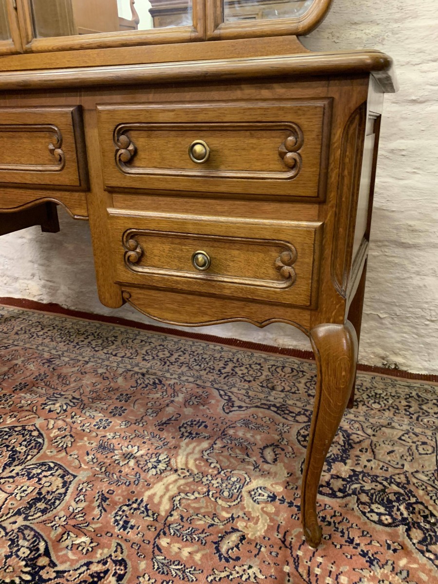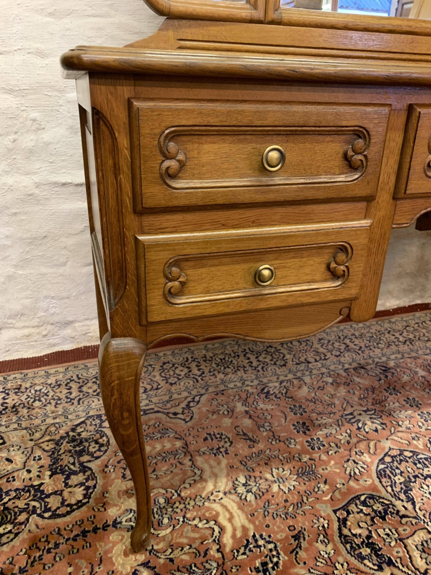 The fixed central mirror rises to a decorative central carving. This mirror is flanked by a pair of shaped adjustable side mirrors. The dressing table has a oversailing top which sits above a central carved recessed panelled central drawer with decorative carving below. The central drawer is flanked by a pair of carved recessed panelled drawers, each drawer having a brass pull handle. Recessed panelled sides, shaped skirt this fabulous dressing table which is in excellent condition stands on two carved cabriole shaped legs to the front.