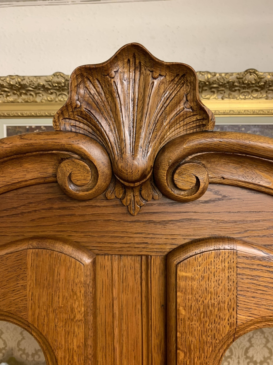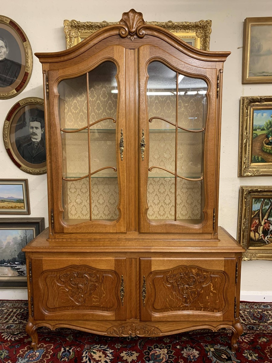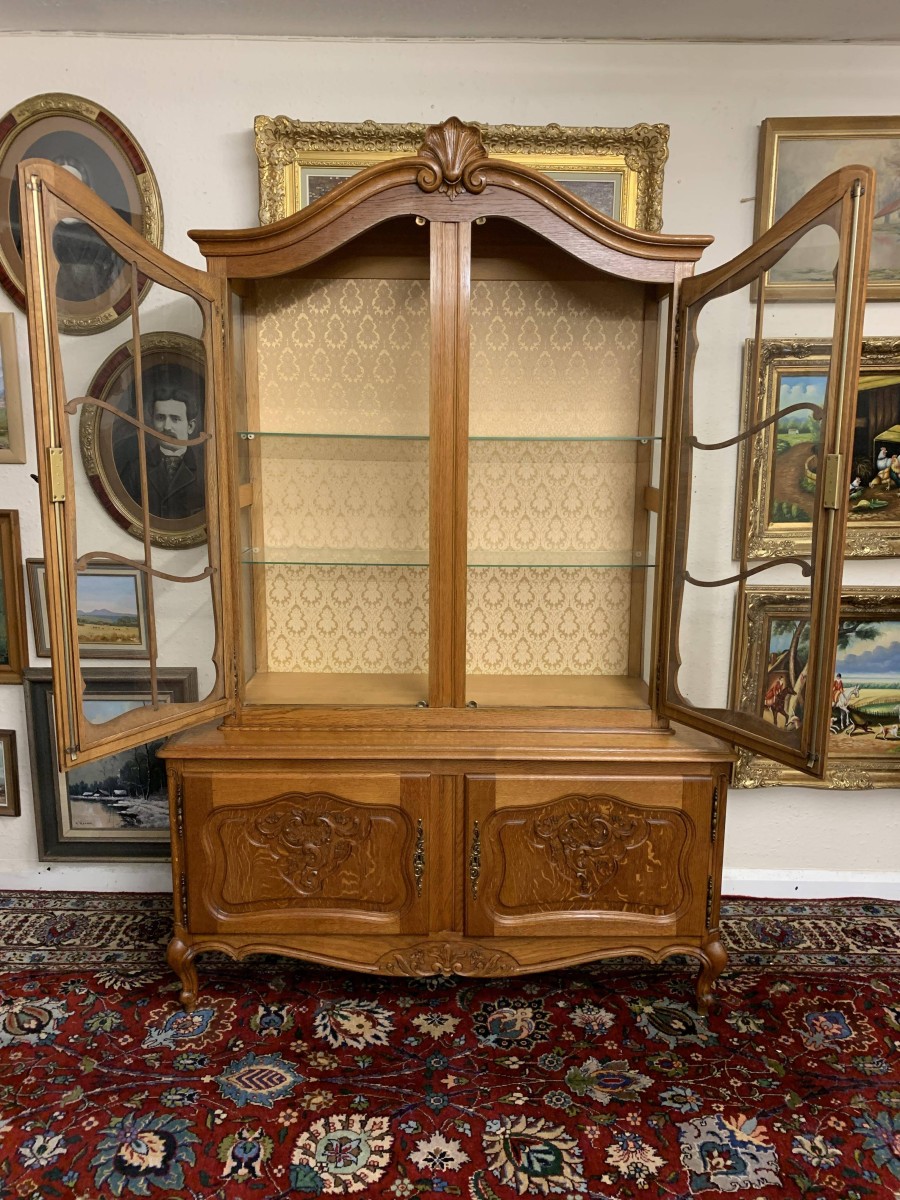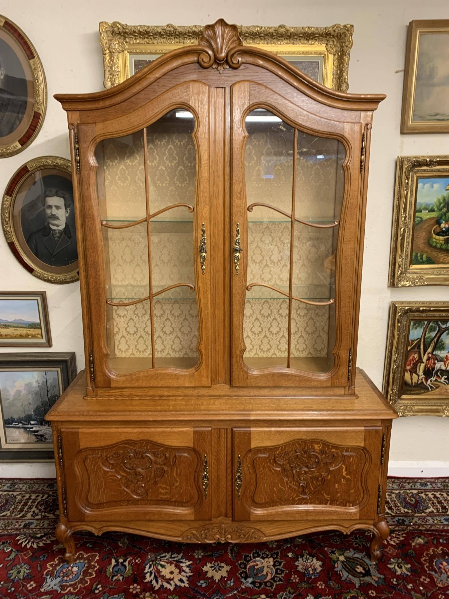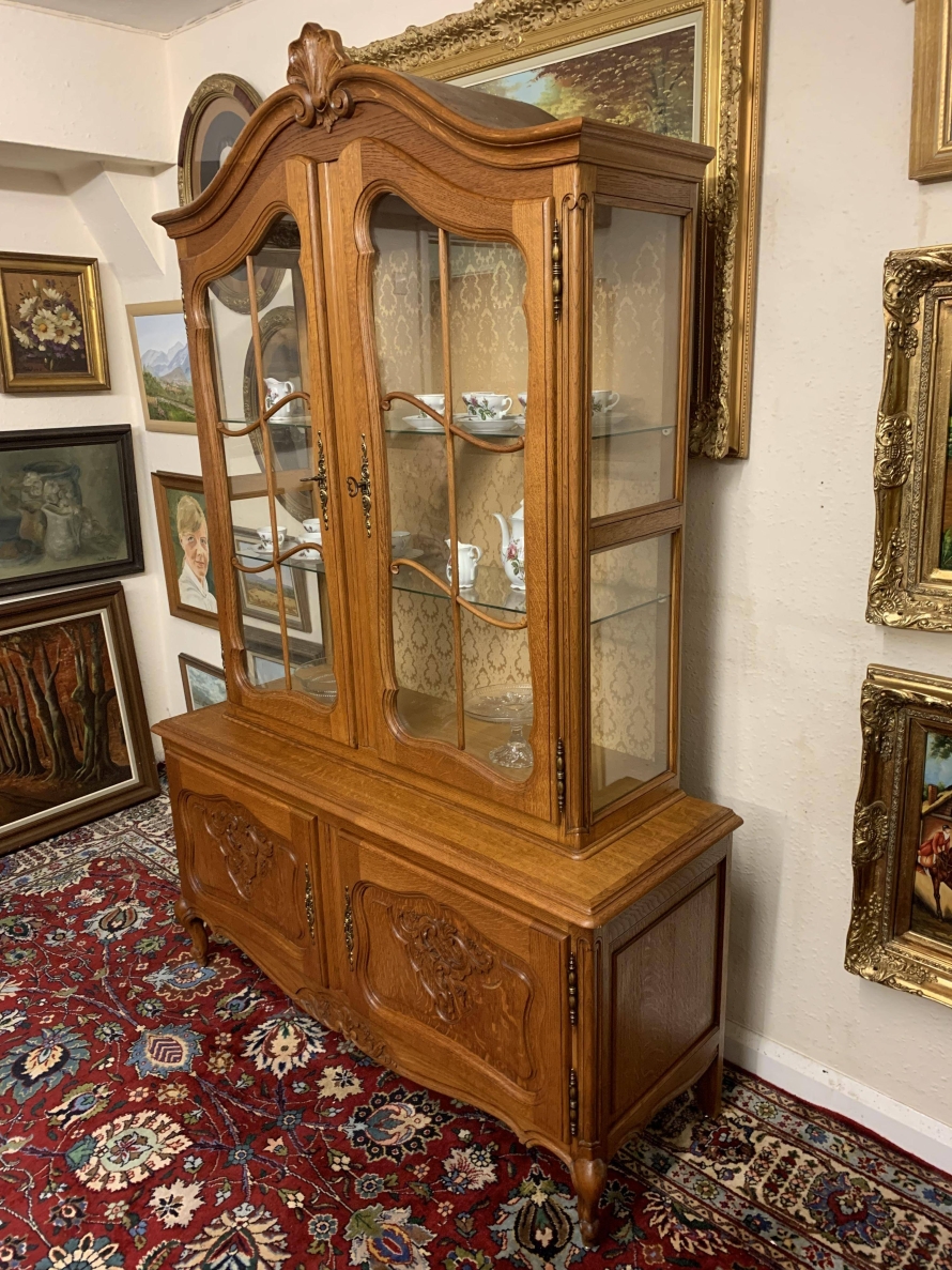 The oversailing top rises to an impressive central carving. Below are a pair of lockable shaped glazed doors, each door having brass hinges, brass escutcheon, brass key and decorative wood barring. The doors open to reveal two removable glass shelves. Below are a pair of lockable carved recessed panelled cupboard doors, the doors open to reveal a removable shelf. Shaped skirt with decorative central carving this elegant French oak vitrine stands on two carved cabriole shaped legs to the front.