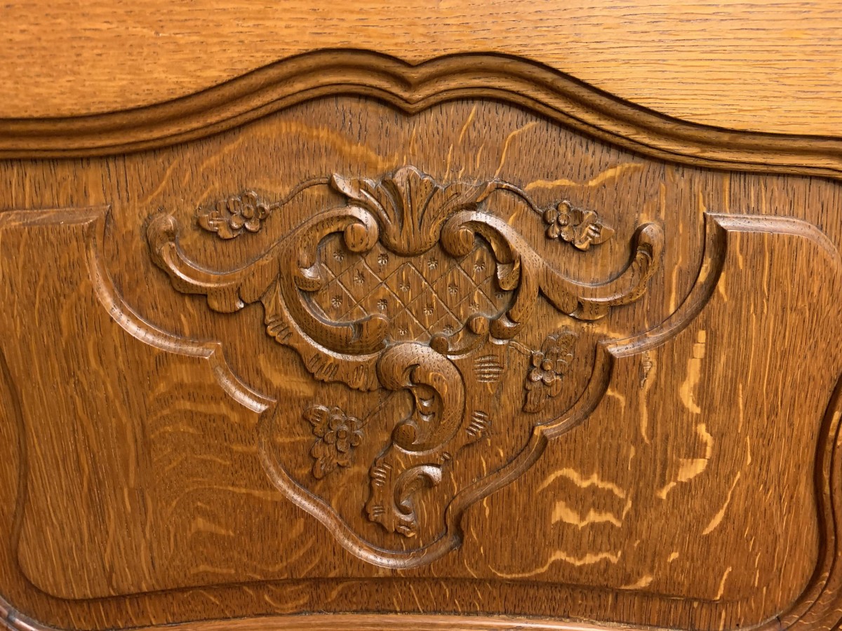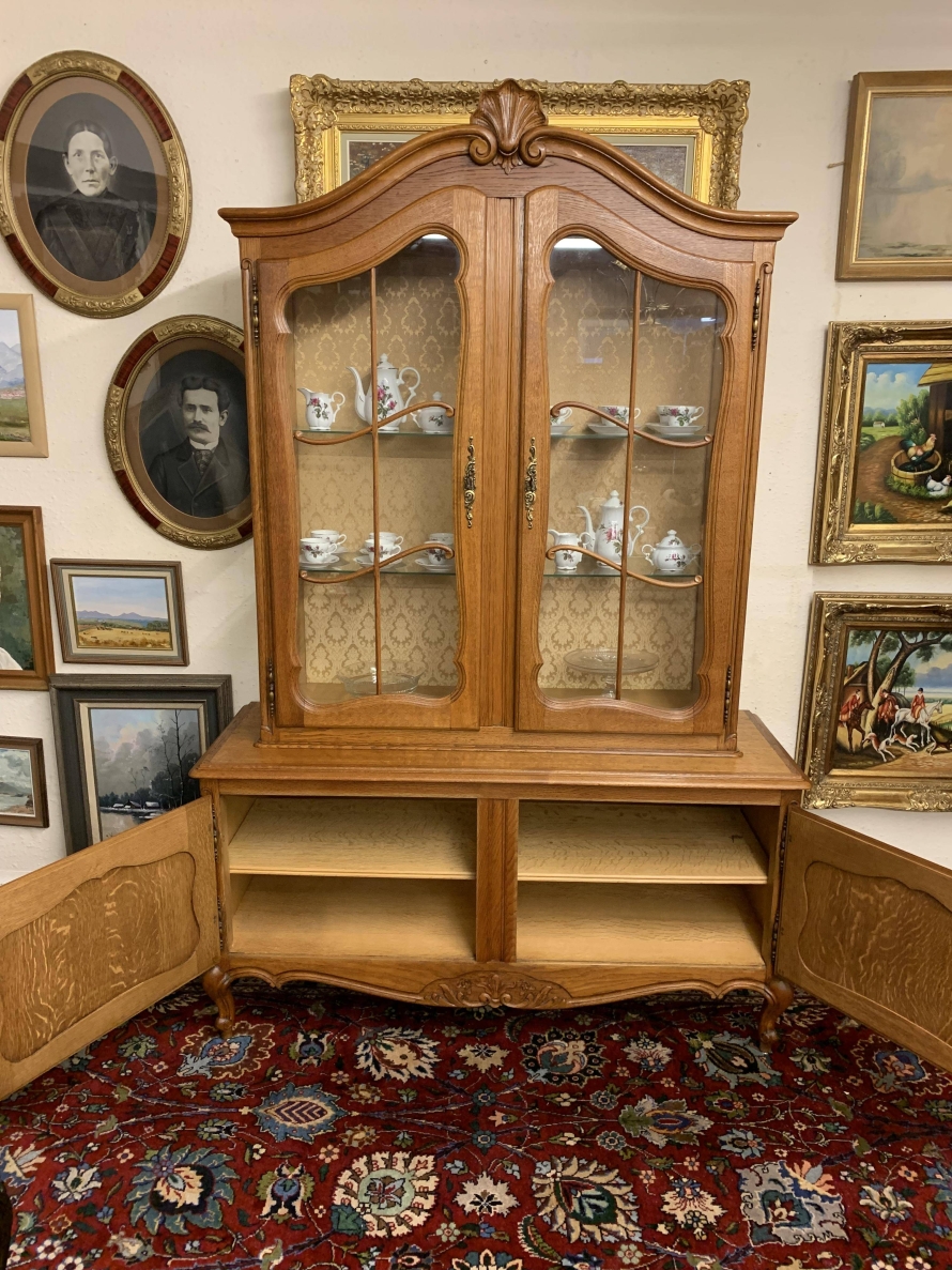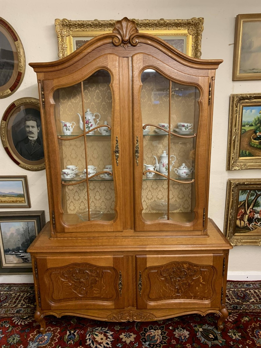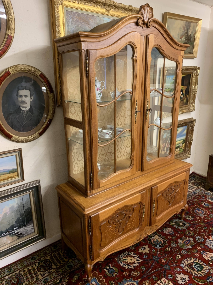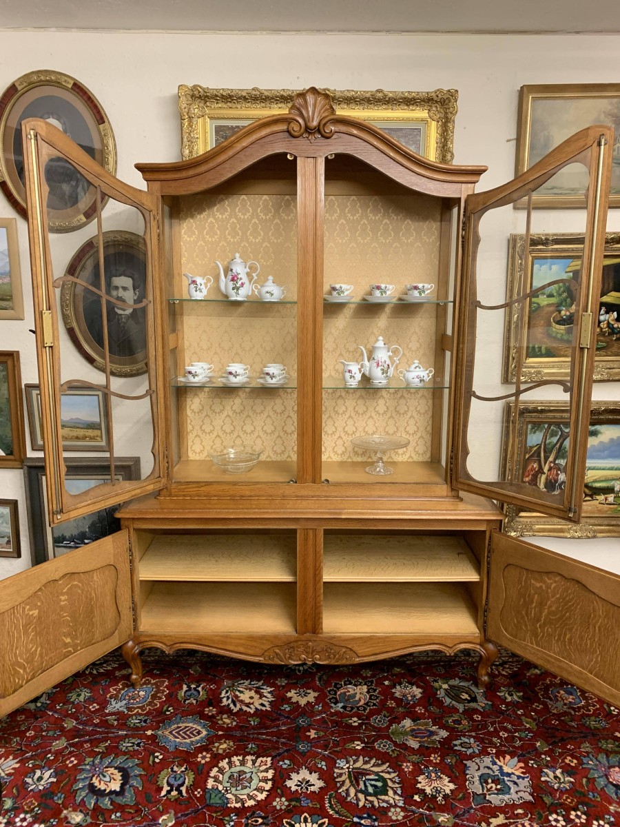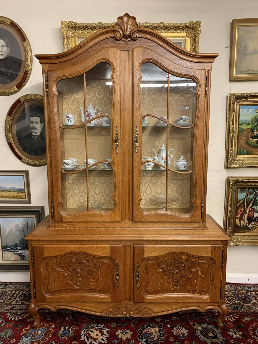 The oversailing top rises to an impressive central carving. Below are a pair of lockable shaped glazed doors, each door having brass hinges, brass escutcheon, brass key and decorative wood barring. The doors open to reveal two removable glass shelves. Below are a pair of lockable carved recessed panelled cupboard doors, the doors open to reveal a removable shelf. Shaped skirt with decorative central carving this elegant French oak vitrine stands on two carved cabriole shaped legs to the front.
