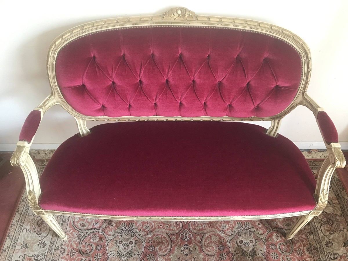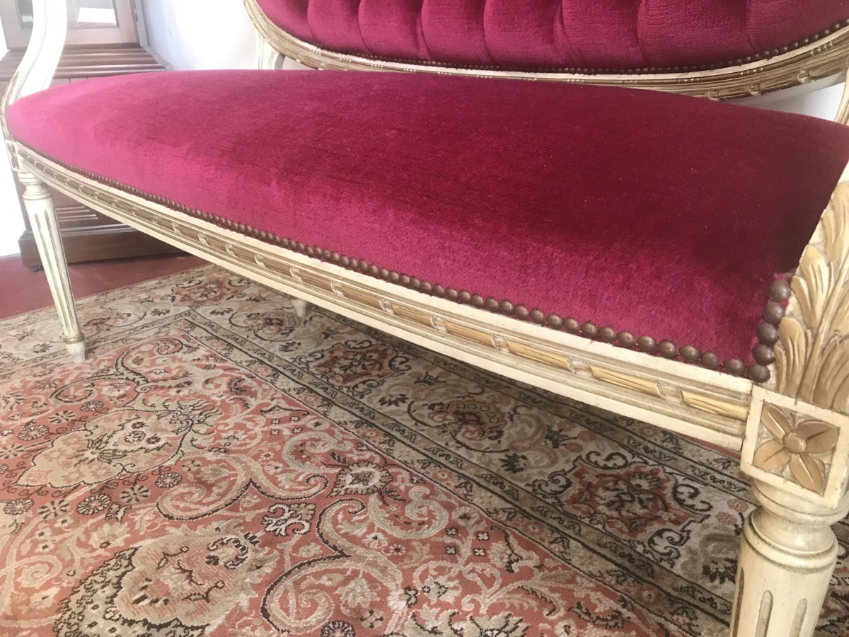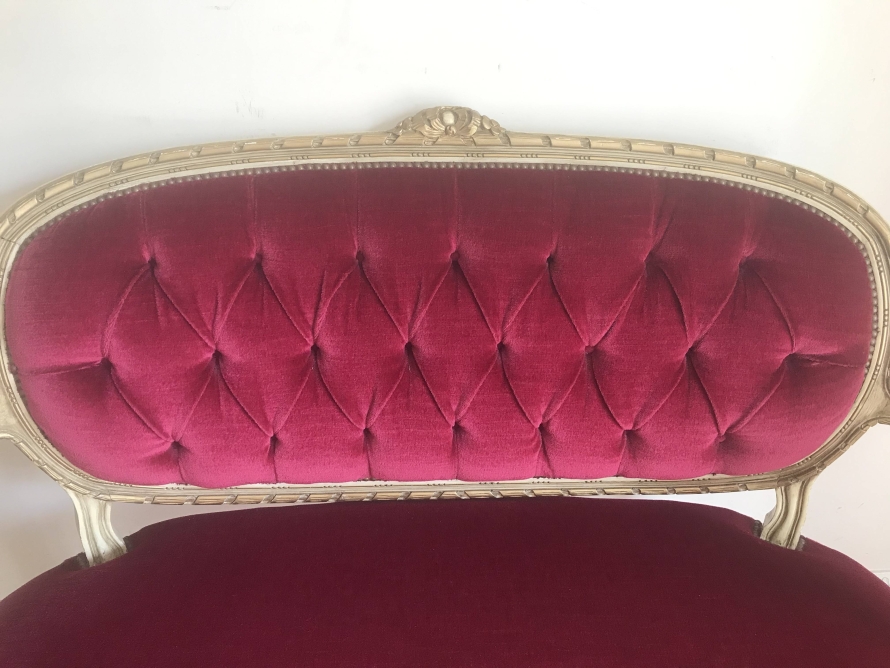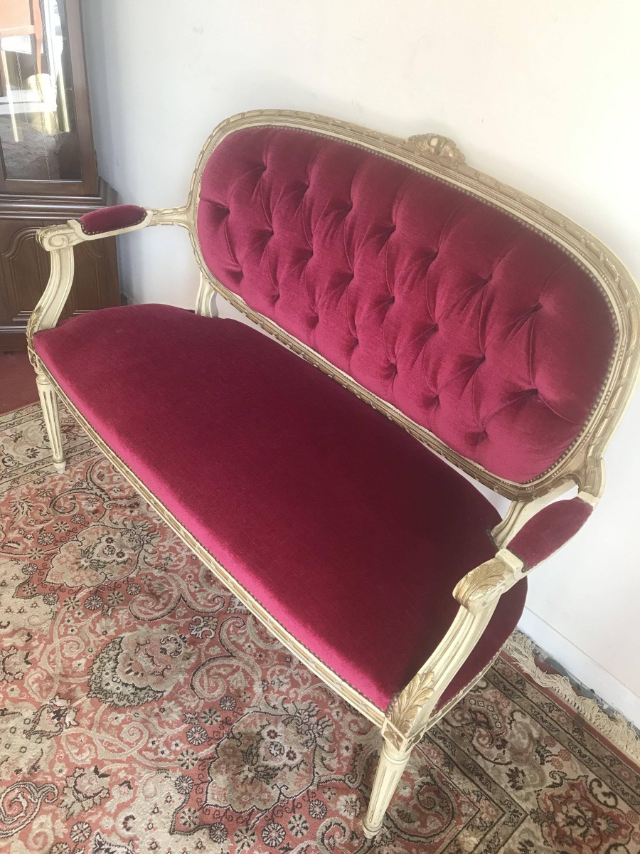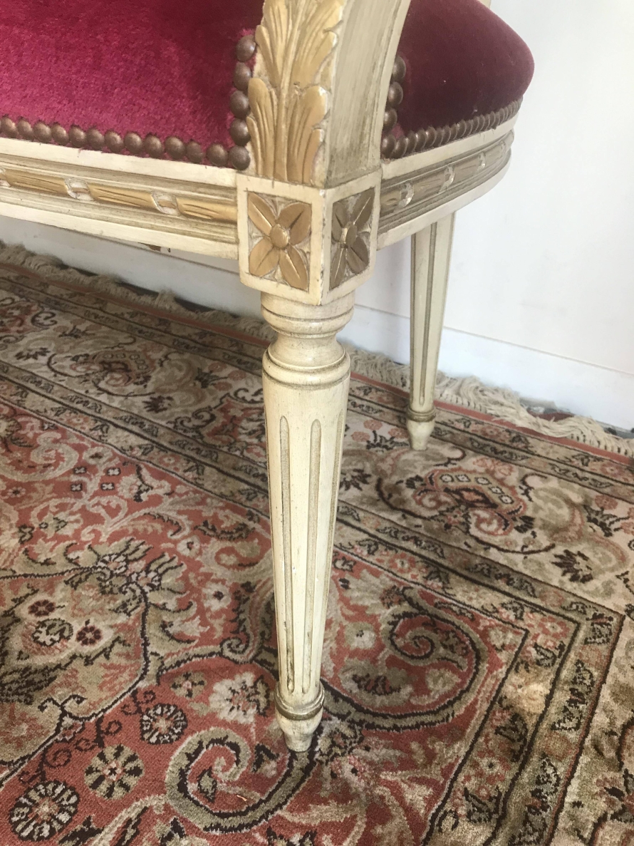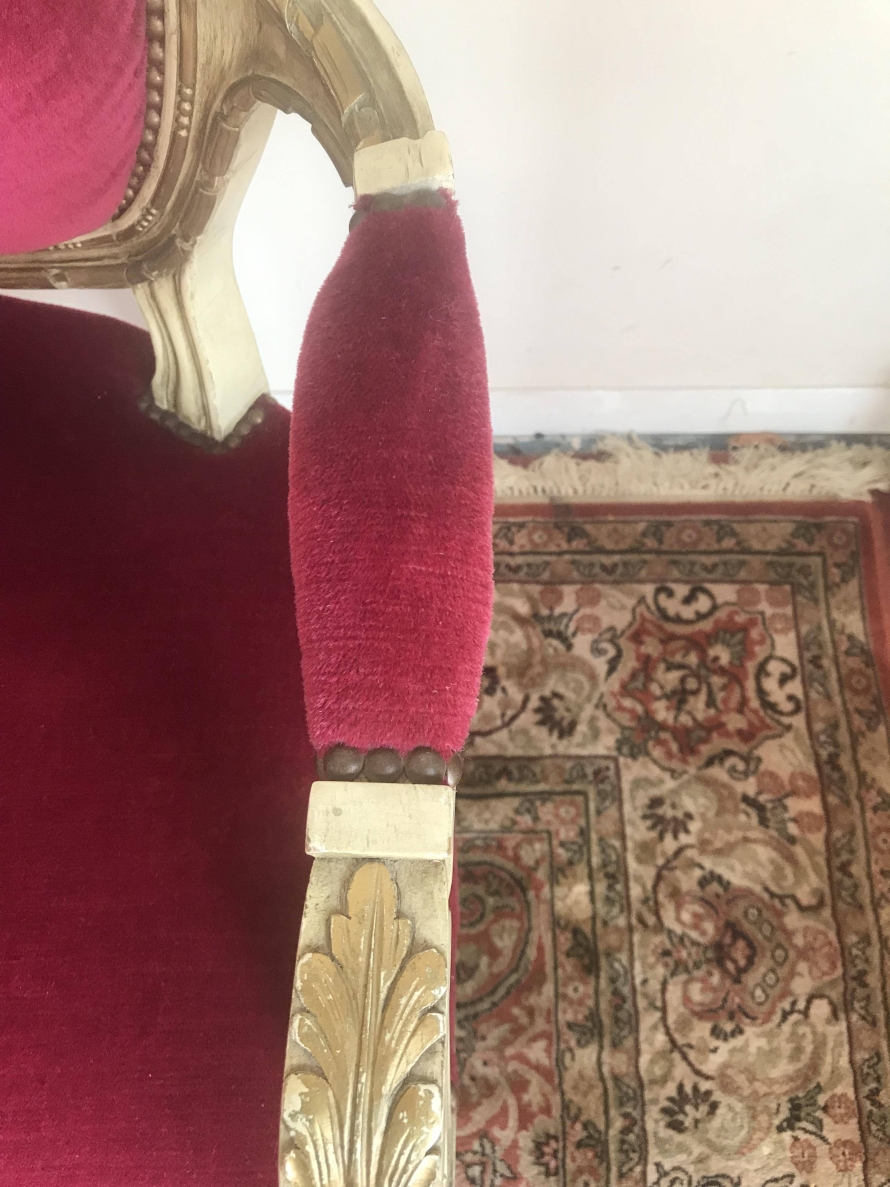 The gilt and cream frame has floral decoration throughout. The studied cameo back and cushioned seat are upholstered in a quality claret valour fabric. The armrests are also upholstered, all the upholstery has studded edging. This elegant French item sits on four fluted legs. A great item which will enhance any home.