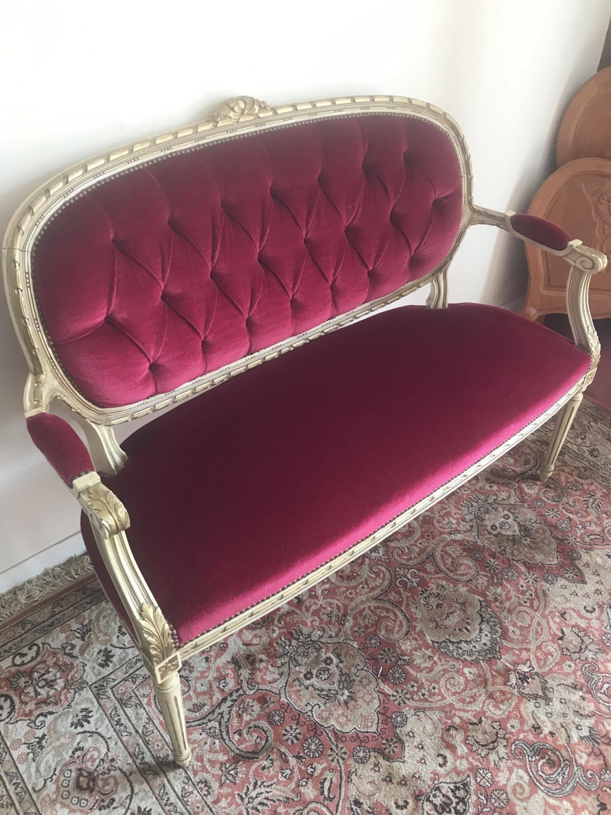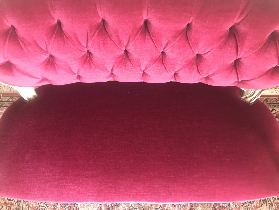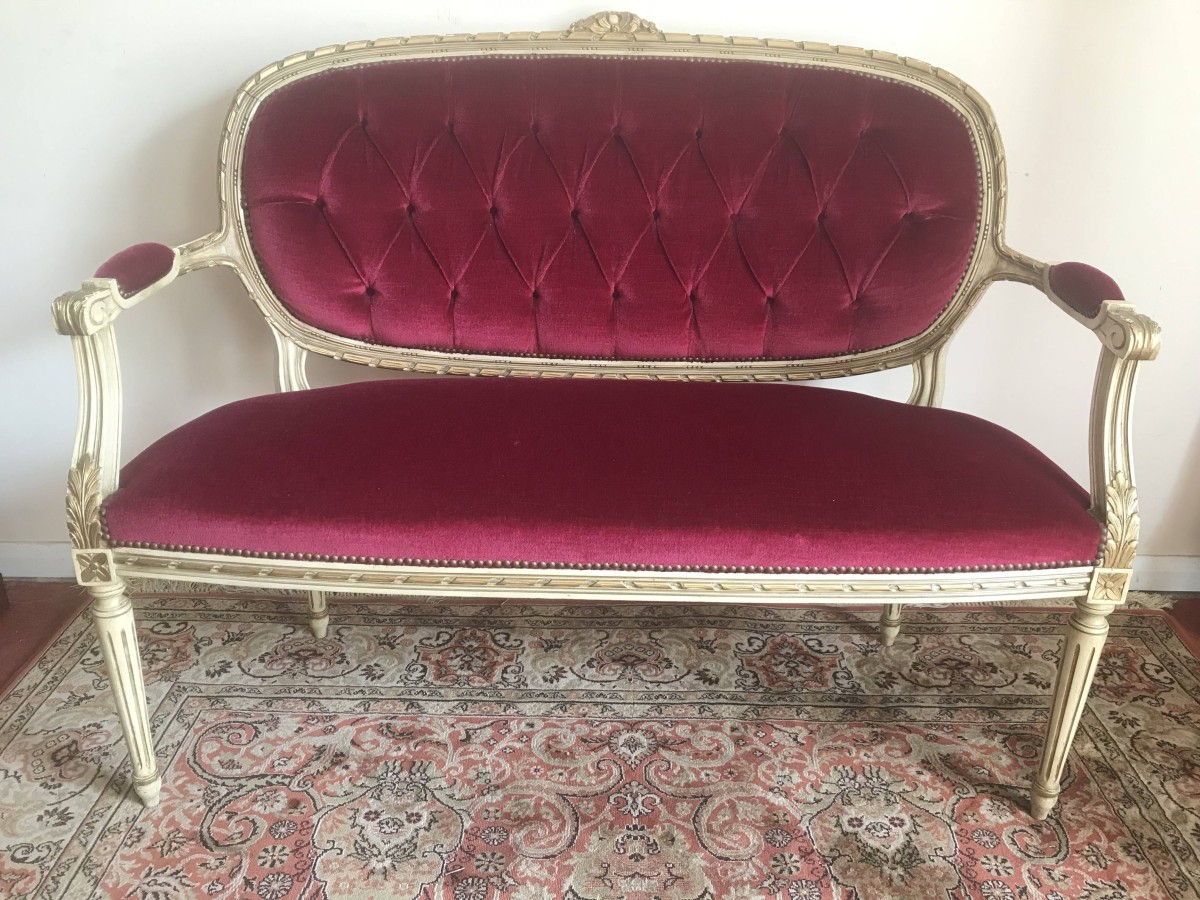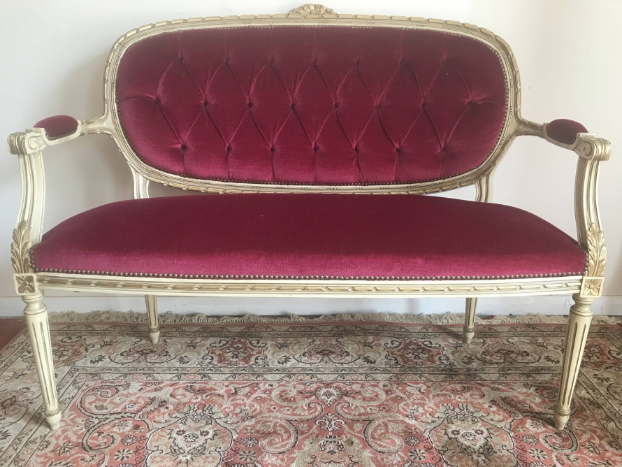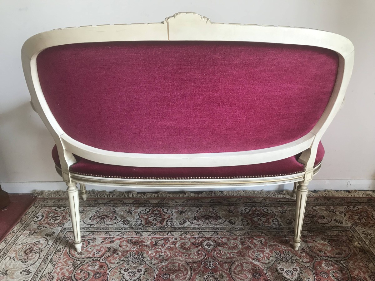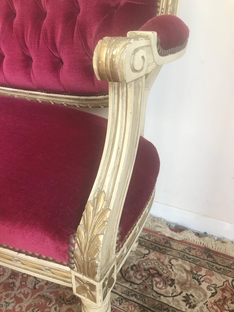The gilt and cream frame has floral decoration throughout. The studied cameo back and cushioned seat are upholstered in a quality claret valour fabric. The armrests are also upholstered, all the upholstery has studded edging. This elegant French item sits on four fluted legs. A great item which will enhance any home.