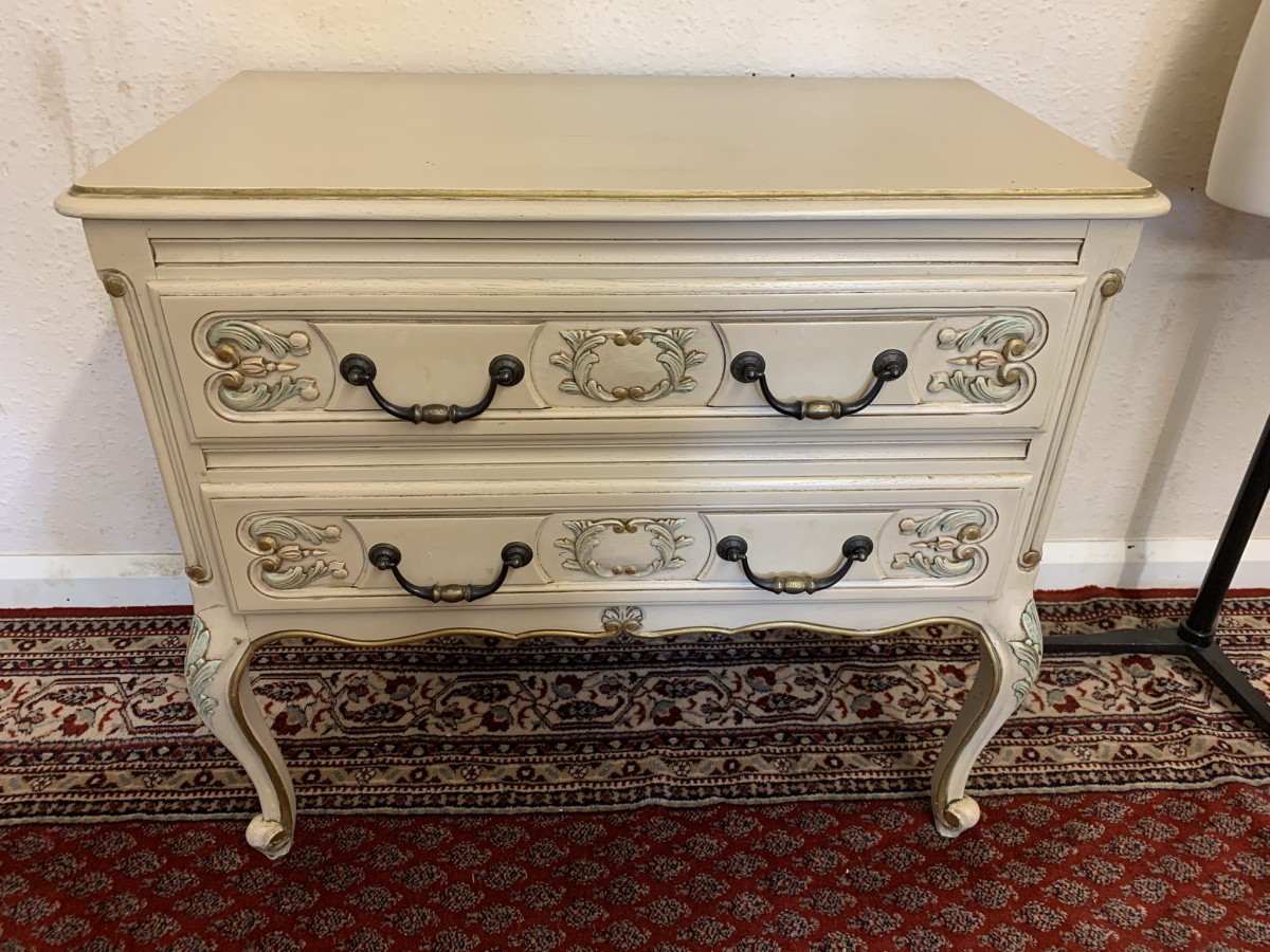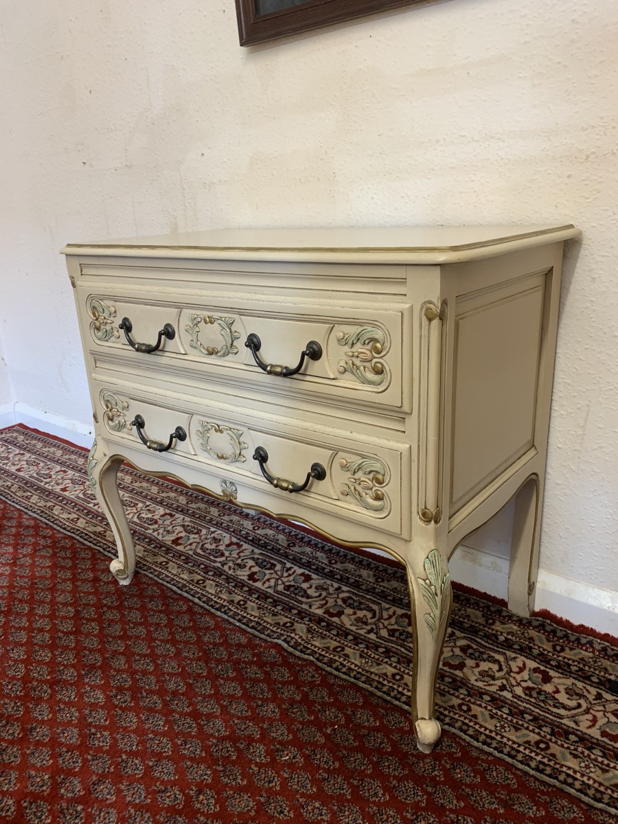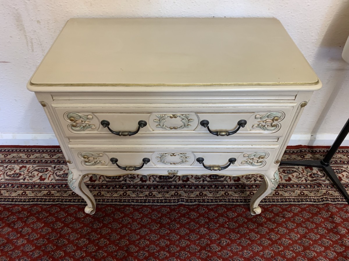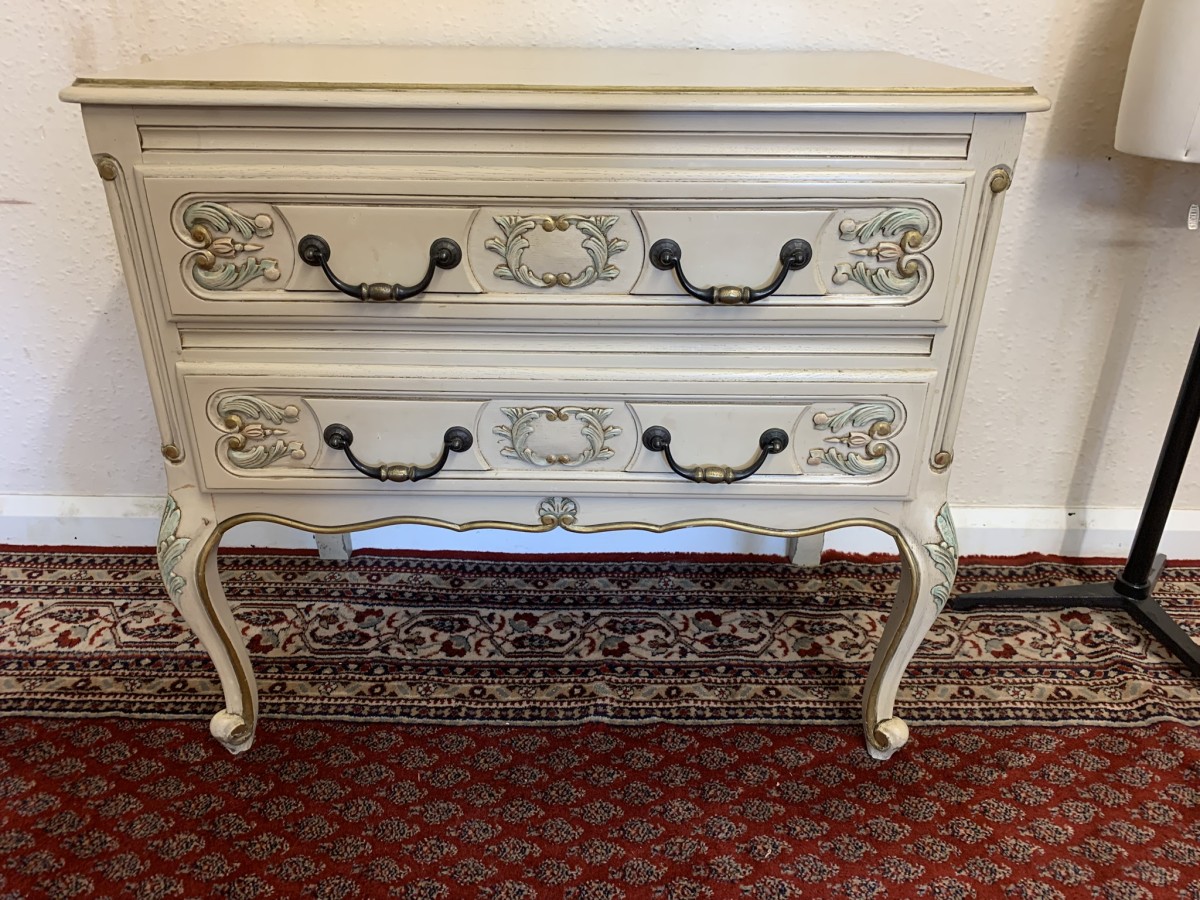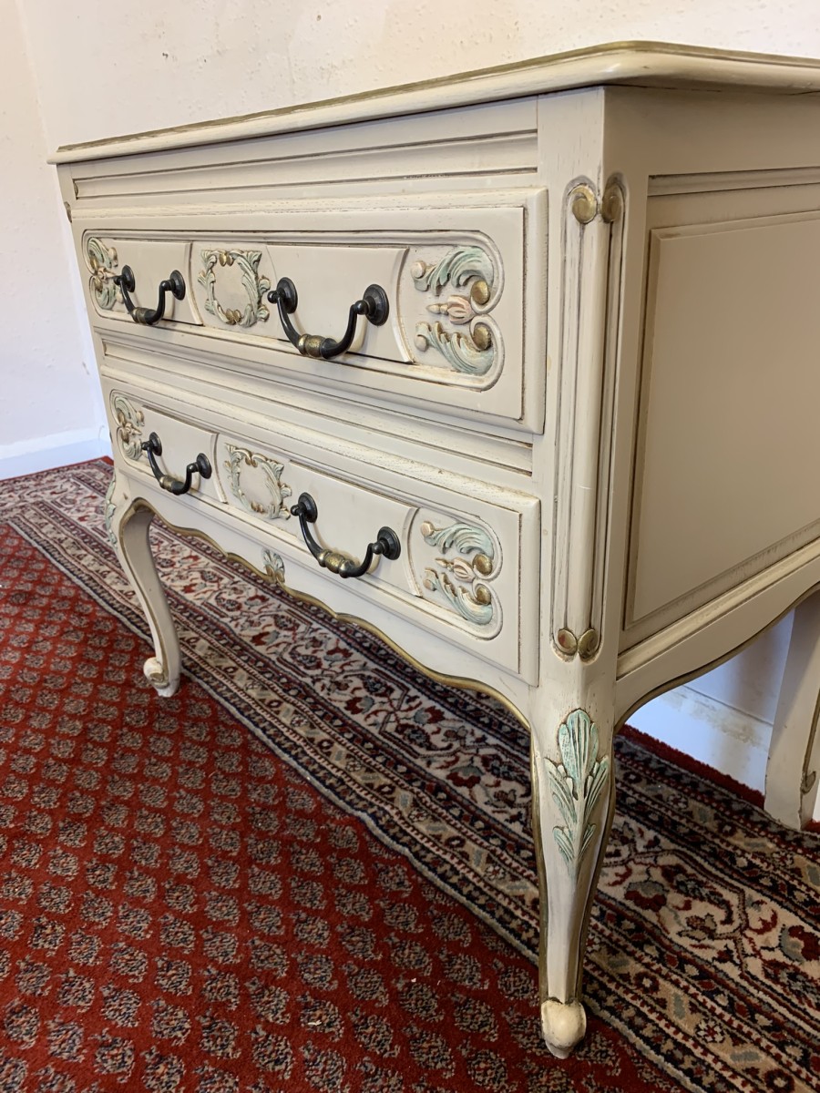 This French cream chest has rounded front corners, two carved drawers each with a pair of drop handles, recessed panelled sides and standing on two carved cabriole legs to the front.
