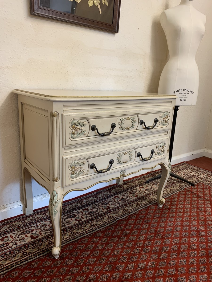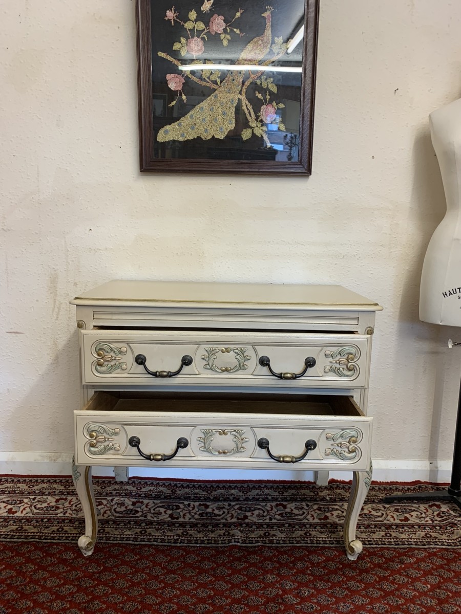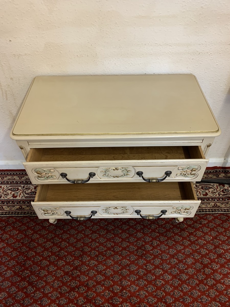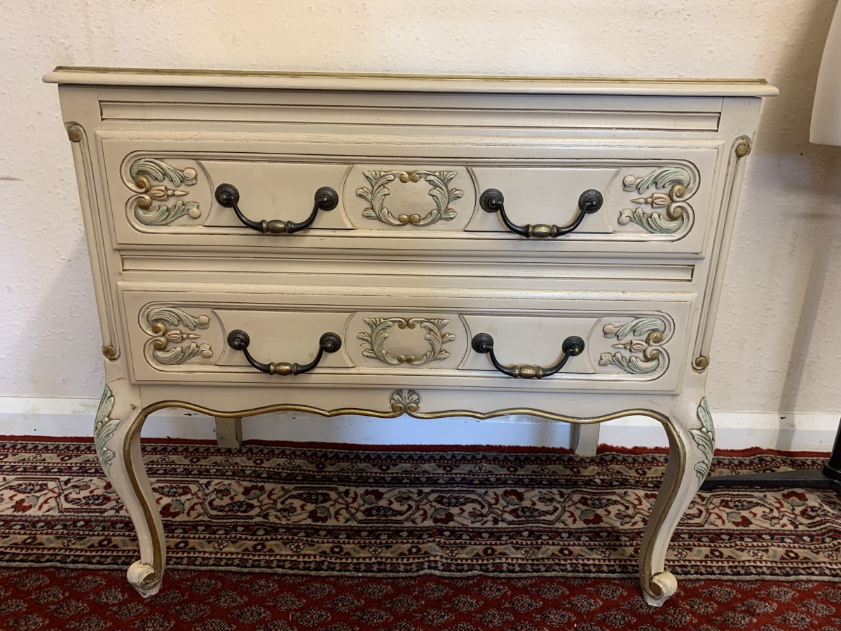 This French cream chest has rounded front corners, two carved drawers each with a pair of drop handles, recessed panelled sides and standing on two carved cabriole legs to the front.