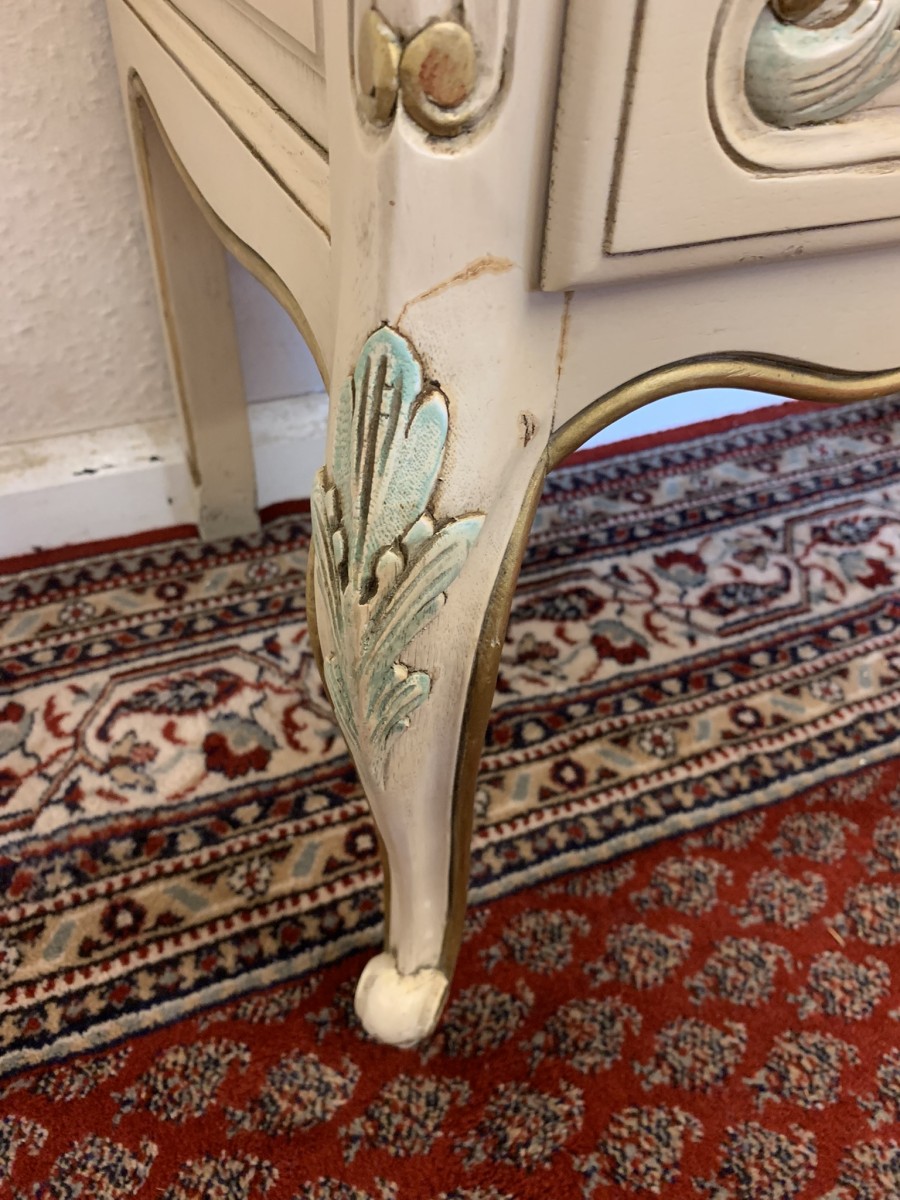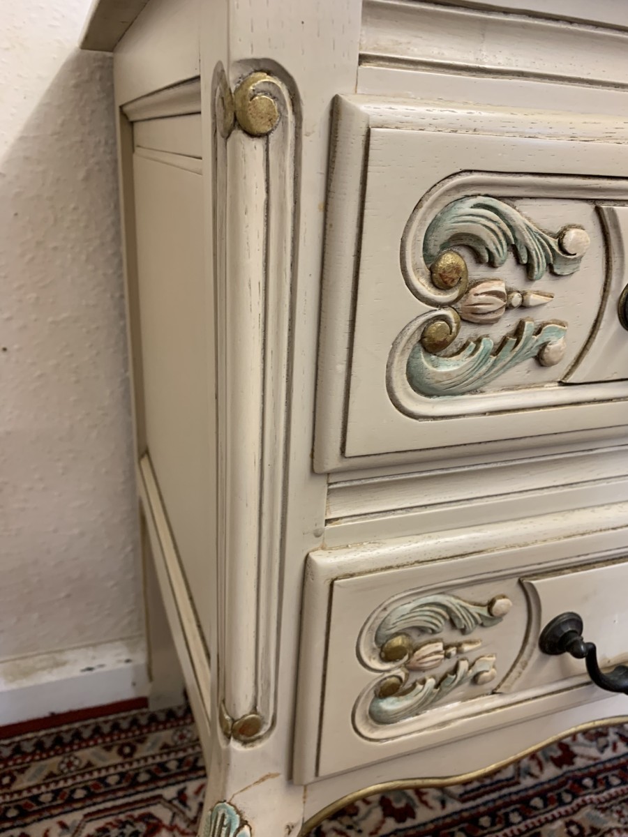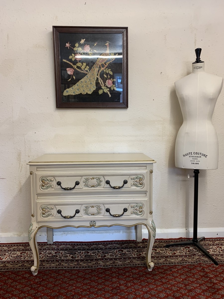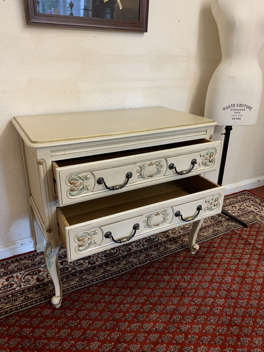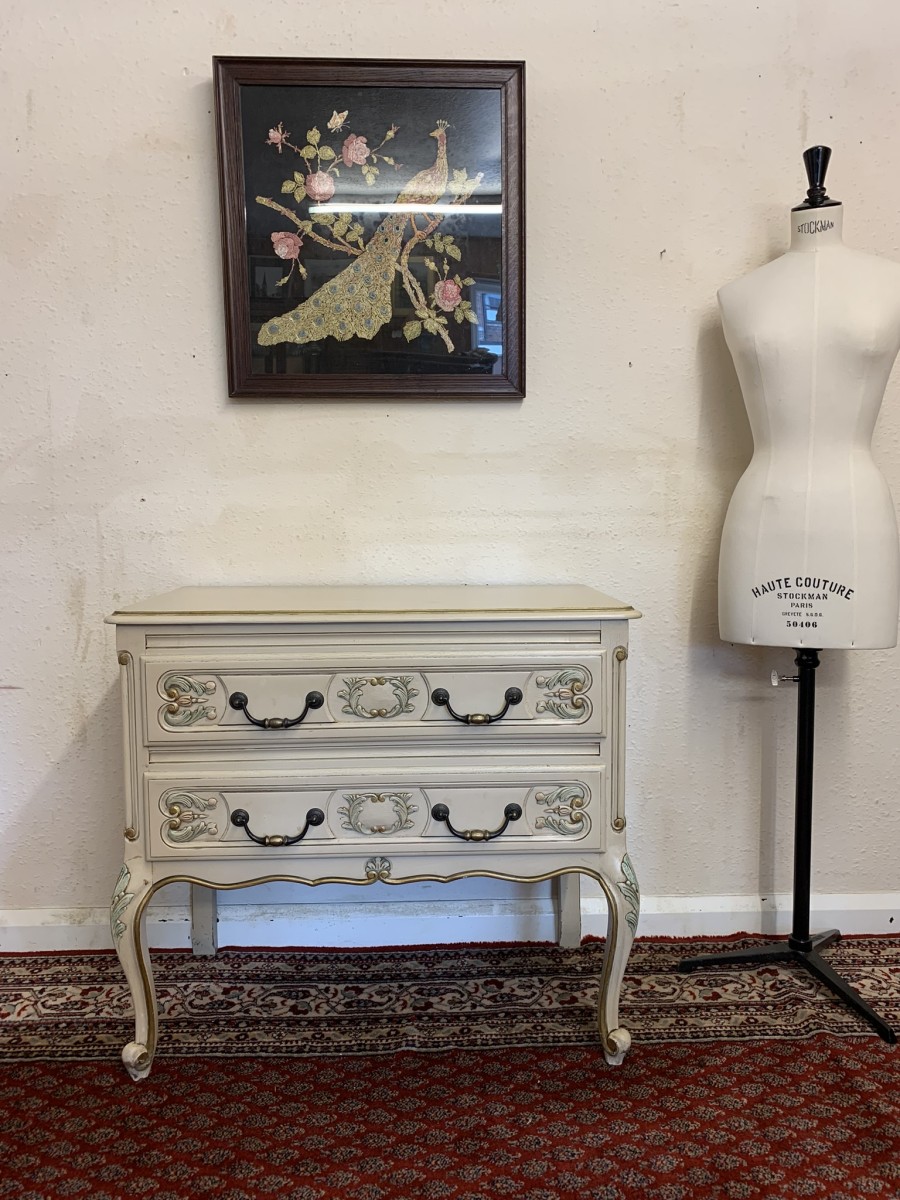 This French cream chest has rounded front corners, two carved drawers each with a pair of drop handles, recessed panelled sides and standing on two carved cabriole legs to the front.