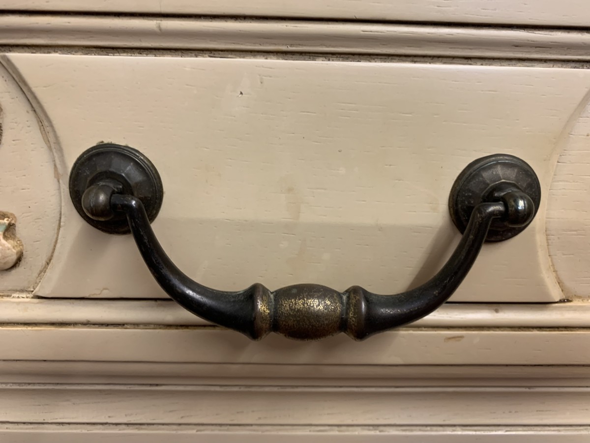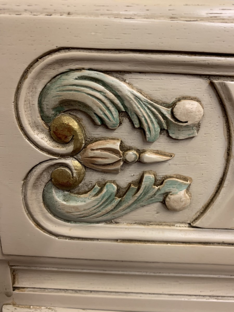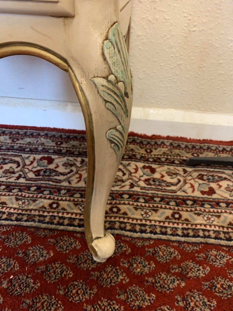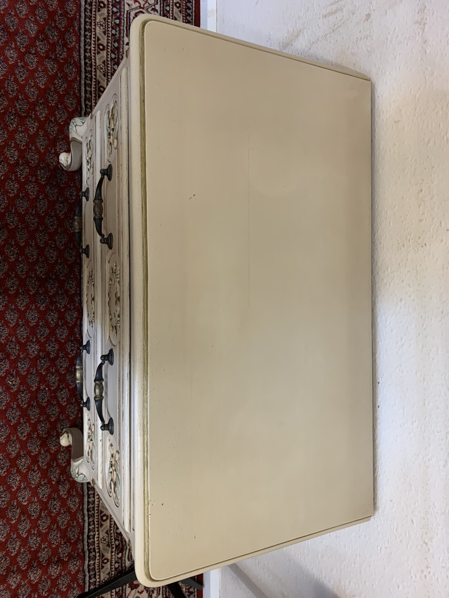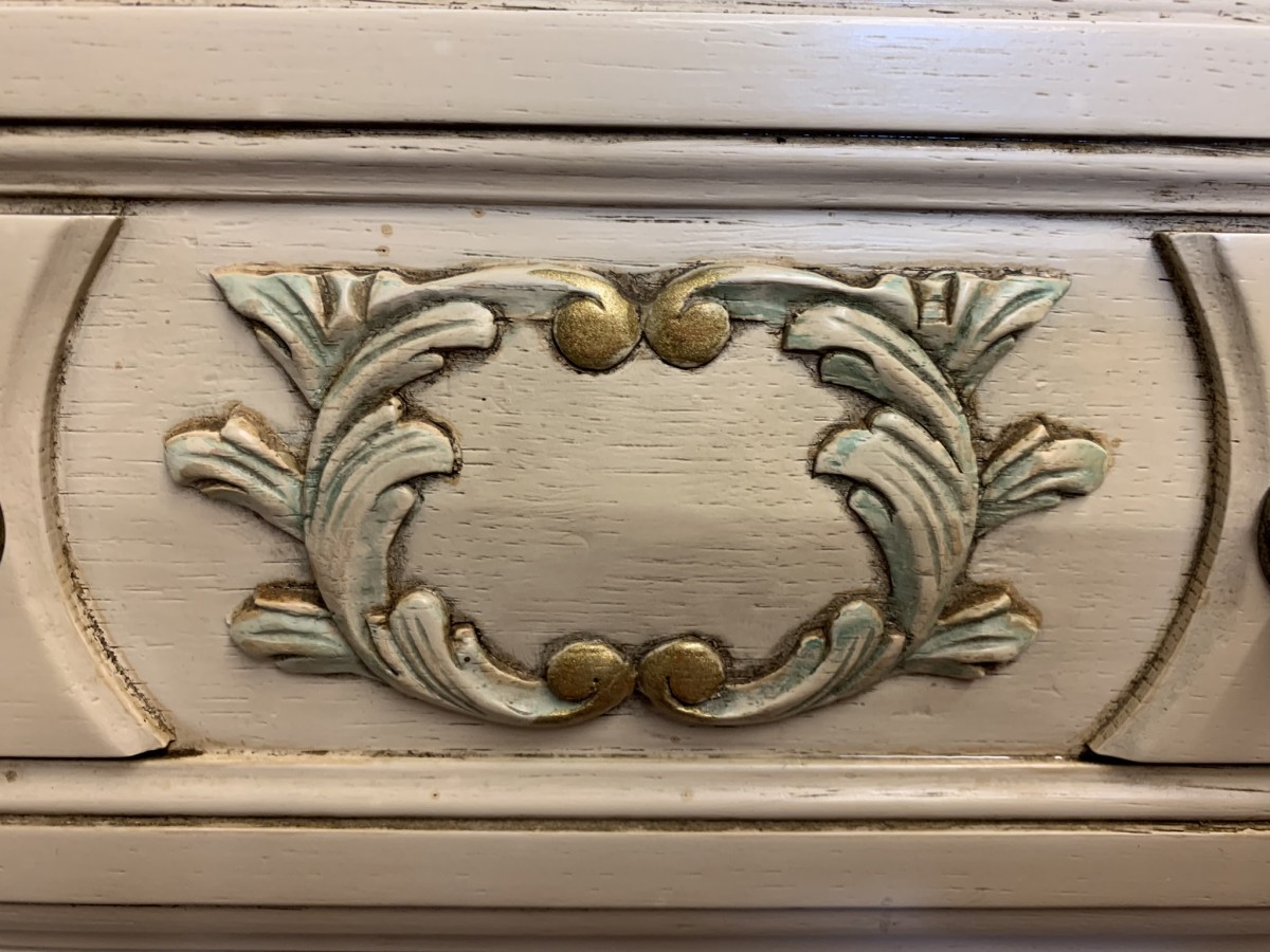 This French cream chest has rounded front corners, two carved drawers each with a pair of drop handles, recessed panelled sides and standing on two carved cabriole legs to the front.