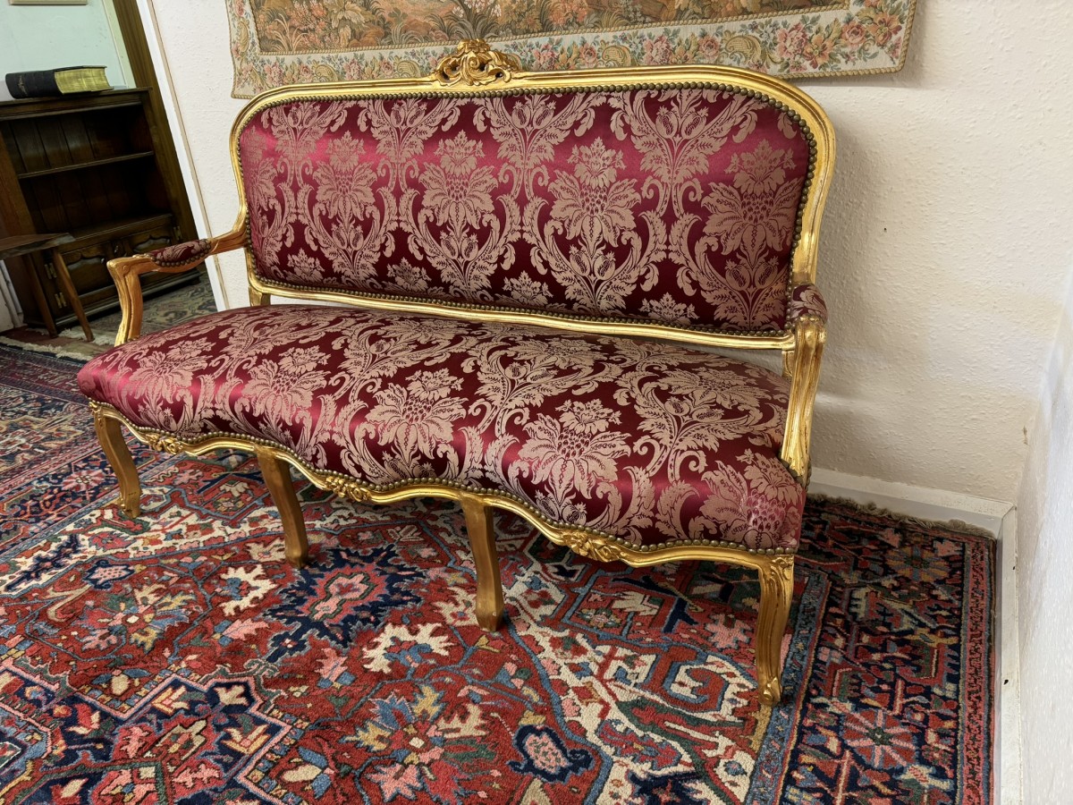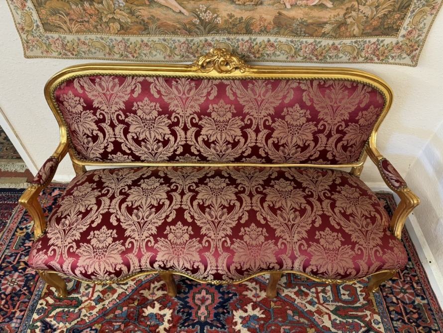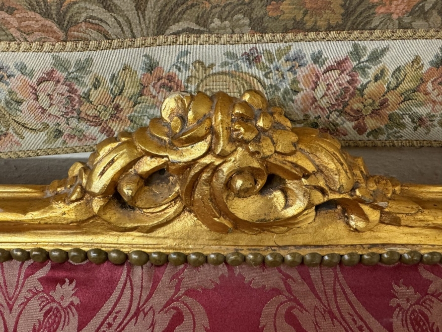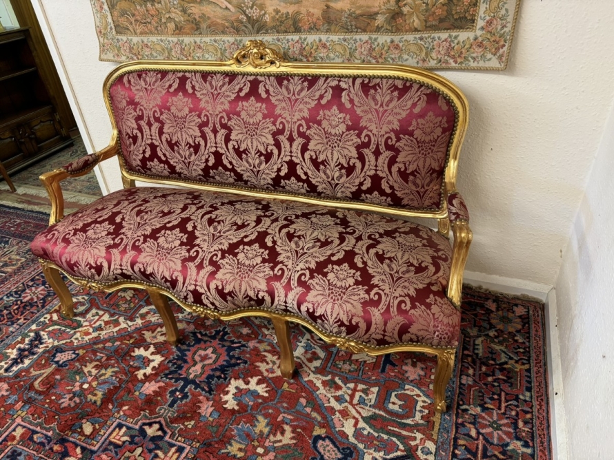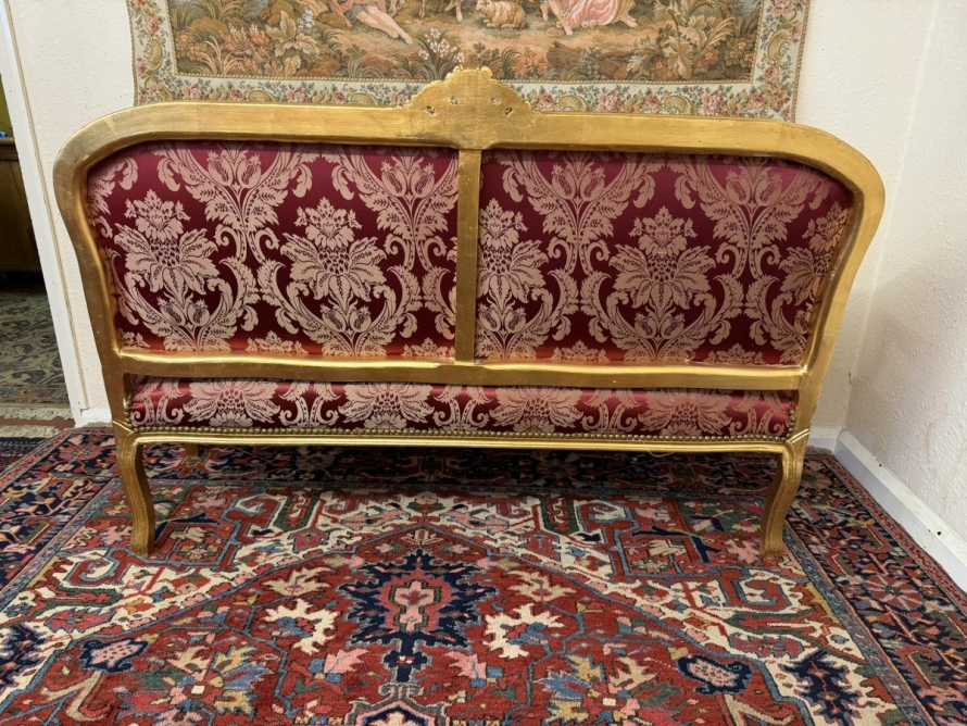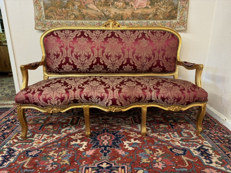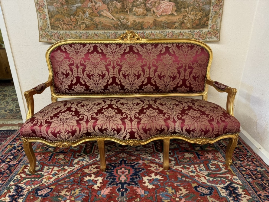The shaped back has a fabulous central carving. Upholstered cushioned back and seat which are tastefully upholstered. The shaped arms have upholstered armrests. There is metal studying decoration throughout. Shaped skirt with ornate carvings this fabulous settee stands on six cabriole legs.