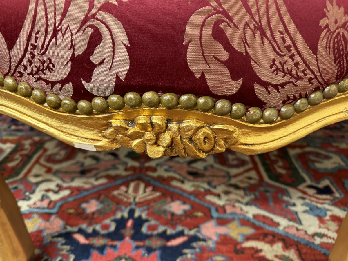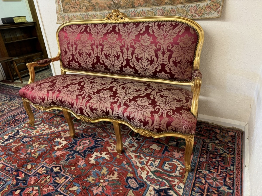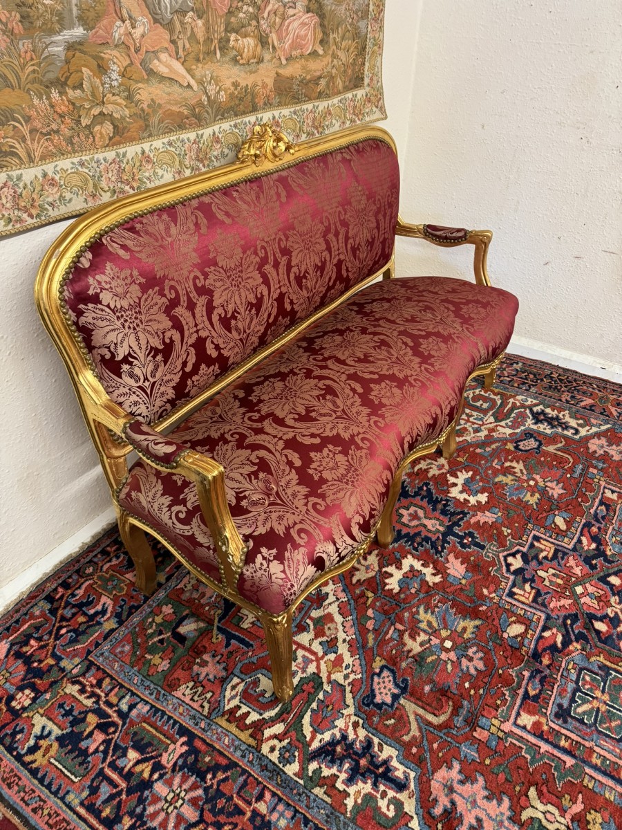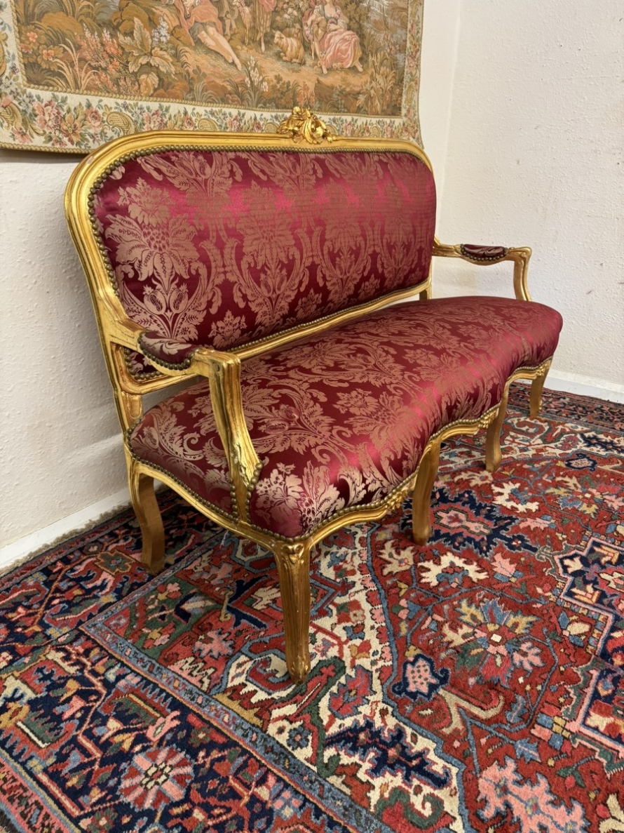 The shaped back has a fabulous central carving. Upholstered cushioned back and seat which are tastefully upholstered. The shaped arms have upholstered armrests. There is metal studying decoration throughout. Shaped skirt with ornate carvings this fabulous settee stands on six cabriole legs.