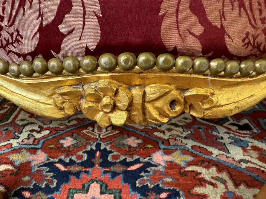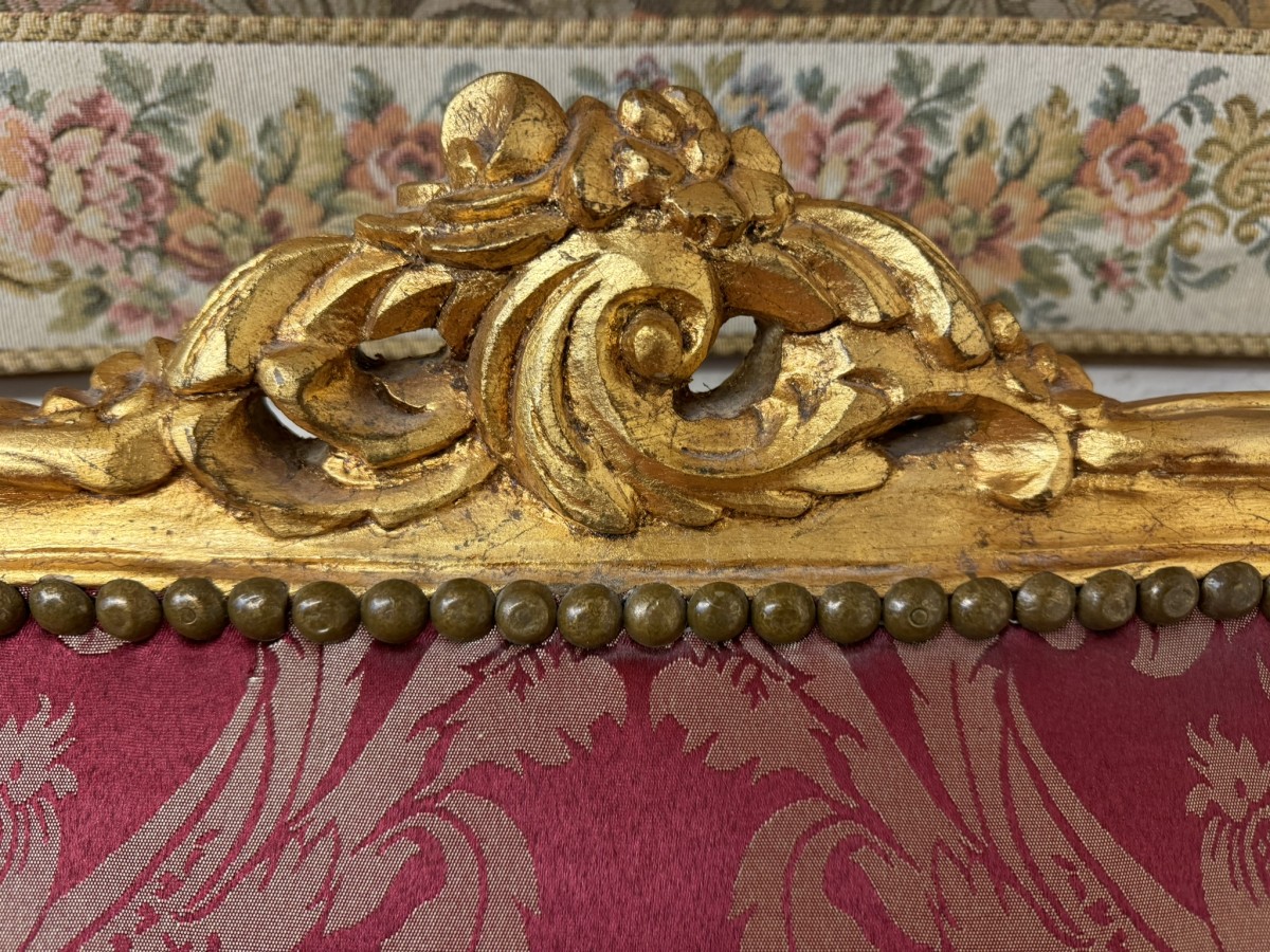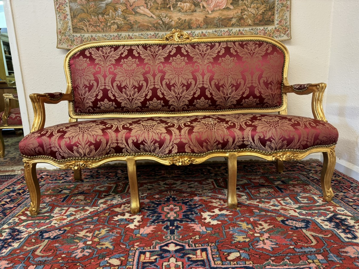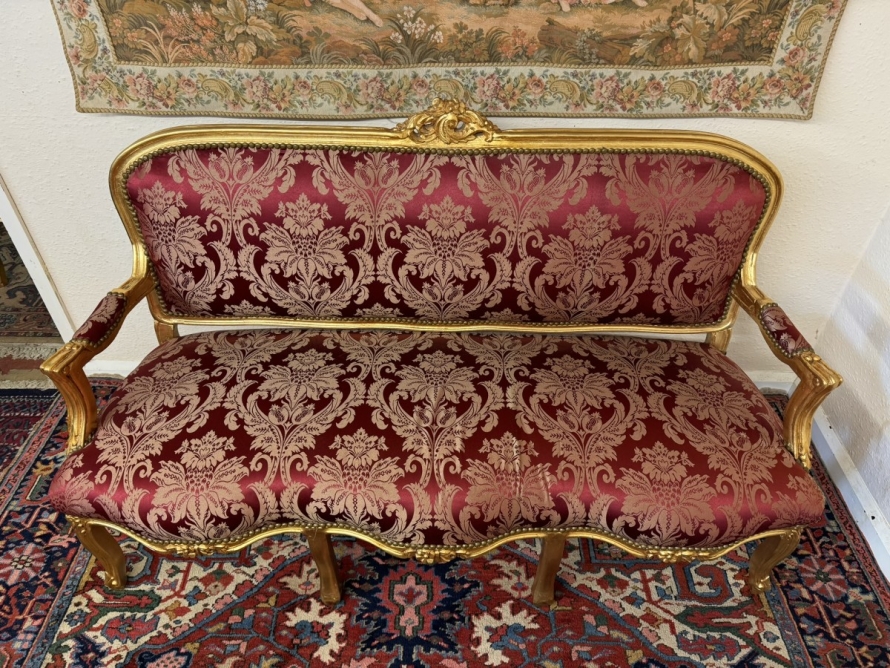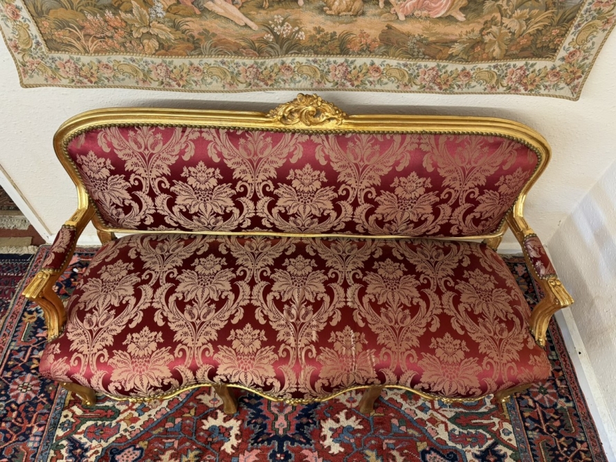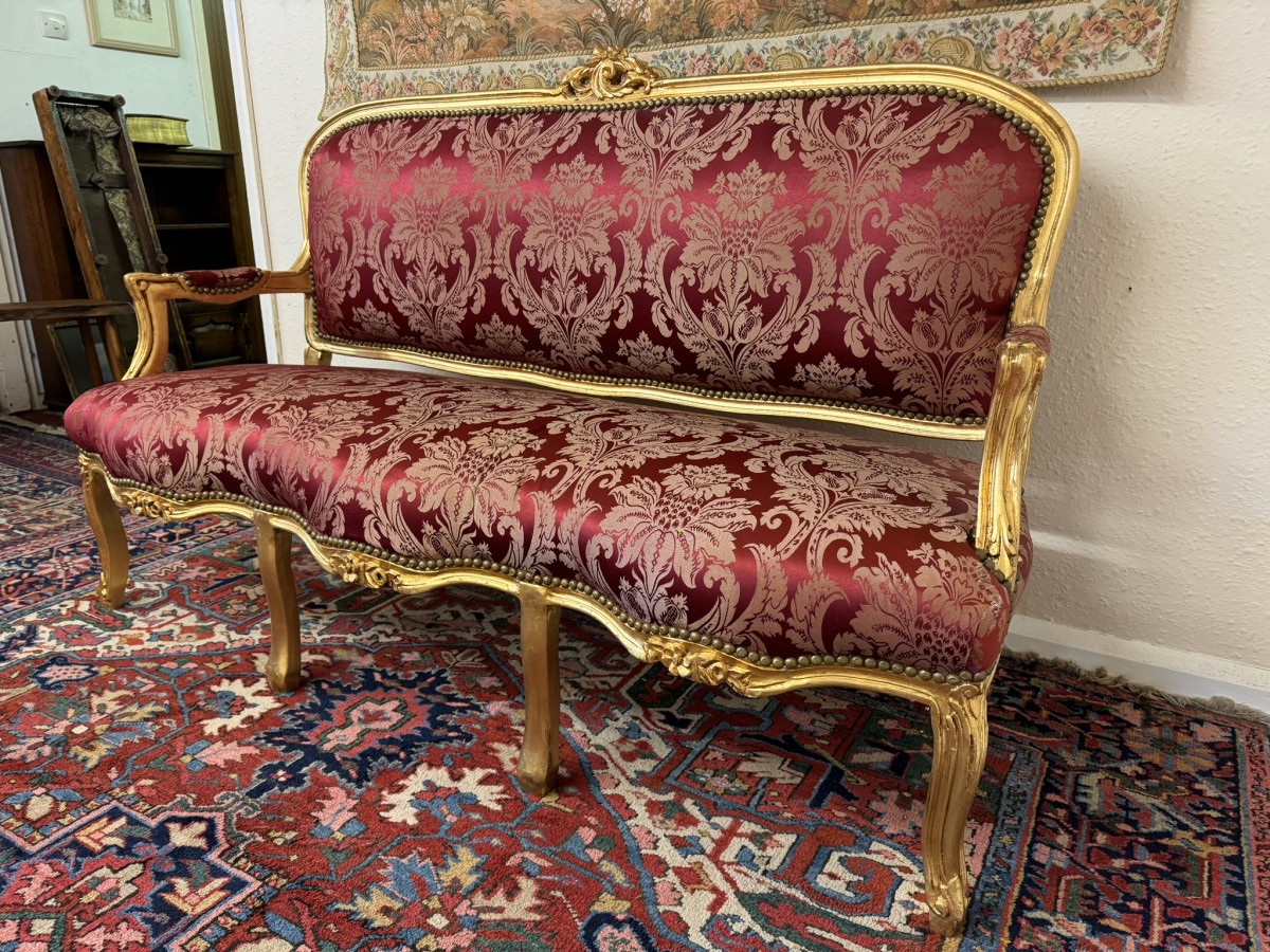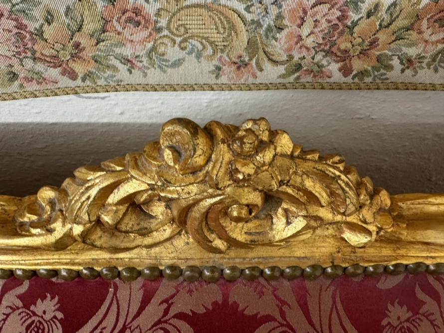 The shaped back has a fabulous central carving. Upholstered cushioned back and seat which are tastefully upholstered in a demask fabric. The shaped arms have upholstered armrests. There is metal stud decoration throughout. Shaped skirt with ornate carvings this fabulous French sofa stands on six cabriole legs.