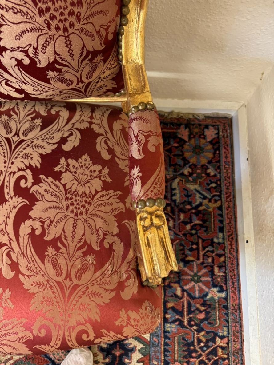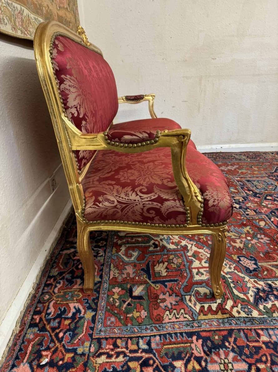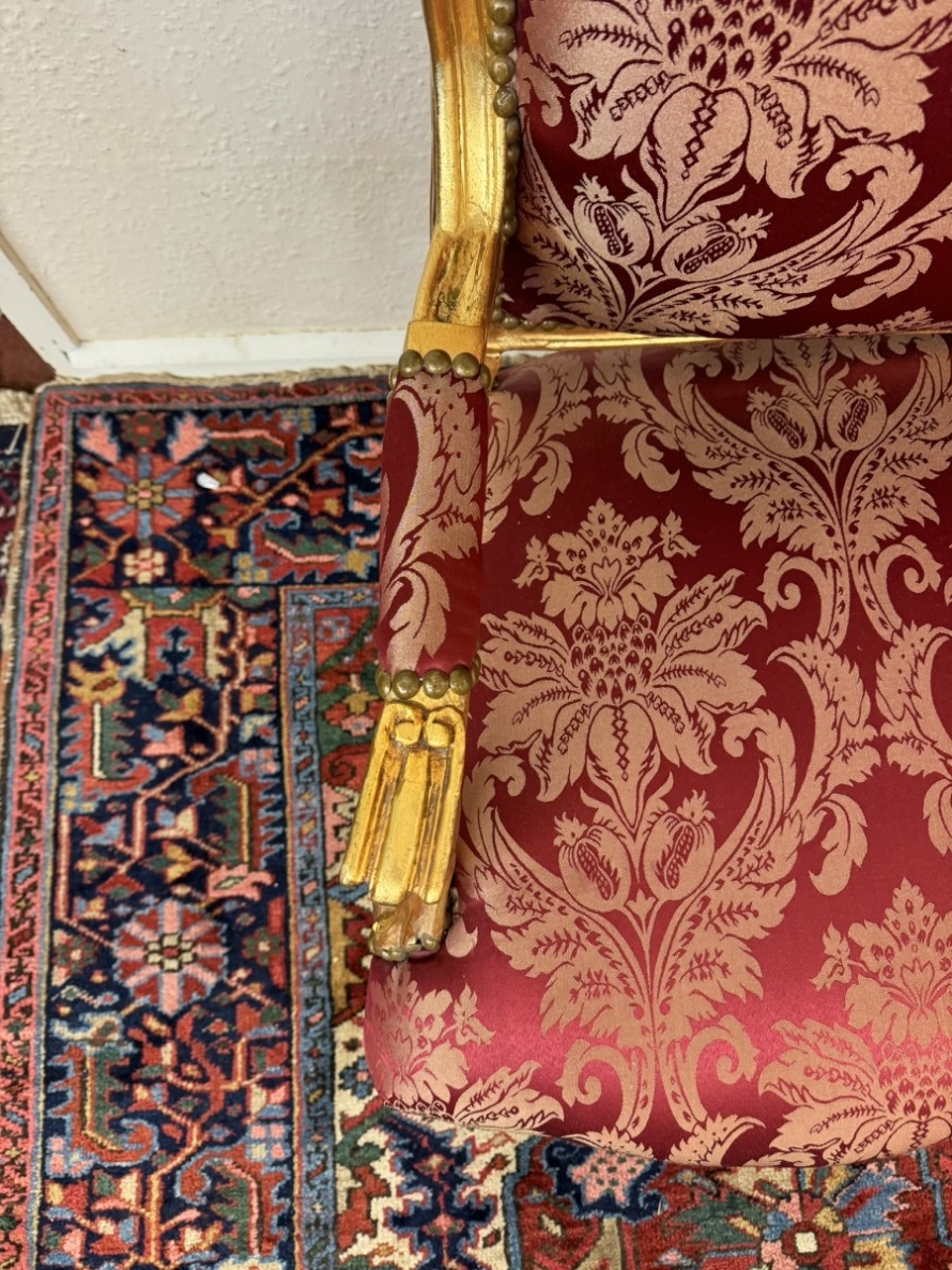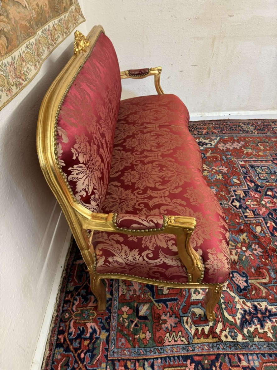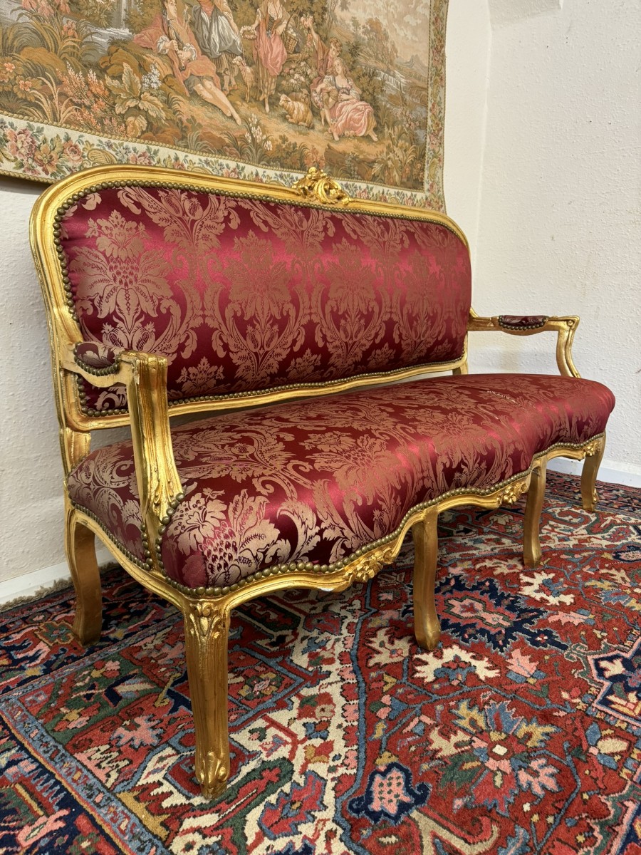 The shaped back has a fabulous central carving. Upholstered cushioned back and seat which are tastefully upholstered in a demask fabric. The shaped arms have upholstered armrests. There is metal stud decoration throughout. Shaped skirt with ornate carvings this fabulous French sofa stands on six cabriole legs.