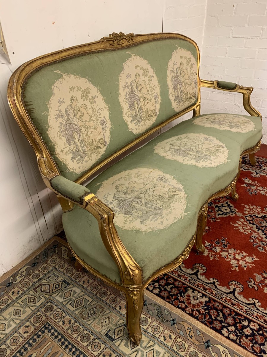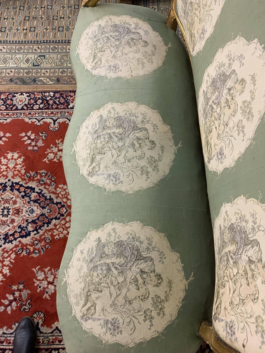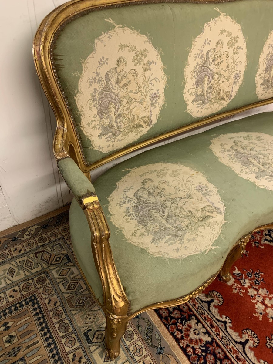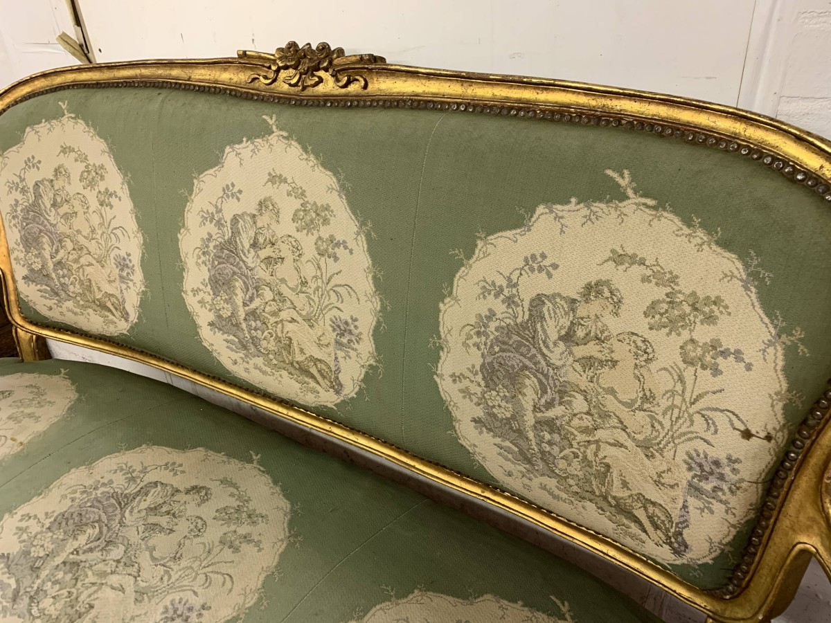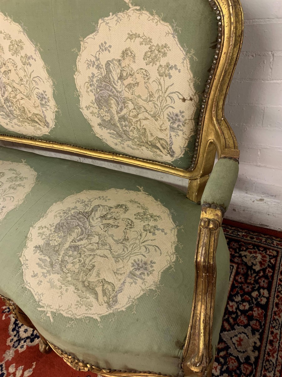 The gilt frame is carved to the top, there is a carved shaped skirt, and carved shaped cabriole legs. The fine upholstery depicts a lovers scene. The arms have posted rests. Style and elegance.