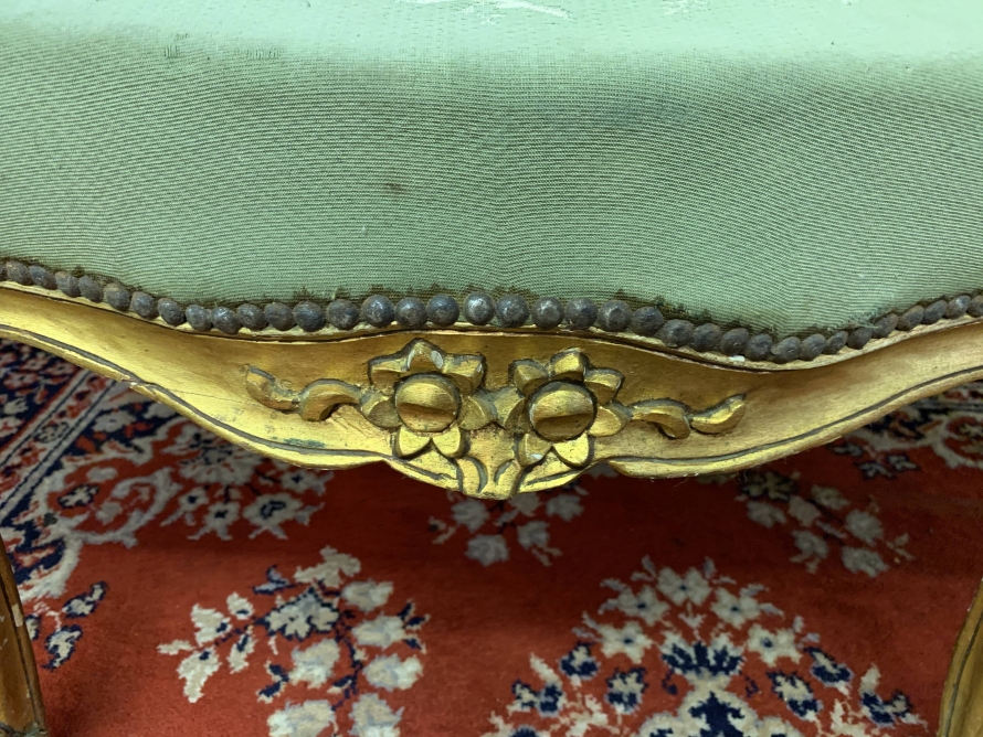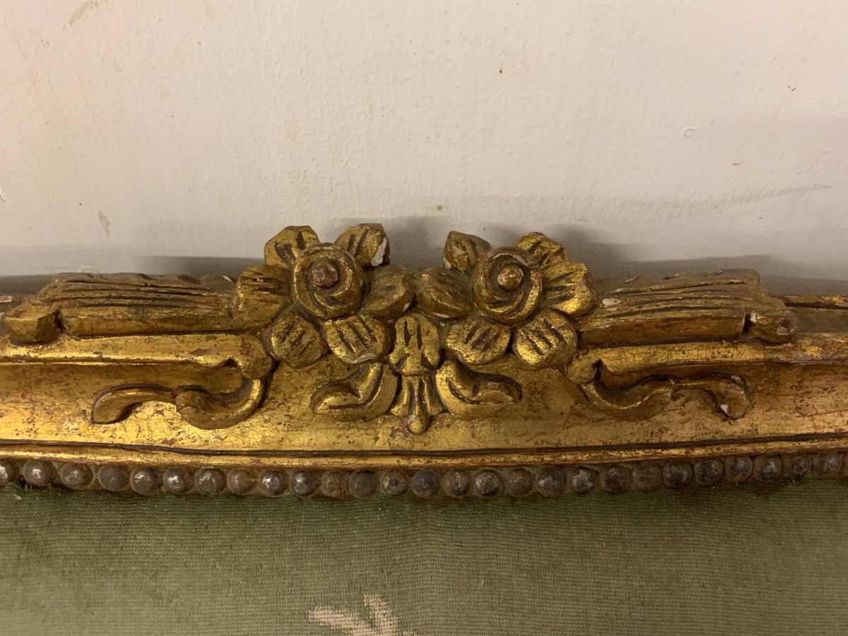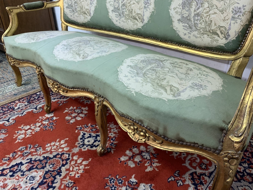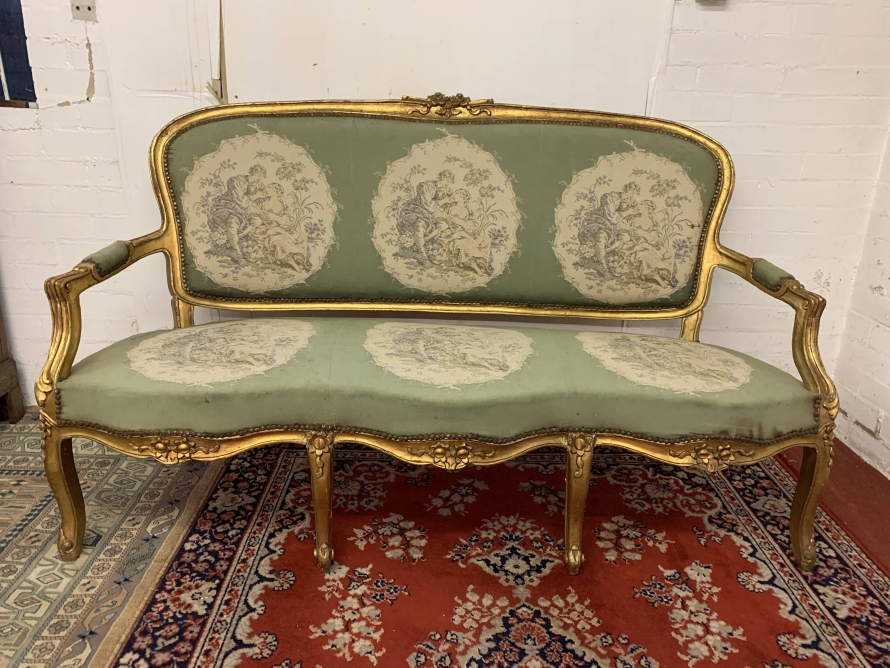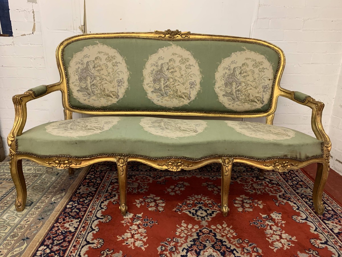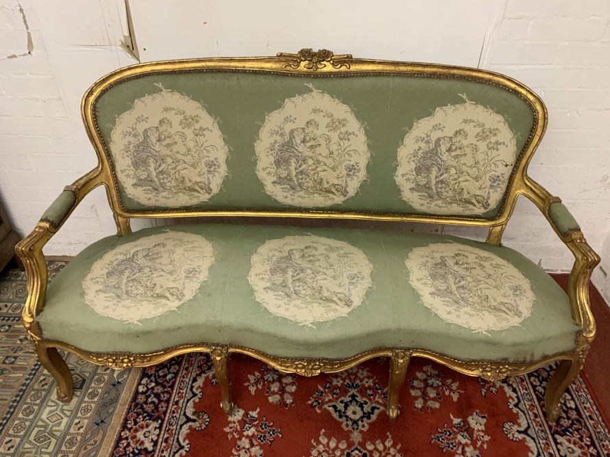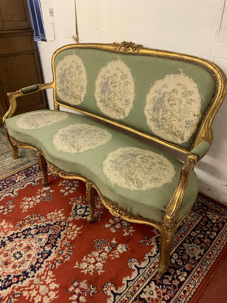 The gilt frame is carved to the top, there is a carved shaped skirt, and carved shaped cabriole legs. The fine upholstery depicts a lovers scene. The arms have posted rests. Style and elegance.