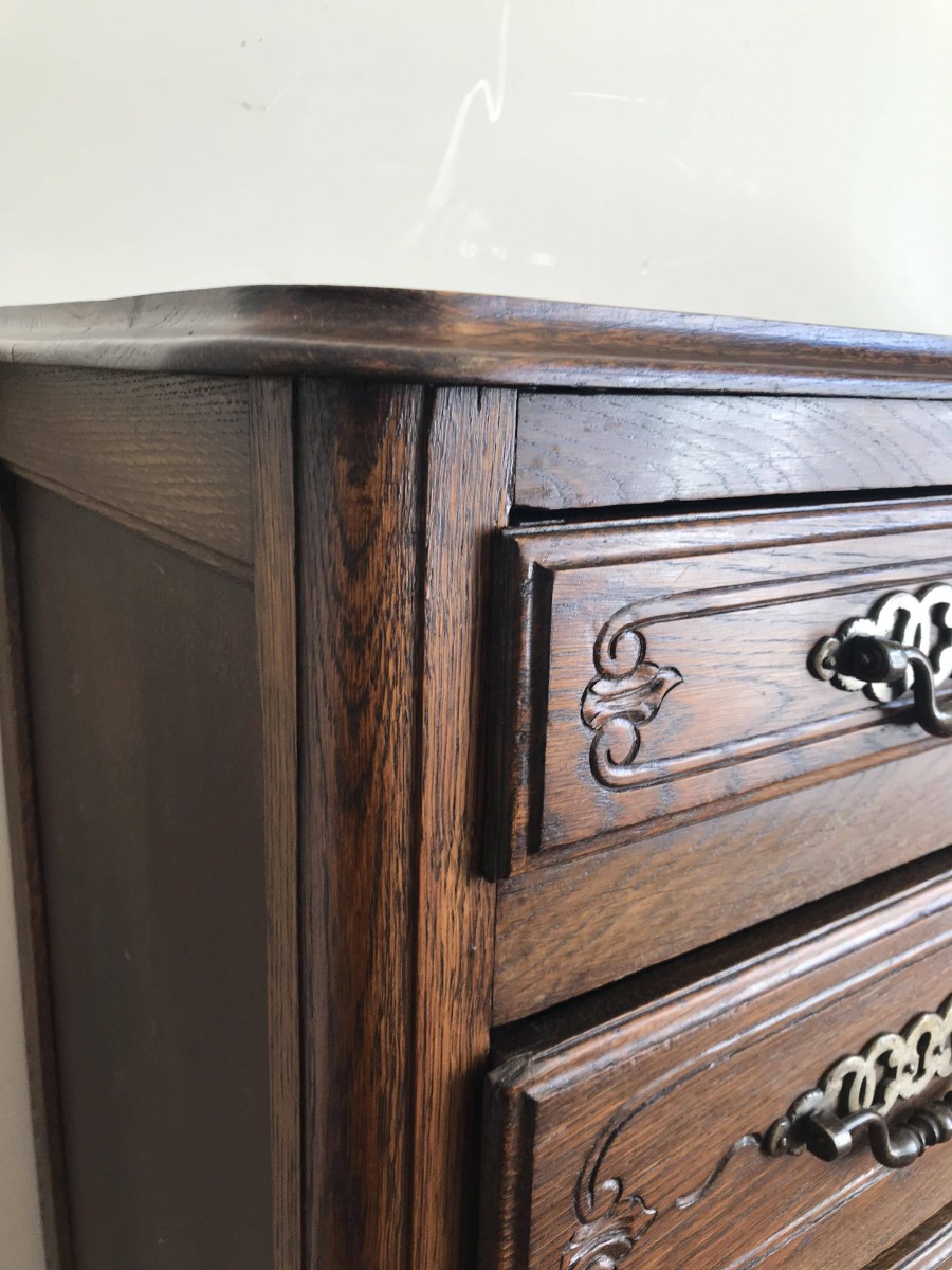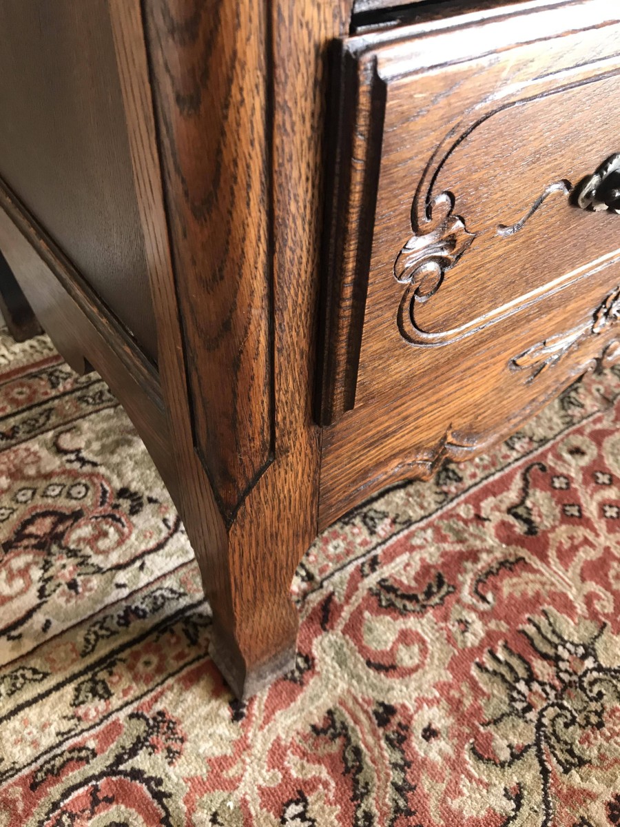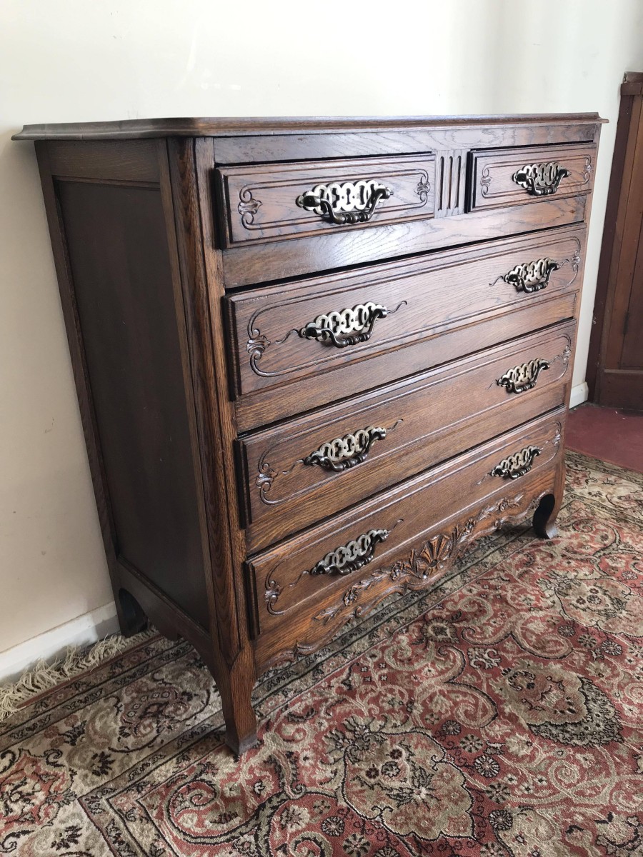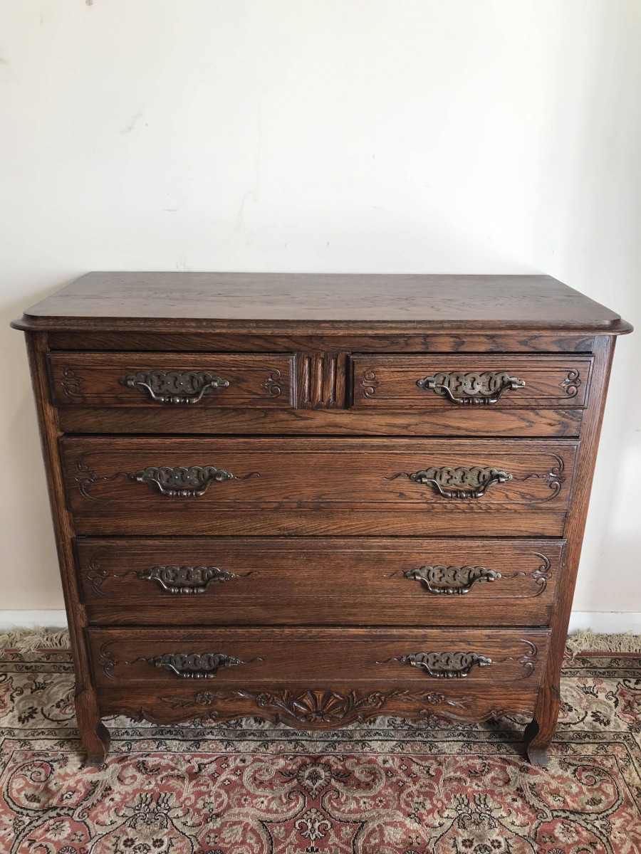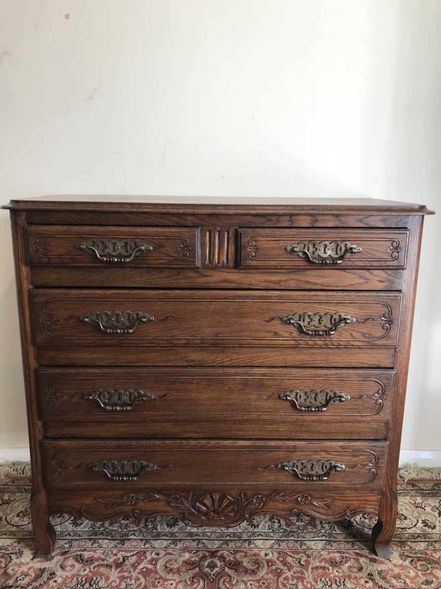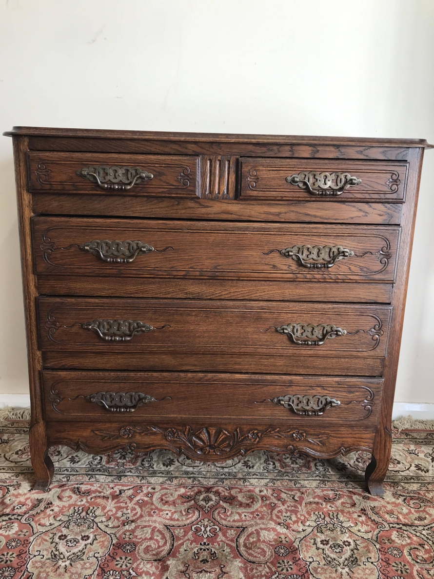 The oversailing top has rounded front corners, below are three recessed panelled carved oak drawers. Each drawer having a pair of brass handles. To the sides there are decorative carvings. Recessed panelled sides, shaped skirt with ornate central carving. this elegant chest of drawers sits on two carved cabriole legs to the front.