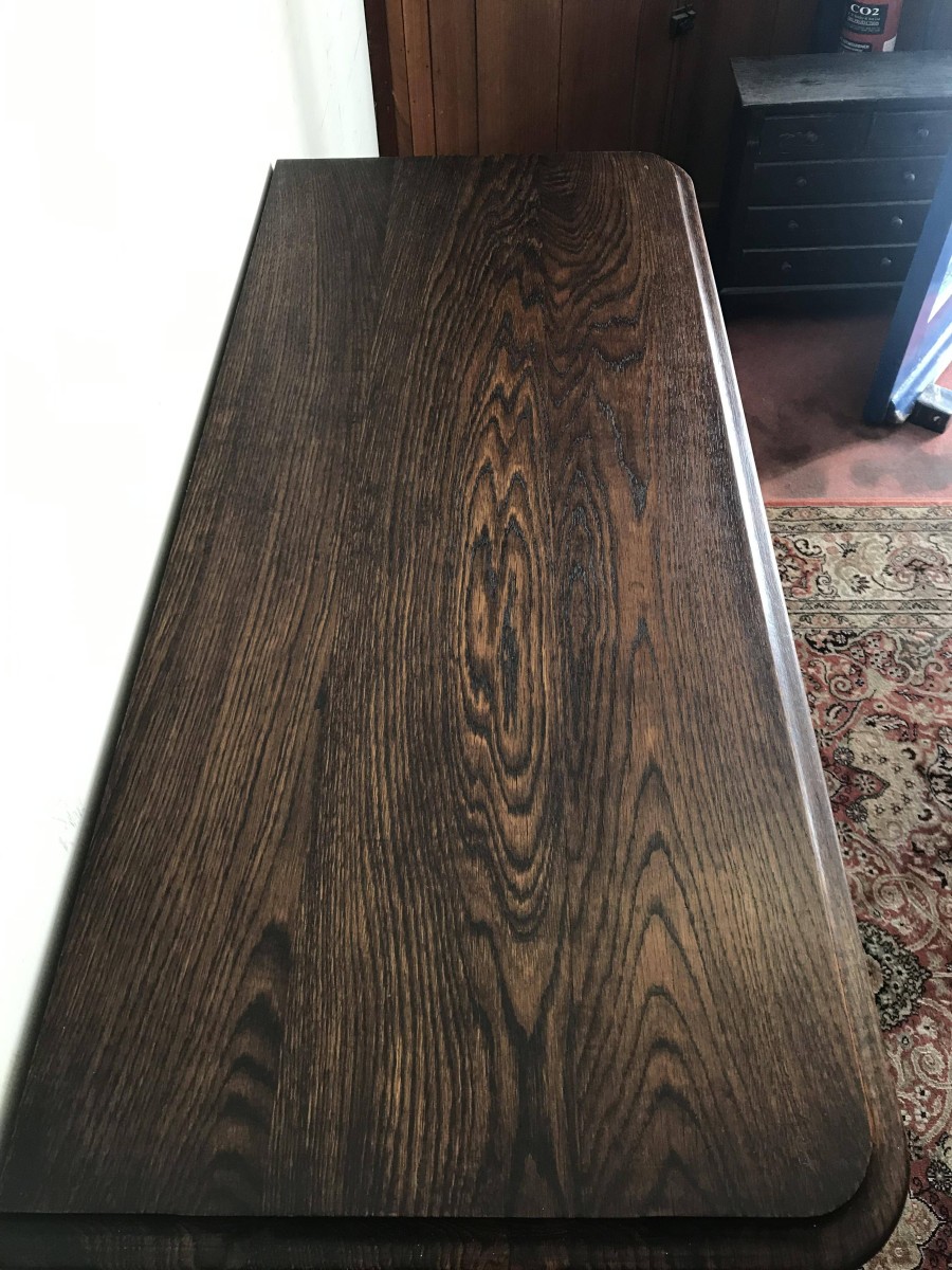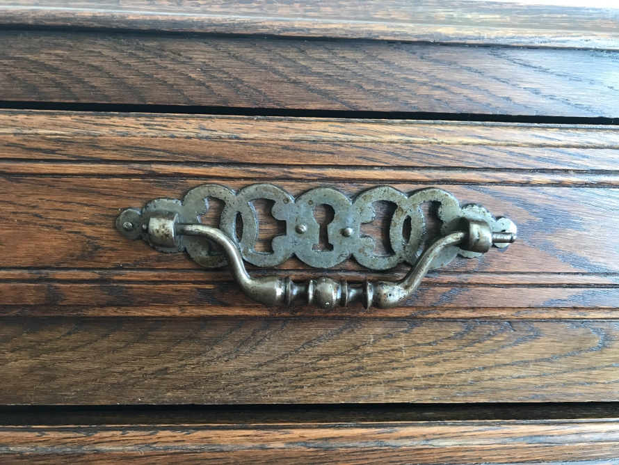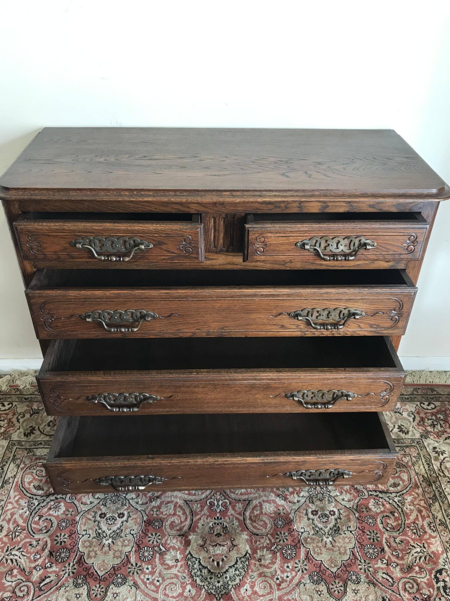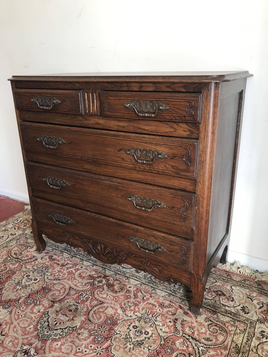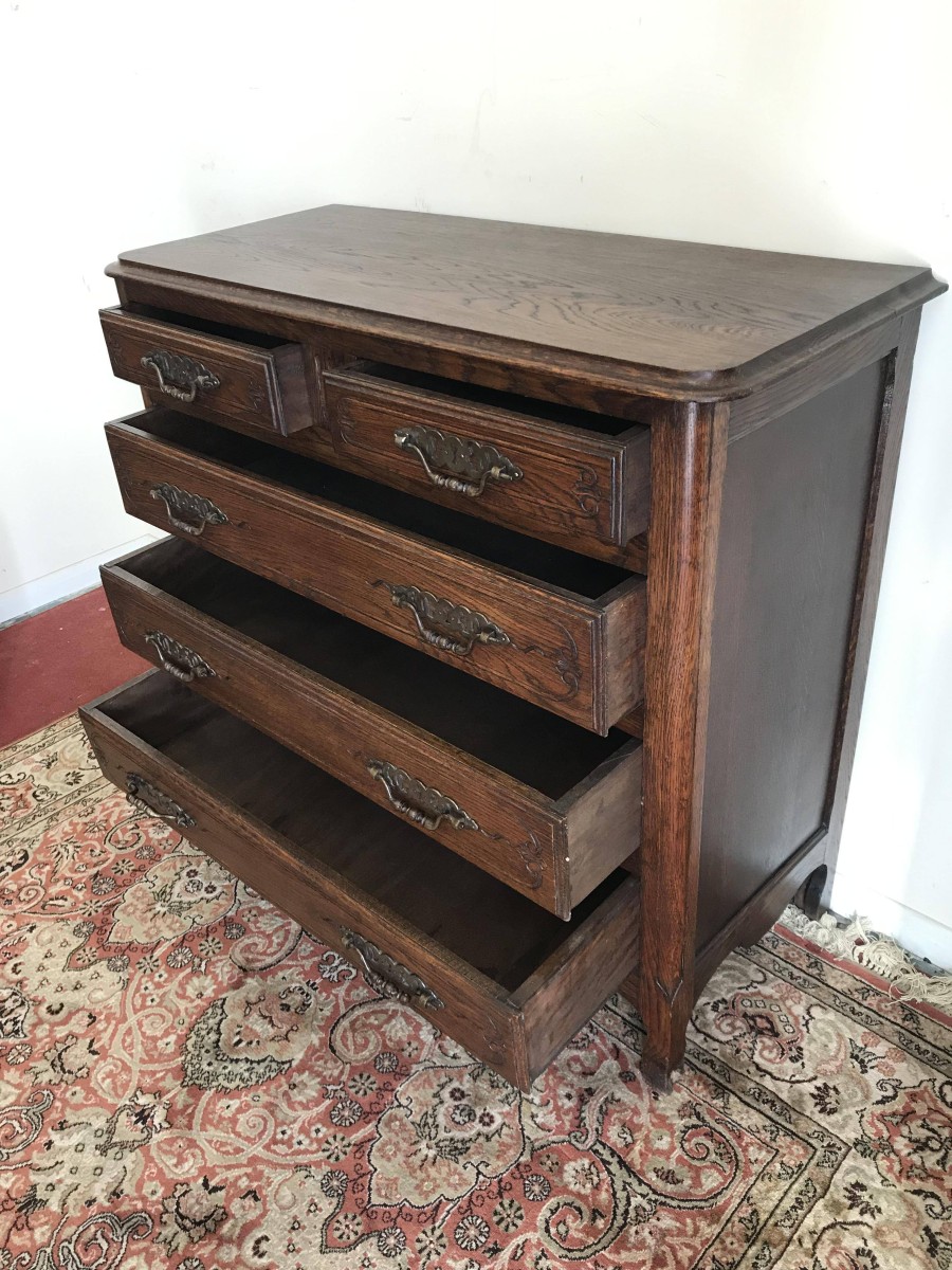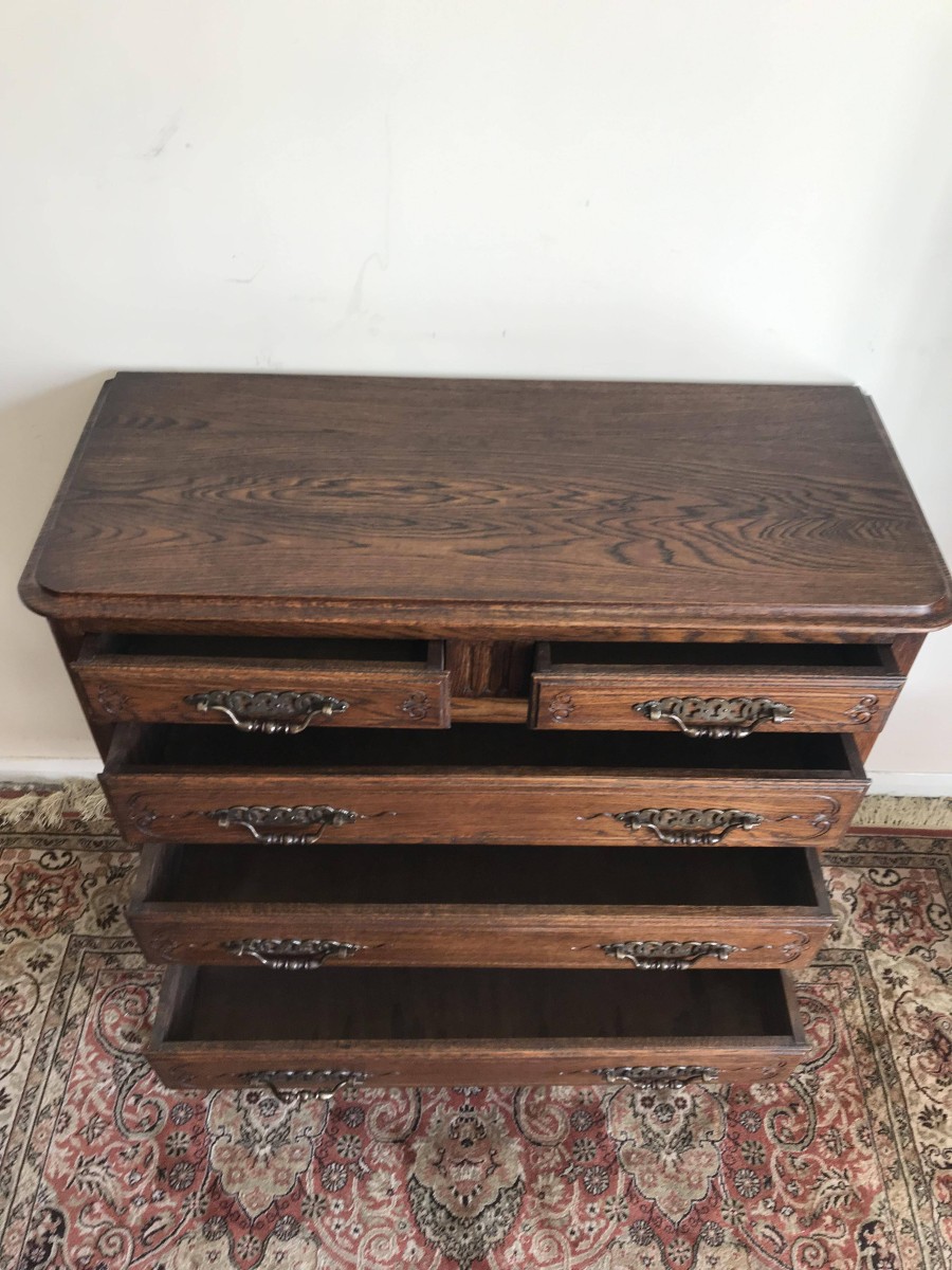 The oversailing top has rounded front corners, below are three recessed panelled carved oak drawers. Each drawer having a pair of brass handles. To the sides there are decorative carvings. Recessed panelled sides, shaped skirt with ornate central carving. this elegant chest of drawers sits on two carved cabriole legs to the front.