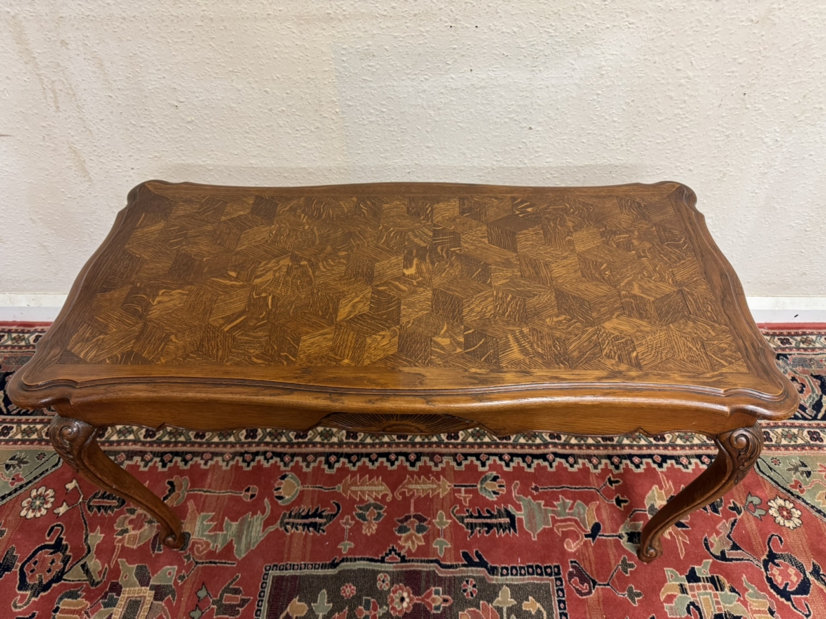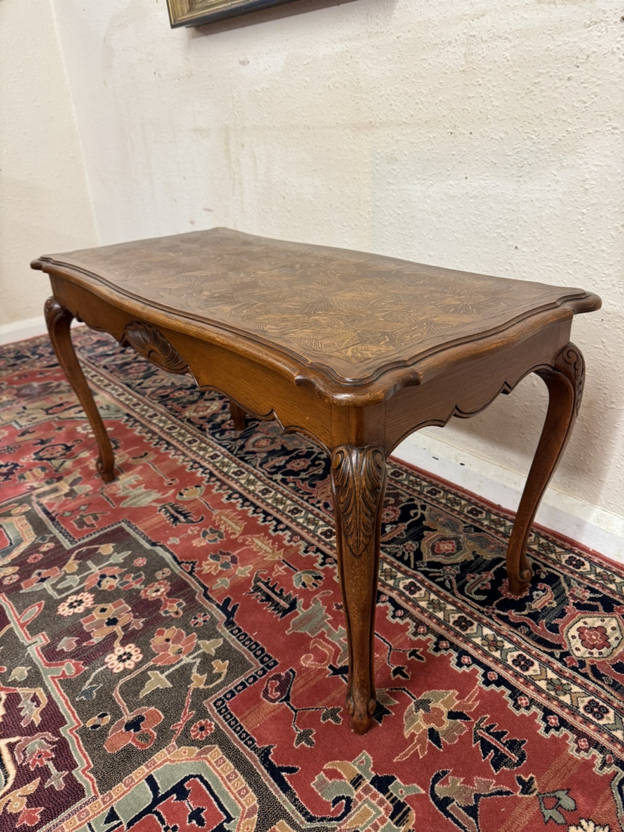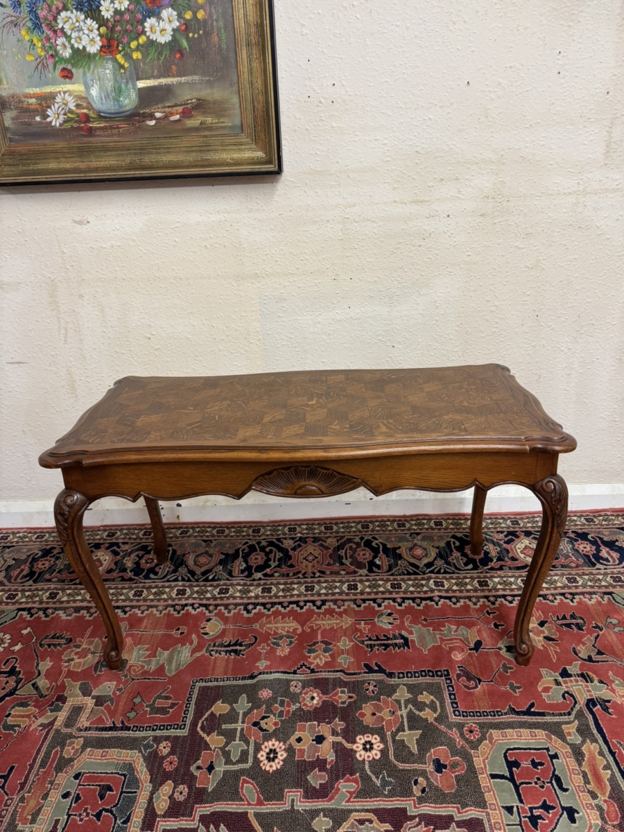 The coffee table dates circa 1950. In excellent condition, the shaped top has appealing parquetry decoration. Carvings to the sides and standing on four elegant carved cabriole shaped legs.