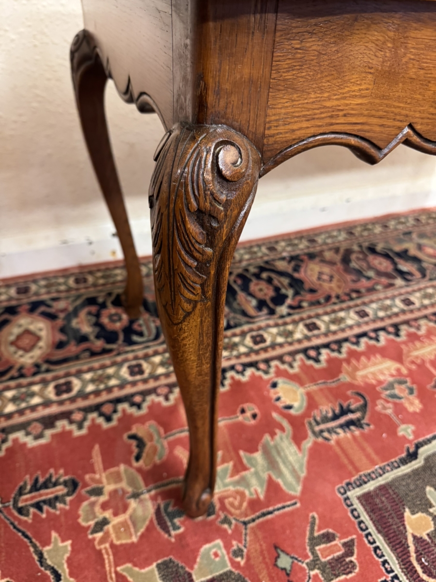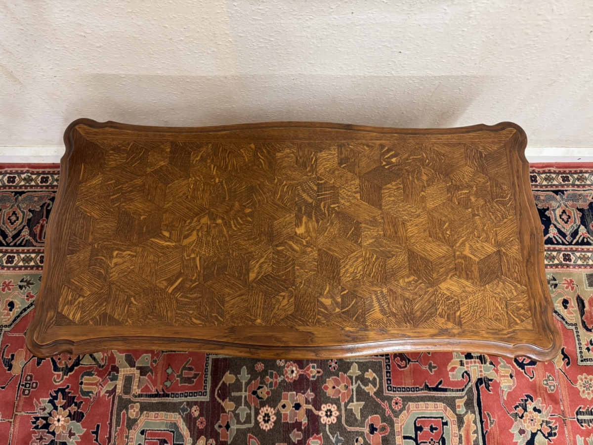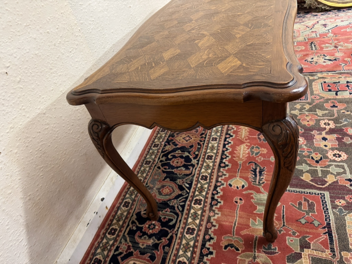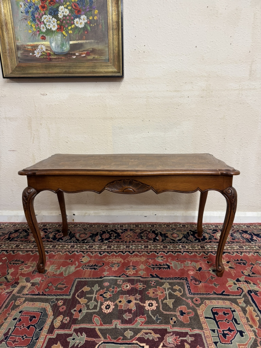 The coffee table dates circa 1950. In excellent condition, the shaped top has appealing parquetry decoration. Carvings to the sides and standing on four elegant carved cabriole shaped legs.