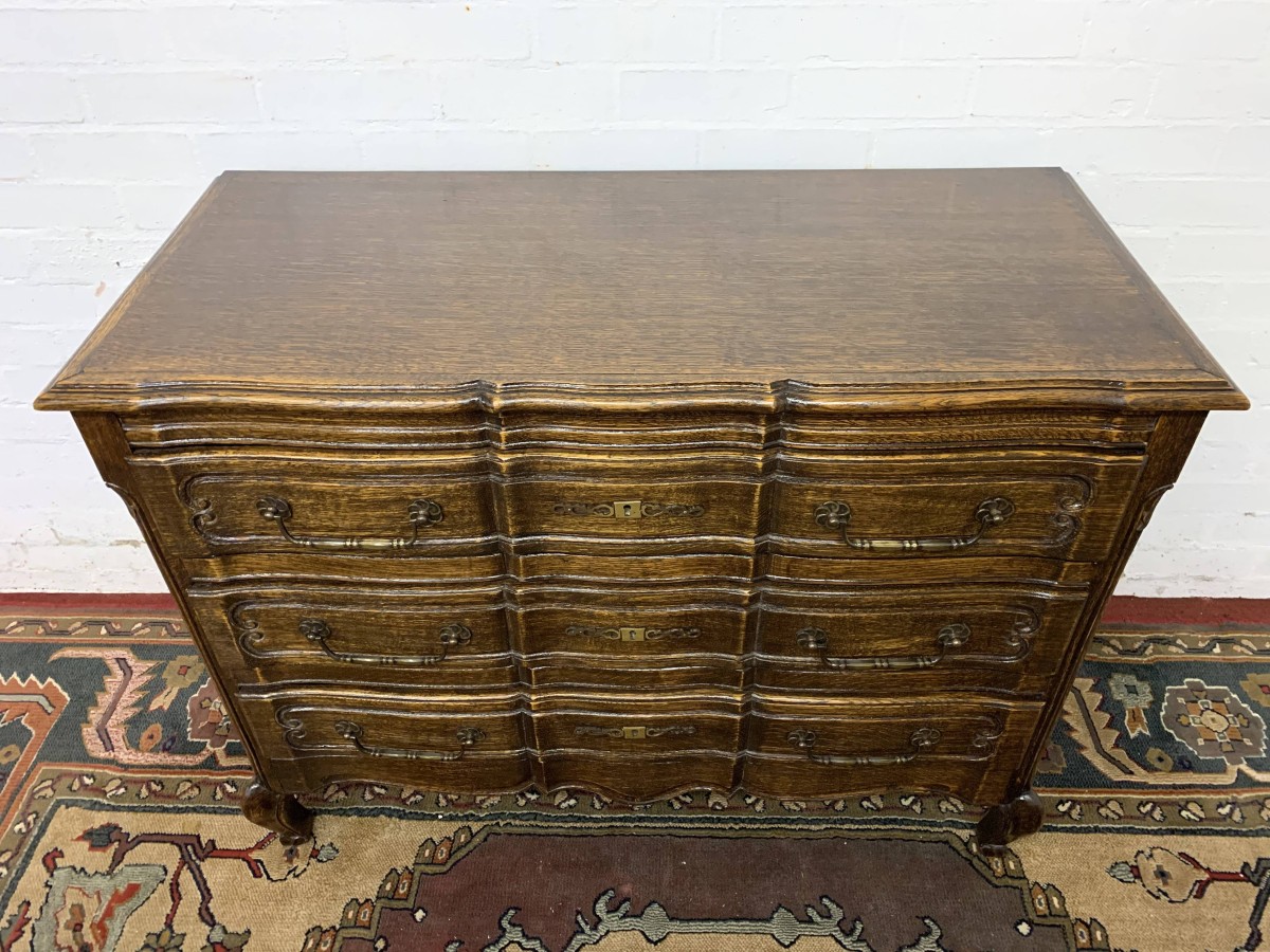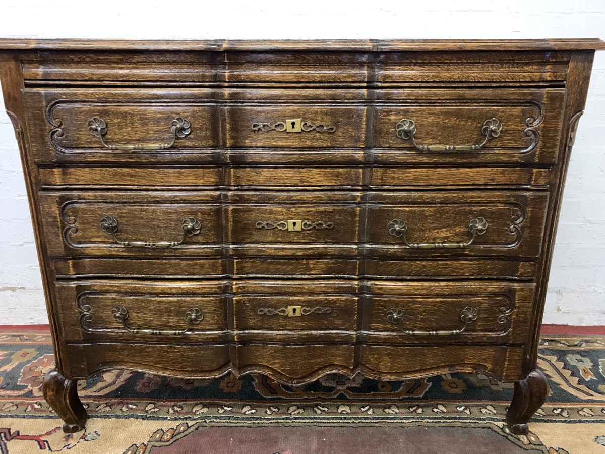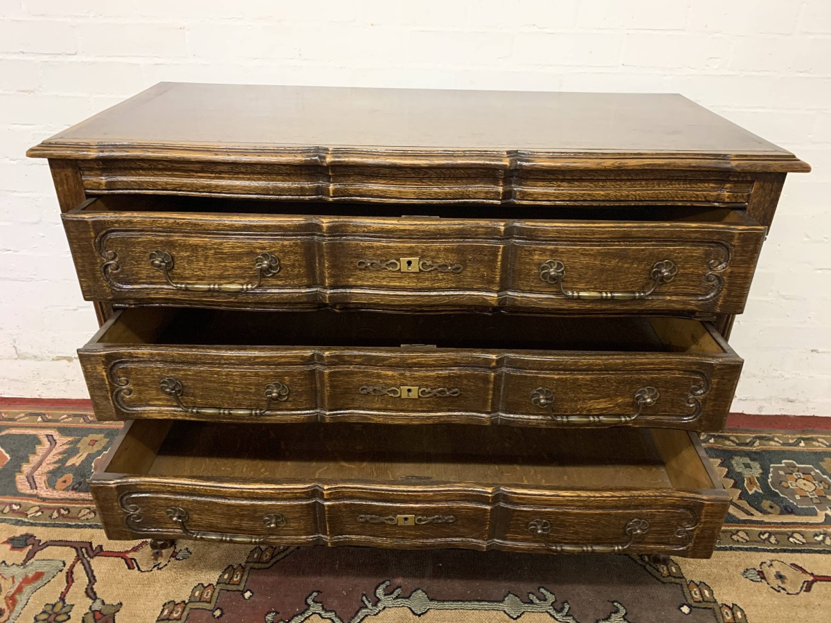 - Elegant French Serpentine Fronted Chest Of Three Long Drawers – Now Sold