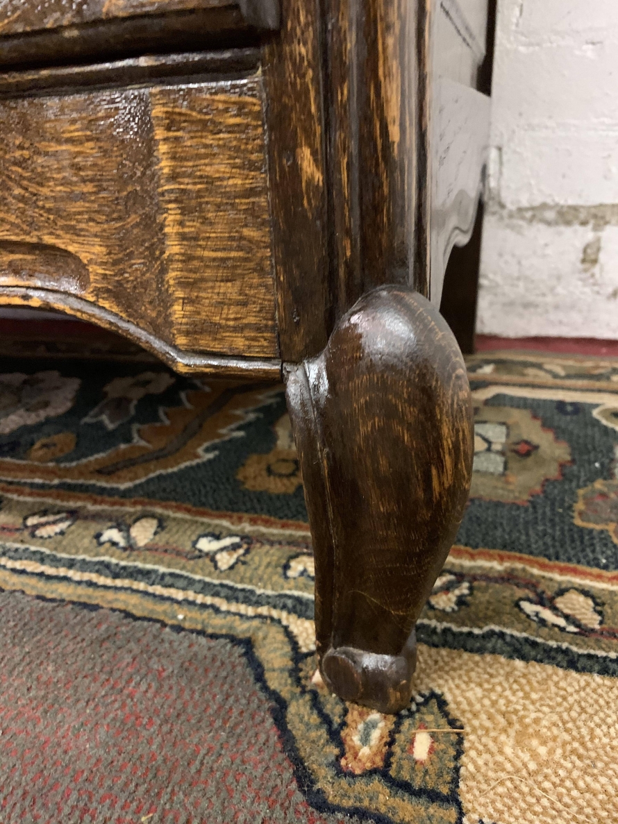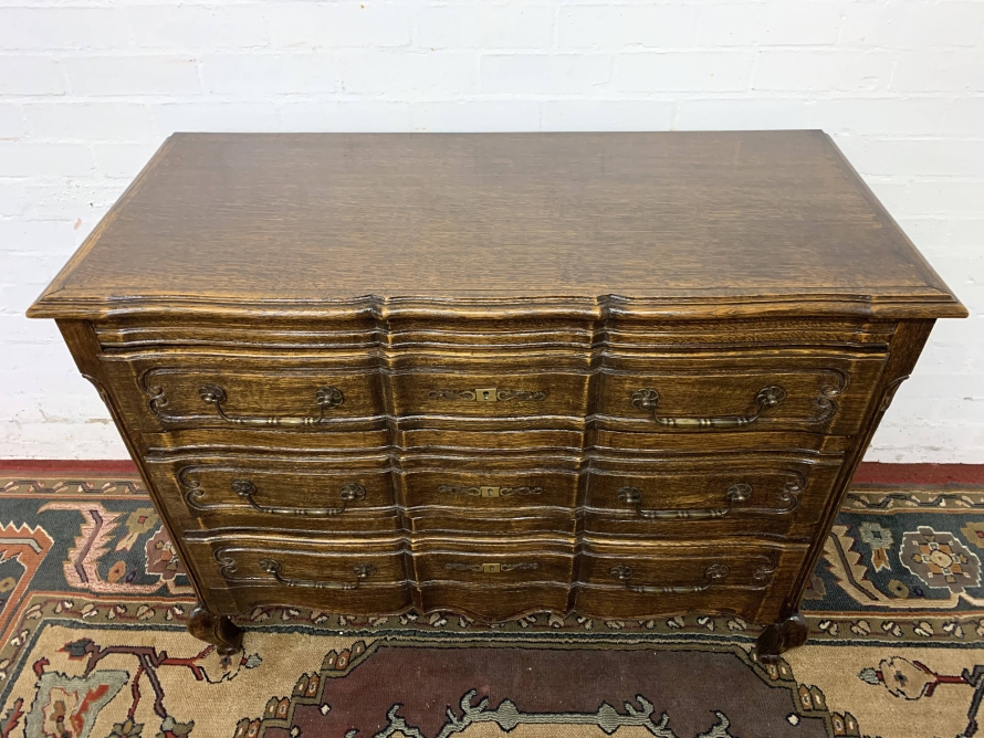 The shaped over sailing top sits above three Serpentine shaped carved drawers, each drawer having a pair of brass handles and decorative escutcheon. Recessed panelled sides, shaped skirt,this fantastic chest of drawers stands on two shaped cabriole legs to the front.